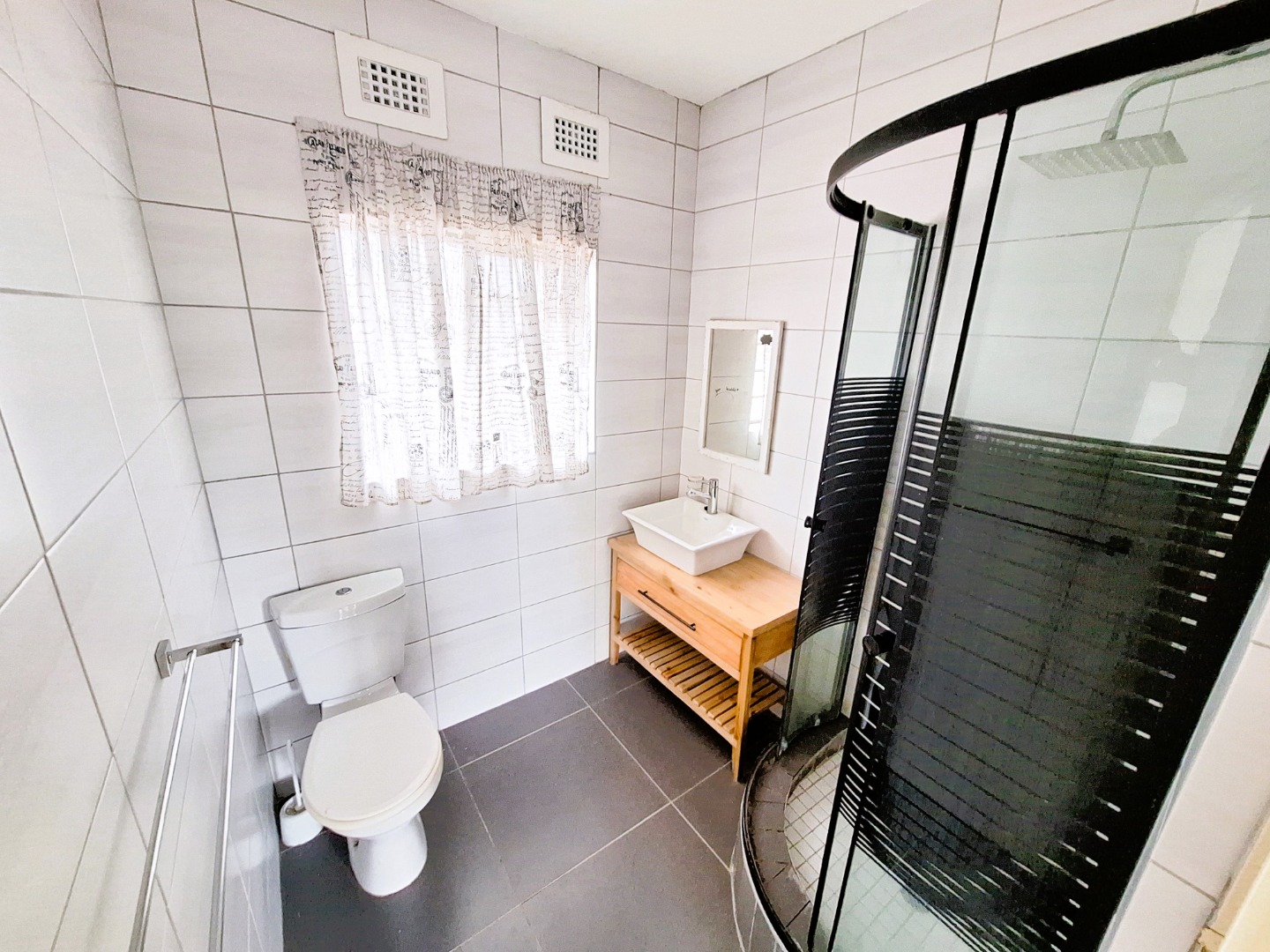 1 x Renovated Modern bathroom with shower, toilet and basin.