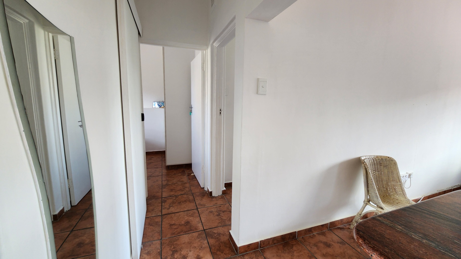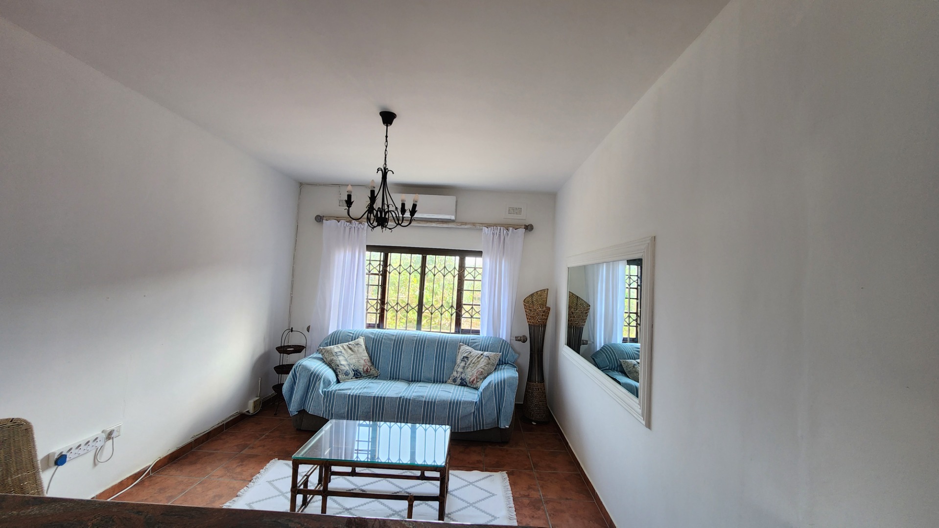 This property offers a functional open-plan layout, seamlessly connecting the kitchen and living areas. The kitchen is equipped with a modern stainless steel fridge, ample cabinet storage, and essential appliances, while the lounge area benefits from natural light and an air conditioning unit, ensuring comfort. Tiled flooring throughout provides a practical and easy-to-maintain finish.