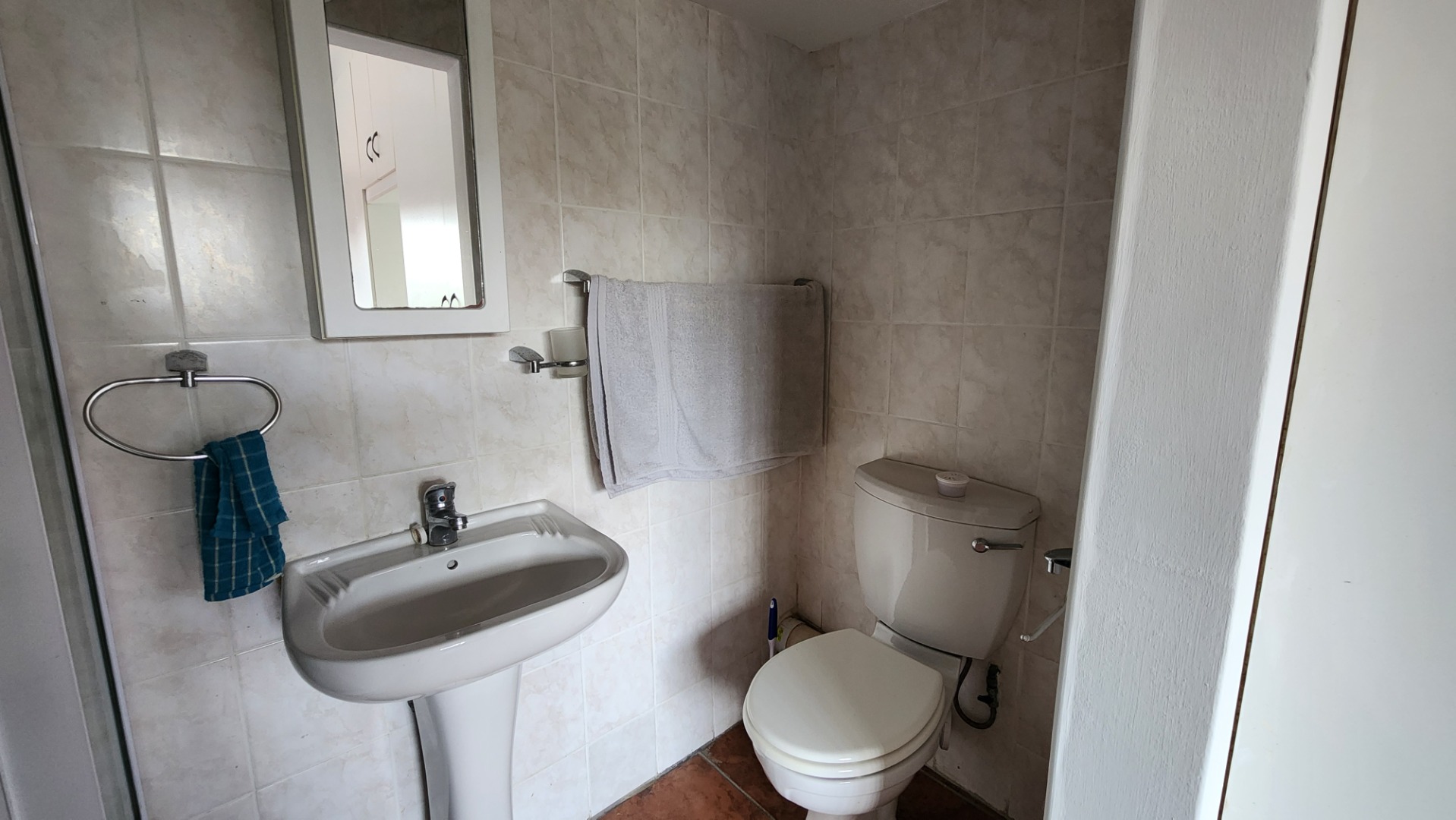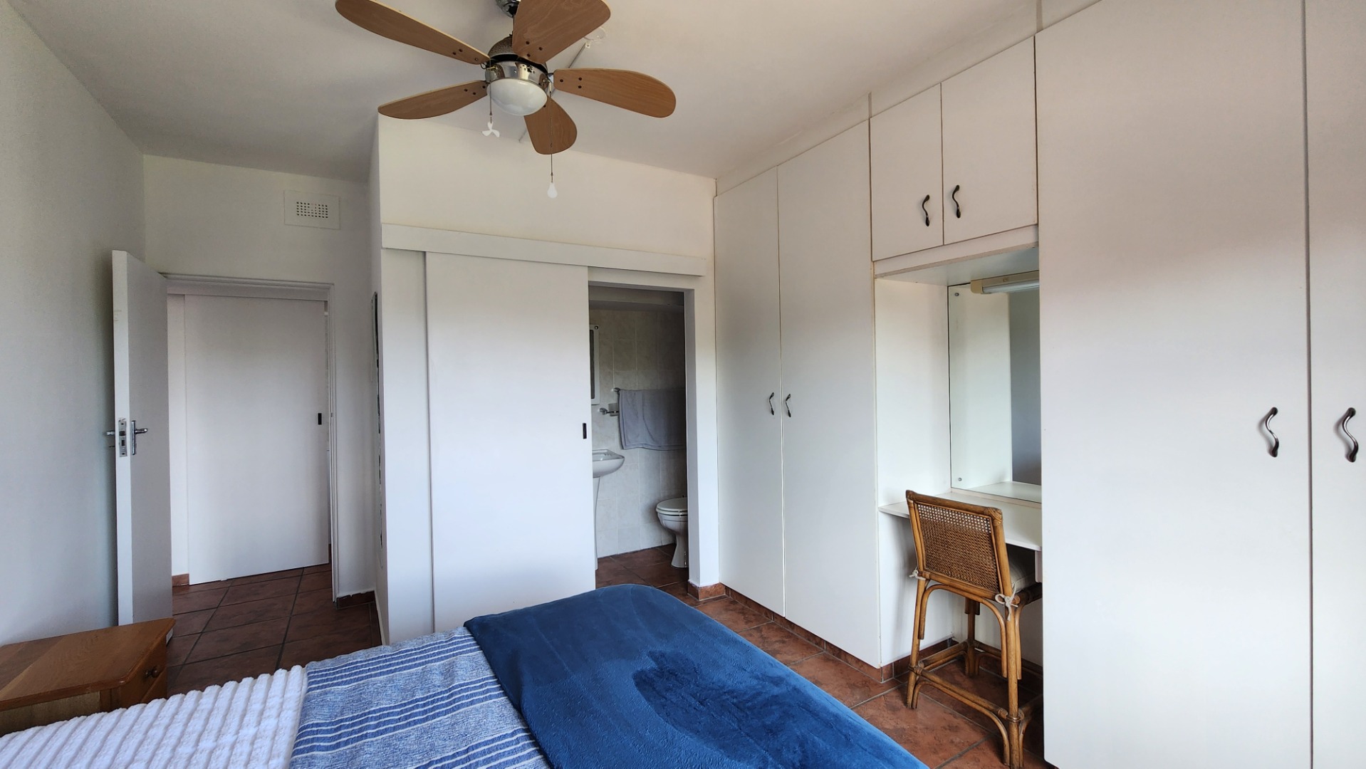 The home features two comfortable bedrooms, each designed for practicality. The main bedroom includes built-in wardrobes and an integrated vanity area, offering convenient storage solutions. Both bedrooms are fitted with ceiling fans and benefit from natural light, with one bedroom also featuring an en-suite bathroom for added privacy and convenience. The additional bathroom is compact and functional, featuring tiled walls and a walk-in shower.