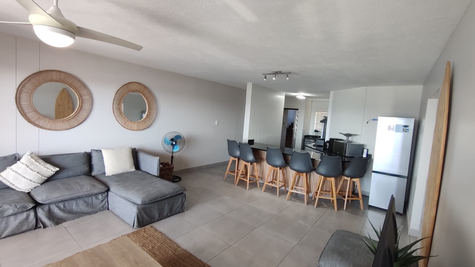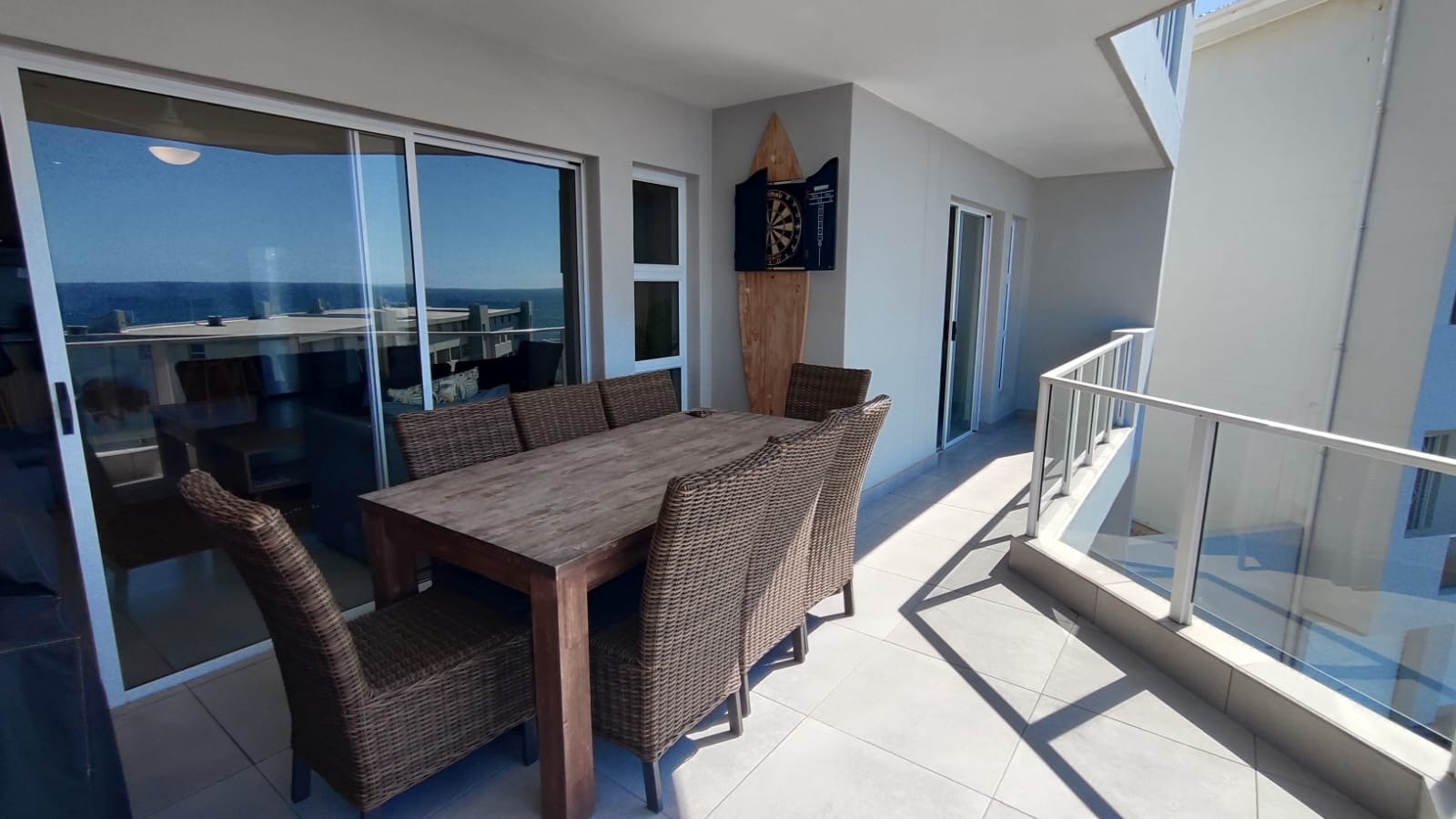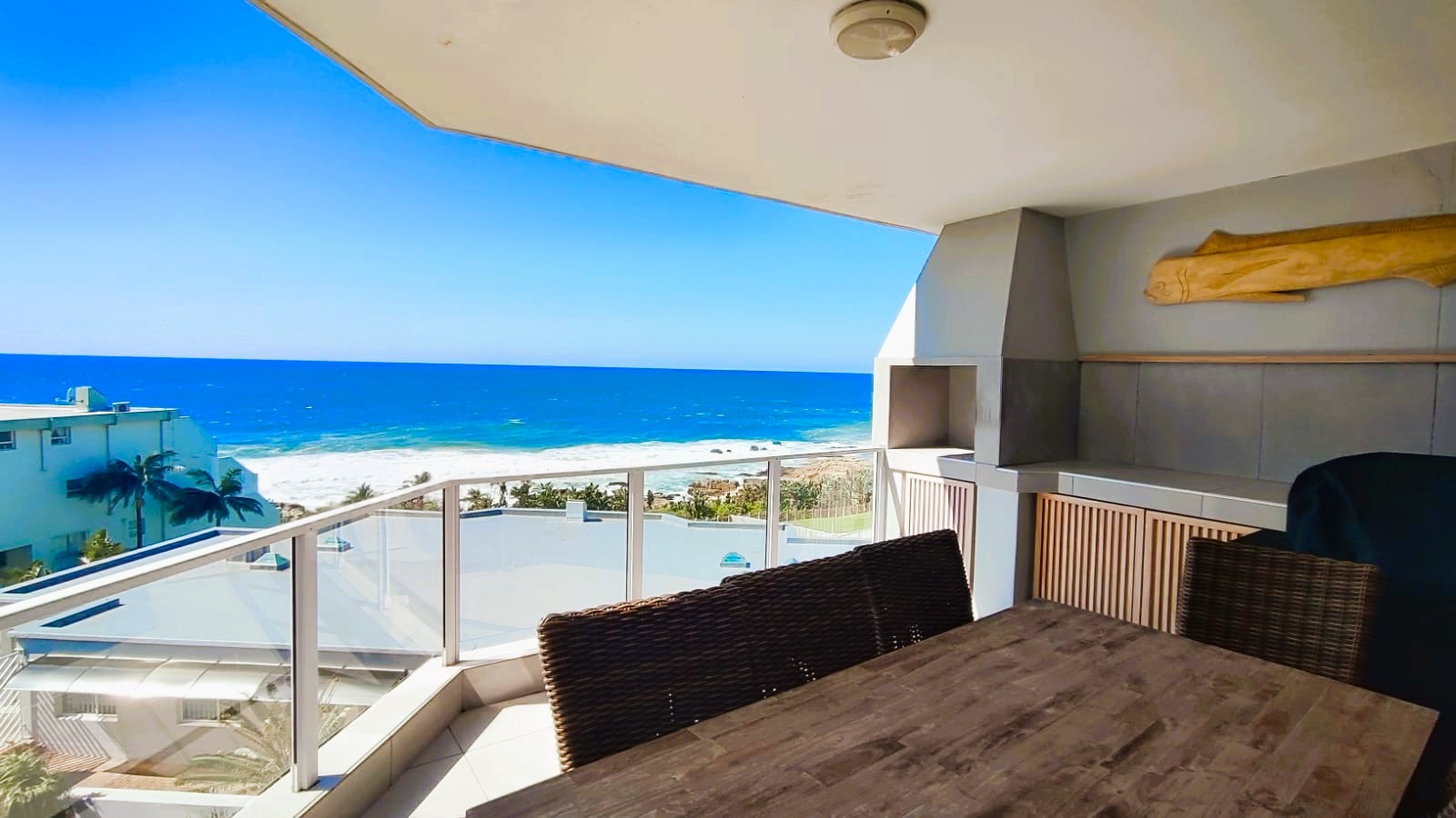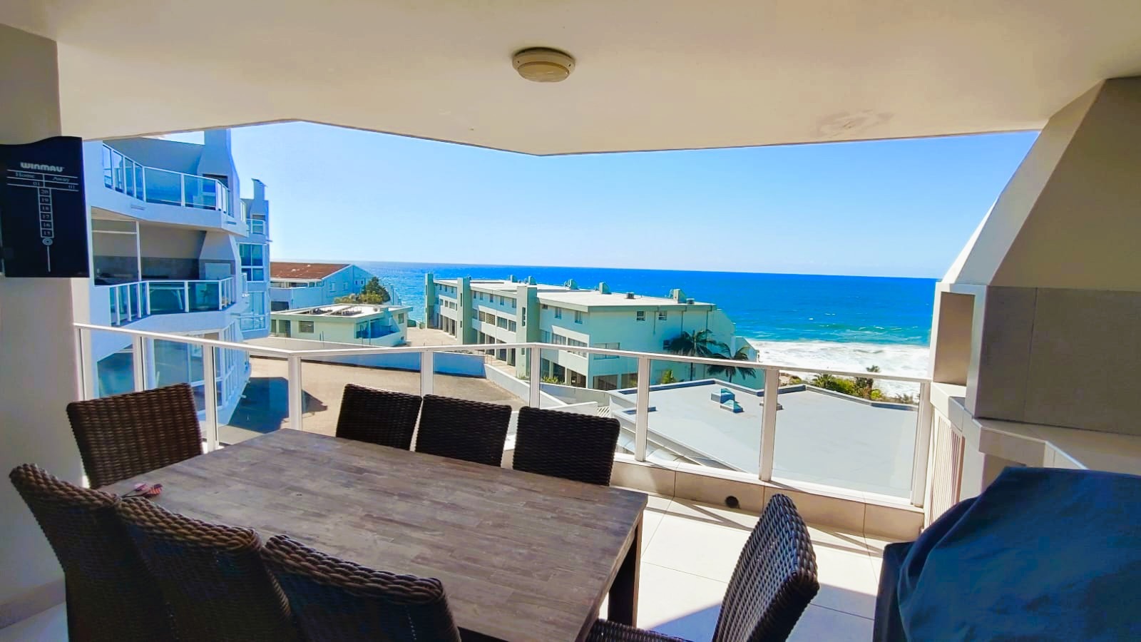 A defining feature of this property is the expansive private balcony, which walks from the spacious main living area, and offers breathtaking panoramic Indian ocean views. Equipped with modern glass railings that ensure an unobstructed view. darts. The balcony allows gas braaiing and there is also a communal braai for wood/charcoal in the swimming pool area. This outdoor oasis is perfect for entertaining and enjoying the stunning coastal scenery.