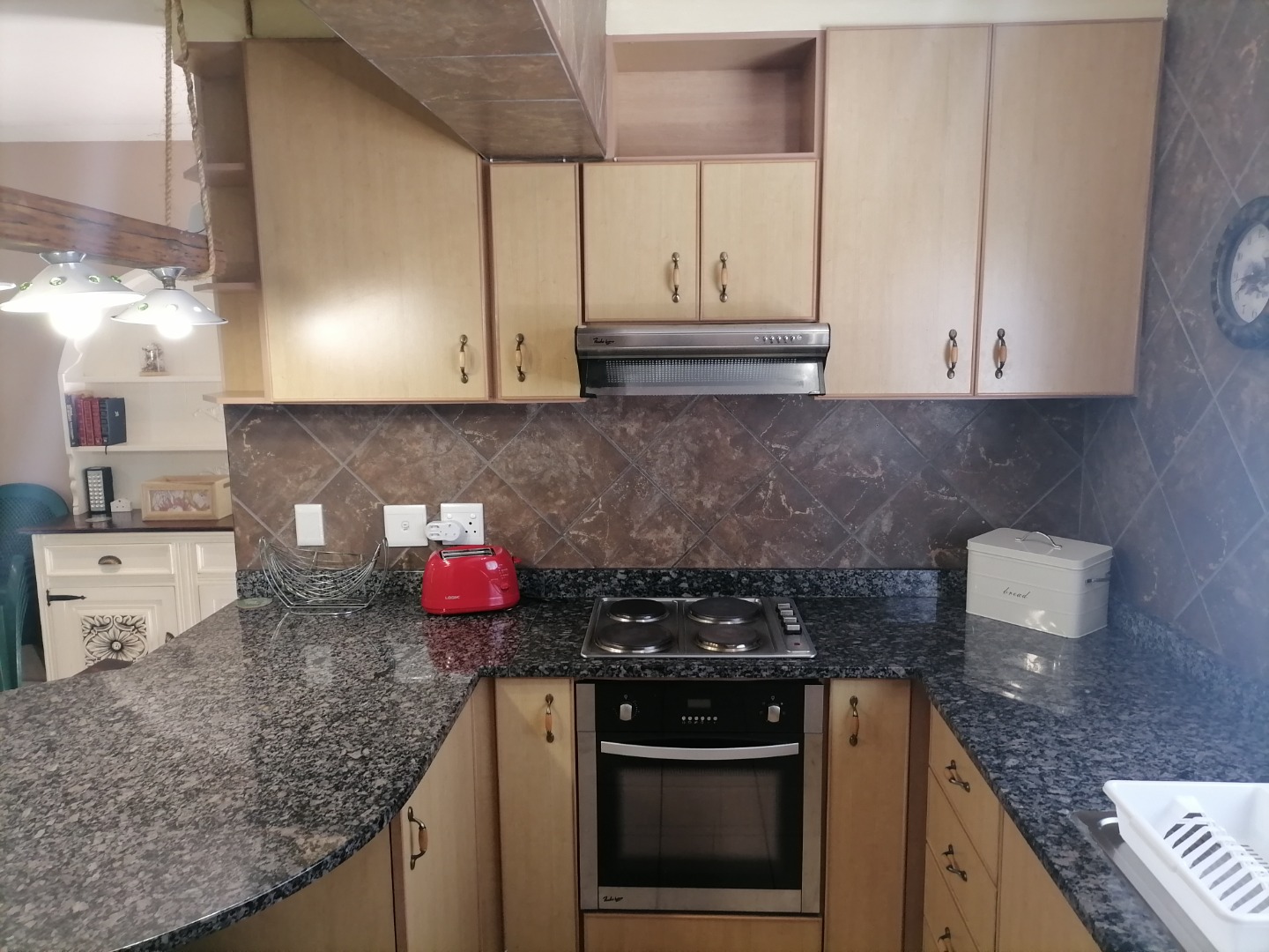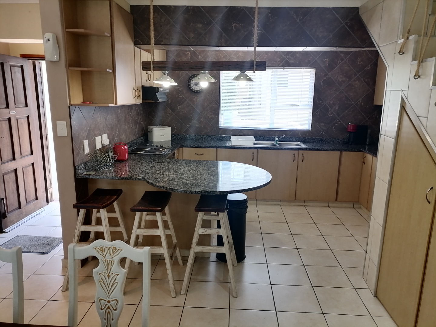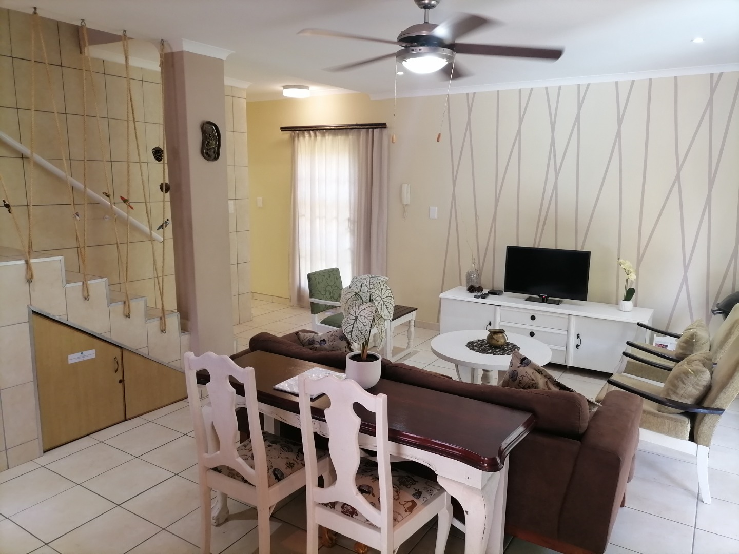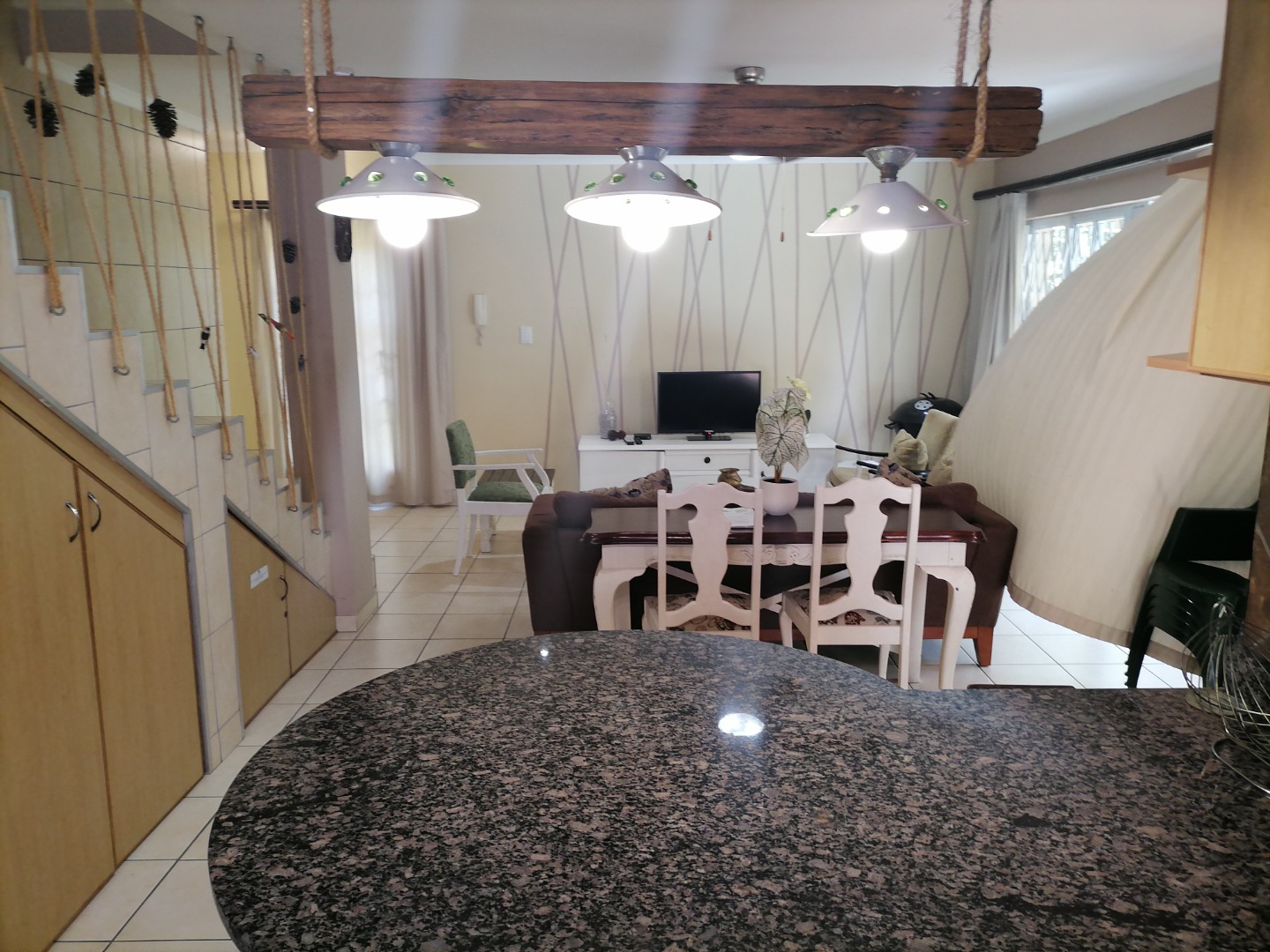 Step inside to an open-plan living and dining area, featuring durable tiled flooring throughout and ample natural light. The functional kitchen is equipped with light wood cabinetry, dark granite countertops, an integrated hob, and a practical breakfast bar, perfect for casual meals. The layout includes a dedicated lounge and dining room, ensuring comfortable spaces for relaxation and entertaining. Integrated under-stair storage adds to the home's efficiency, while ceiling fans provide comfort.