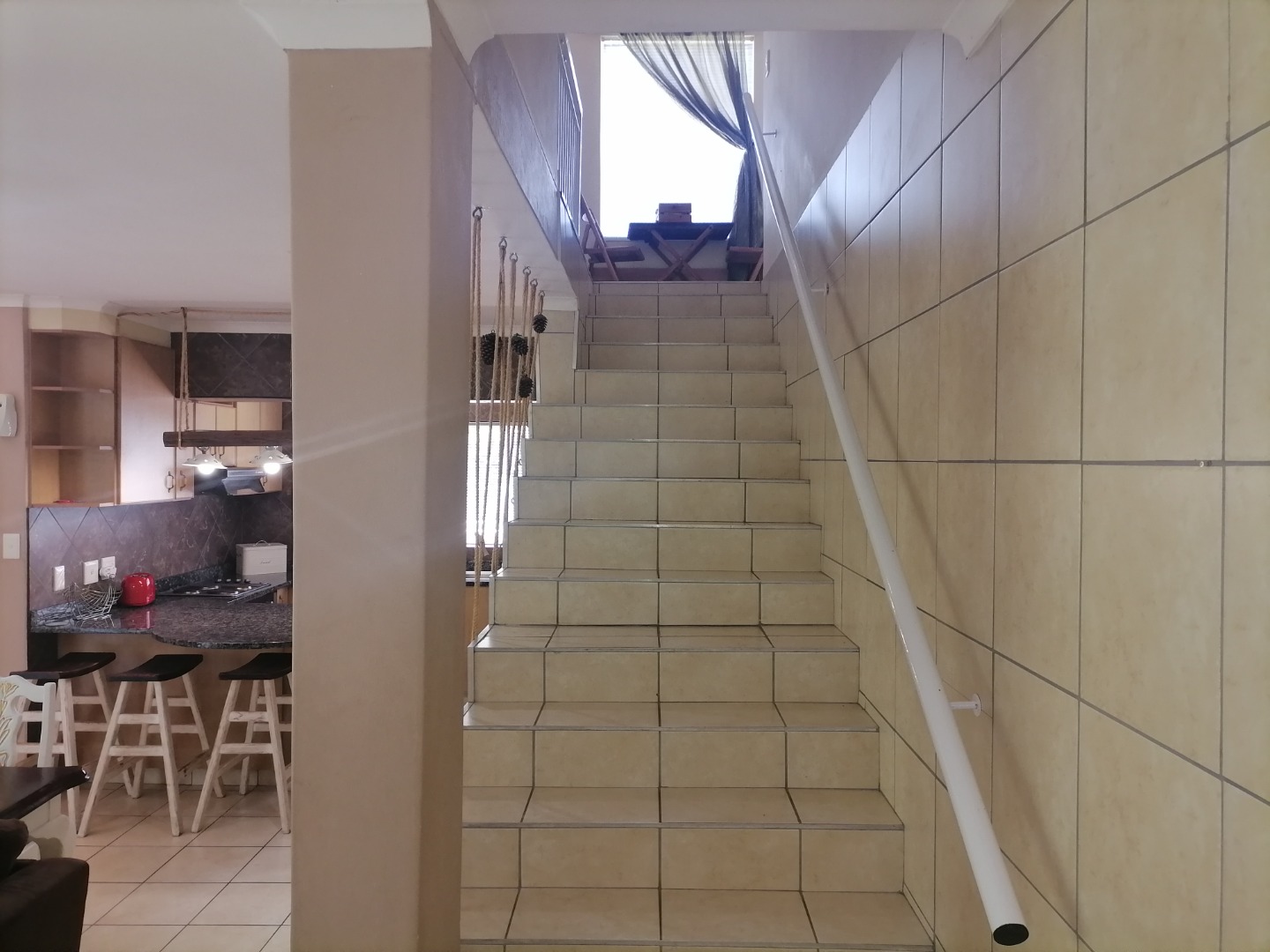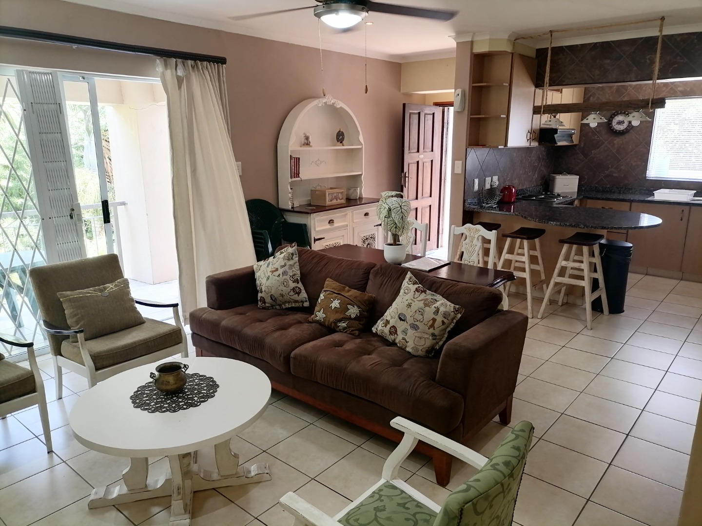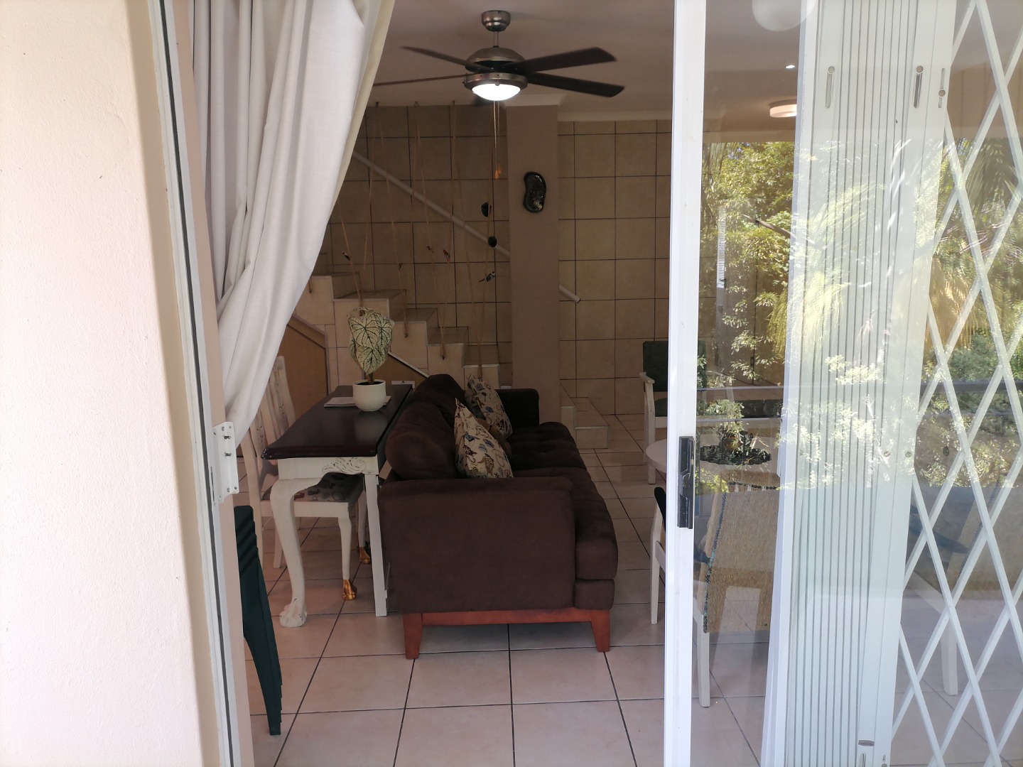 Step inside to an open-plan living and dining area, featuring durable tiled flooring throughout and ample natural light. The functional kitchen is equipped with light wood cabinetry, dark granite countertops, an integrated hob, and a practical breakfast bar, perfect for casual meals. The layout includes a dedicated lounge and dining room, ensuring comfortable spaces for relaxation and entertaining. Integrated under-stair storage adds to the home's efficiency, while ceiling fans provide comfort.