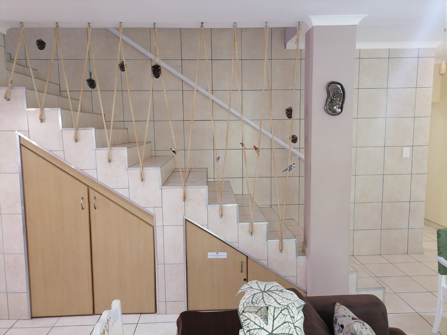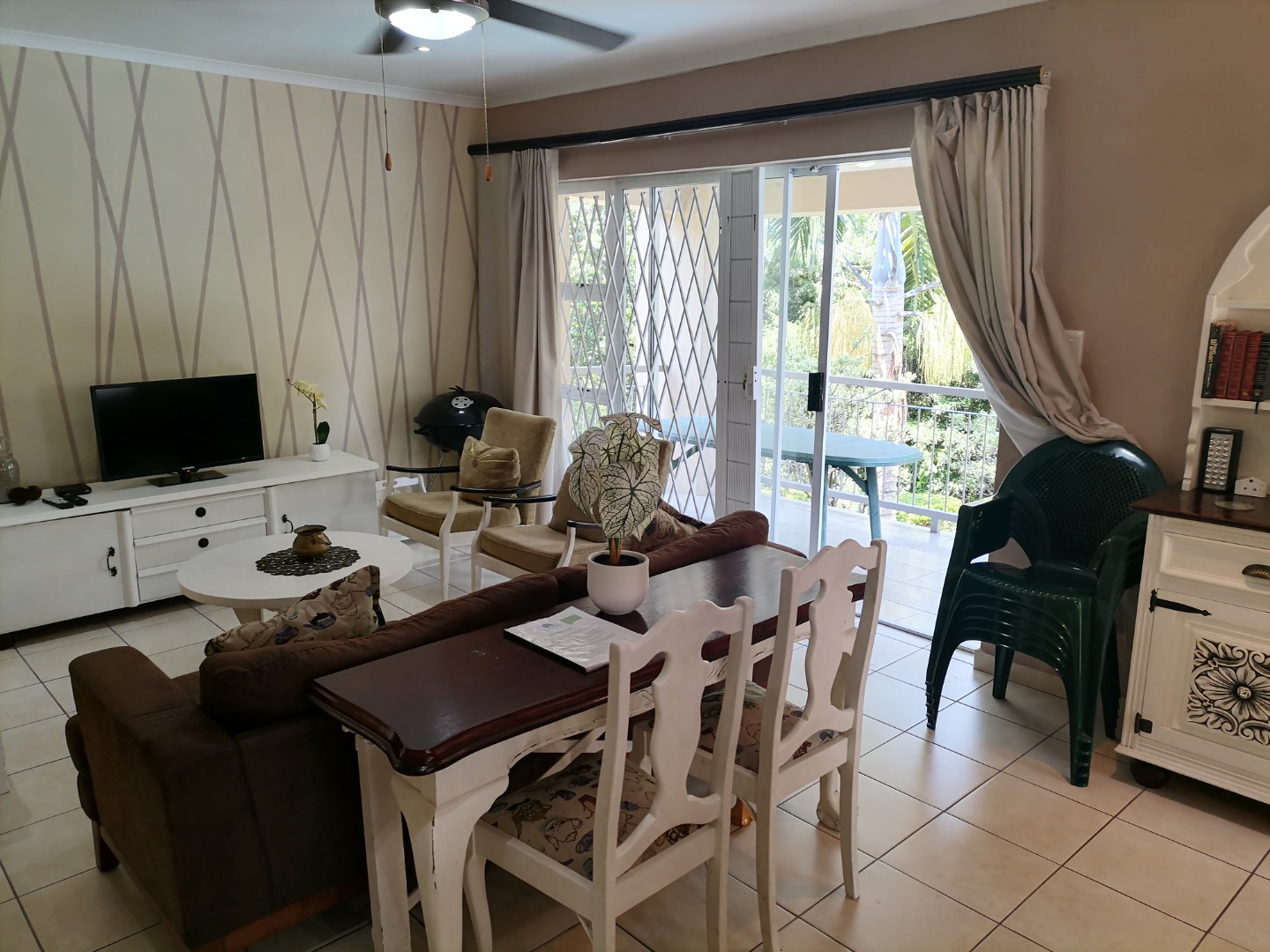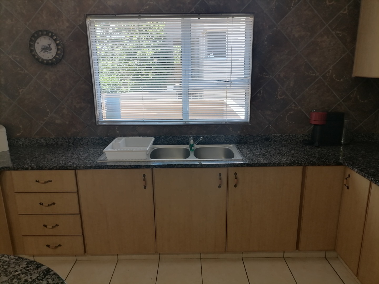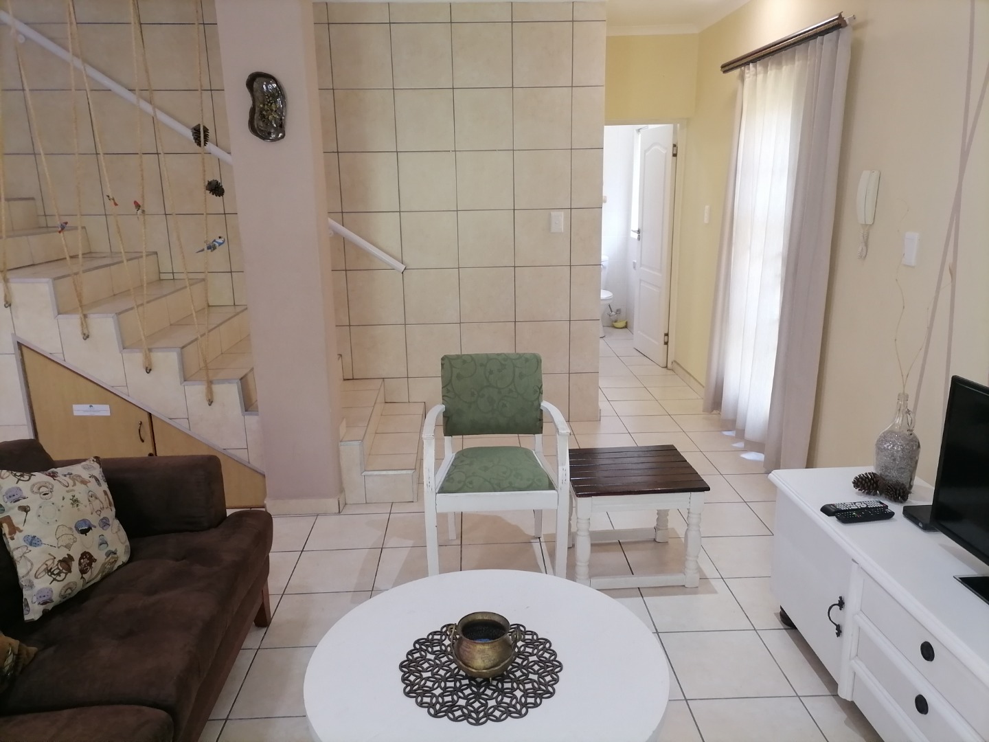 Step inside to an open-plan living and dining area, featuring durable tiled flooring throughout and ample natural light. The functional kitchen is equipped with light wood cabinetry, dark granite countertops, an integrated hob, and a practical breakfast bar, perfect for casual meals. The layout includes a dedicated lounge and dining room, ensuring comfortable spaces for relaxation and entertaining. Integrated under-stair storage adds to the home's efficiency, while ceiling fans provide comfort.