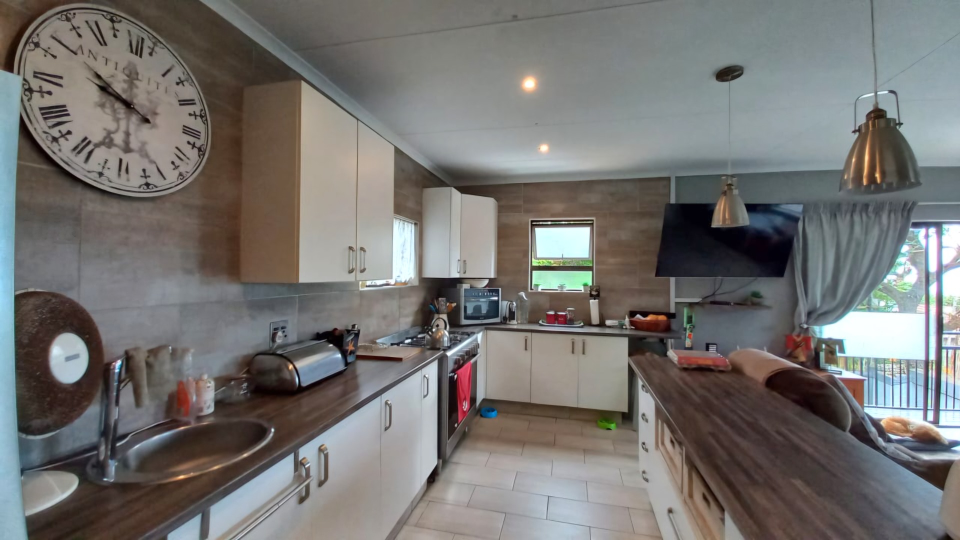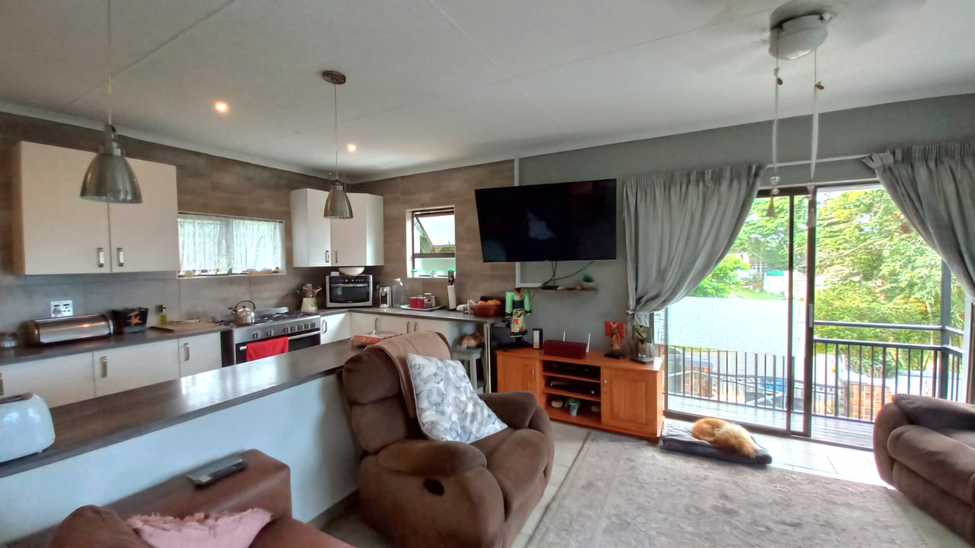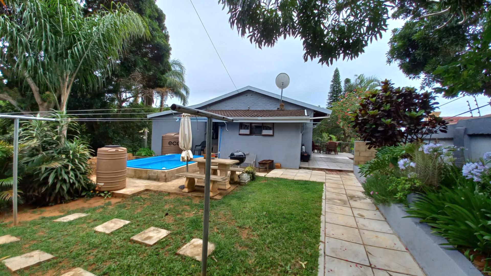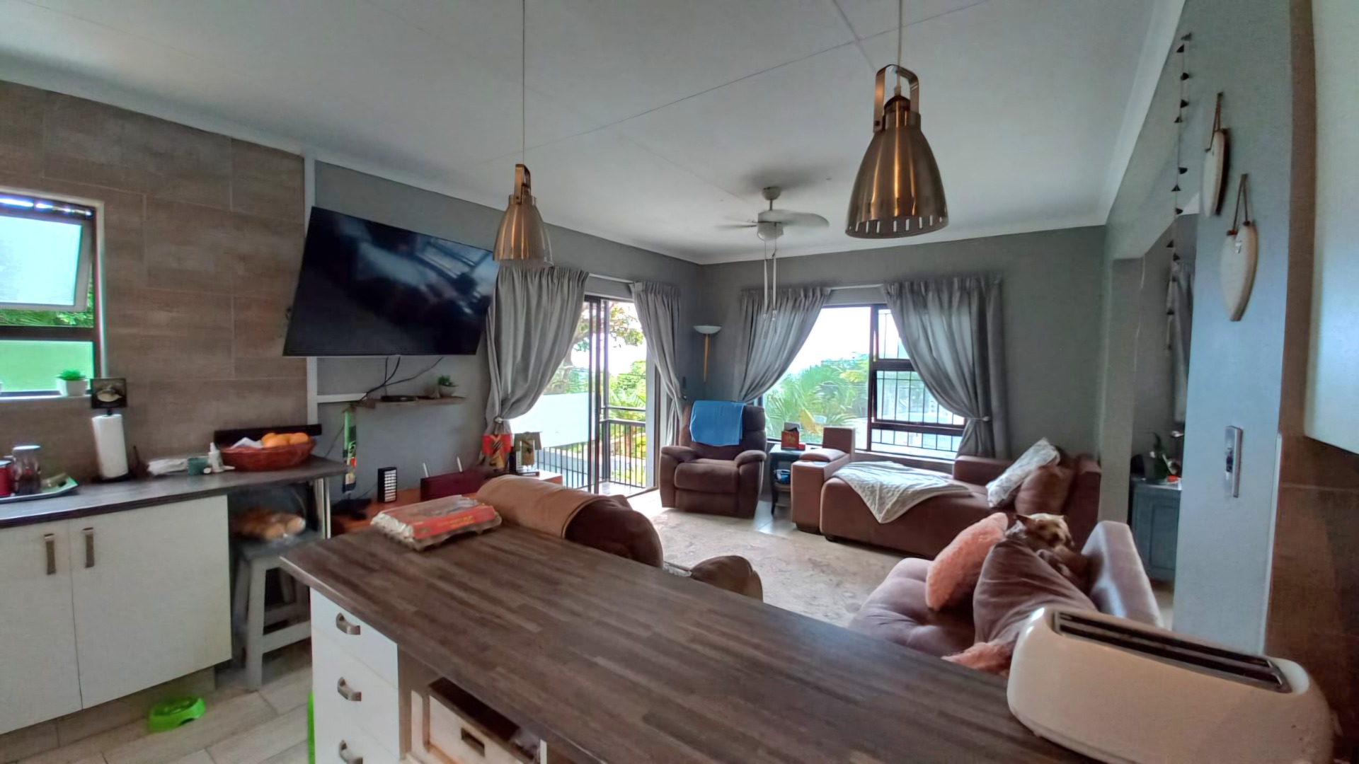 This lovely 4-bedroom home in Ramsgate welcomes you with its modern, two-story design and light grey exterior, beautifully framed by lush tropical landscaping. A spacious concrete driveway leads to a double garage, providing ample parking for your vehicles. Inside, you'll find a wonderfully open-plan living area that just feels right. The modern kitchen, featuring white cabinetry, dark wood-look countertops, and stainless steel appliances, flows seamlessly into the lounge and dining spaces, complete with a handy kitchen island/breakfast bar. Large sliding doors invite natural light and connect you to the outdoors, perfect for enjoying the coastal breeze. The home offers four comfortable bedrooms and two well-appointed bathrooms, including a convenient ensuite, ensuring everyone has their own private space. Step outside to discover your private oasis: a refreshing swimming pool and an inviting outdoor patio, perfect for entertaining or simply relaxing. From the upper-level balcony, you can catch glimpses of the distant ocean, adding a special touch to your coastal lifestyle. The generous 1205 sqm erf size provides plenty of room to enjoy the established tropical garden. Plus, there's a flatlet, offering fantastic flexibility for guests or potential rental income. For your peace of mind, the property is equipped with an alarm system, and it's pet-friendly too! This fantastic home is nestled in a charming coastal and suburban area within Margate, South Africa. It’s the perfect spot to embrace a relaxed beach lifestyle, with the ocean just a stone's throw away. Key Features: * 4 Bedrooms, 2 Bathrooms (1 En-suite) * Open-plan Living & Modern Kitchen * Double Garage & 3 Parking Spaces * Private Swimming Pool * Lush Tropical Garden * Outdoor Patio & Balcony * Distant Ocean Views * Alarm System * Pet-Friendly * Includes a Flatlet