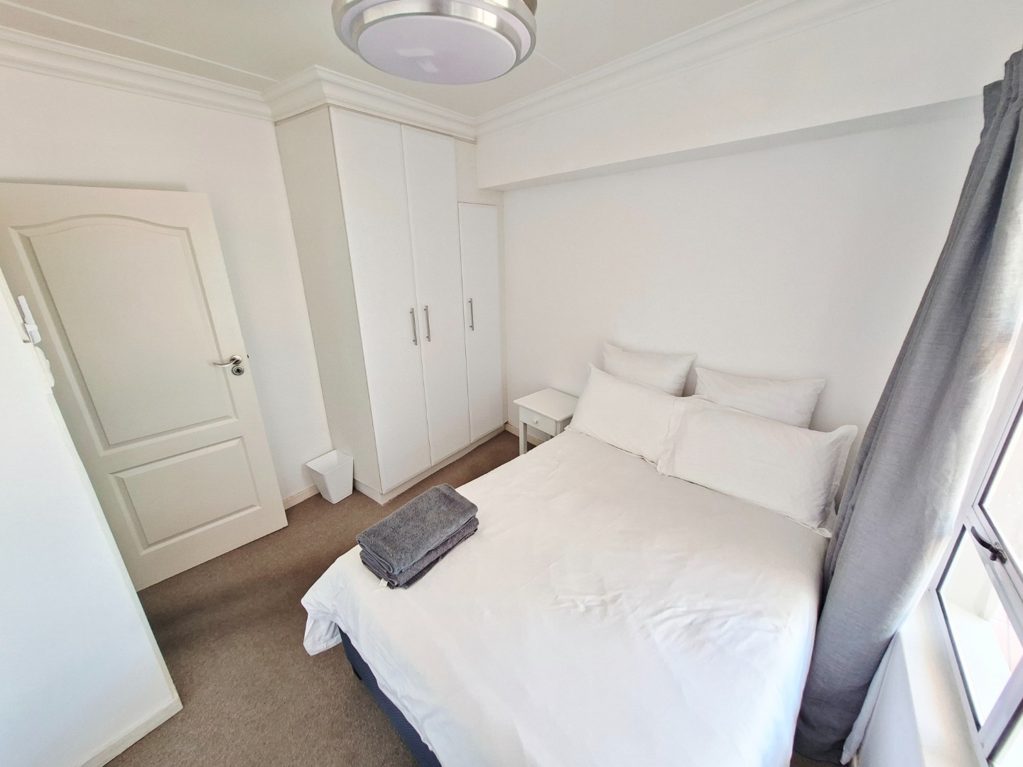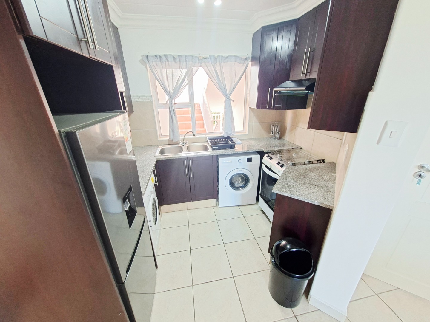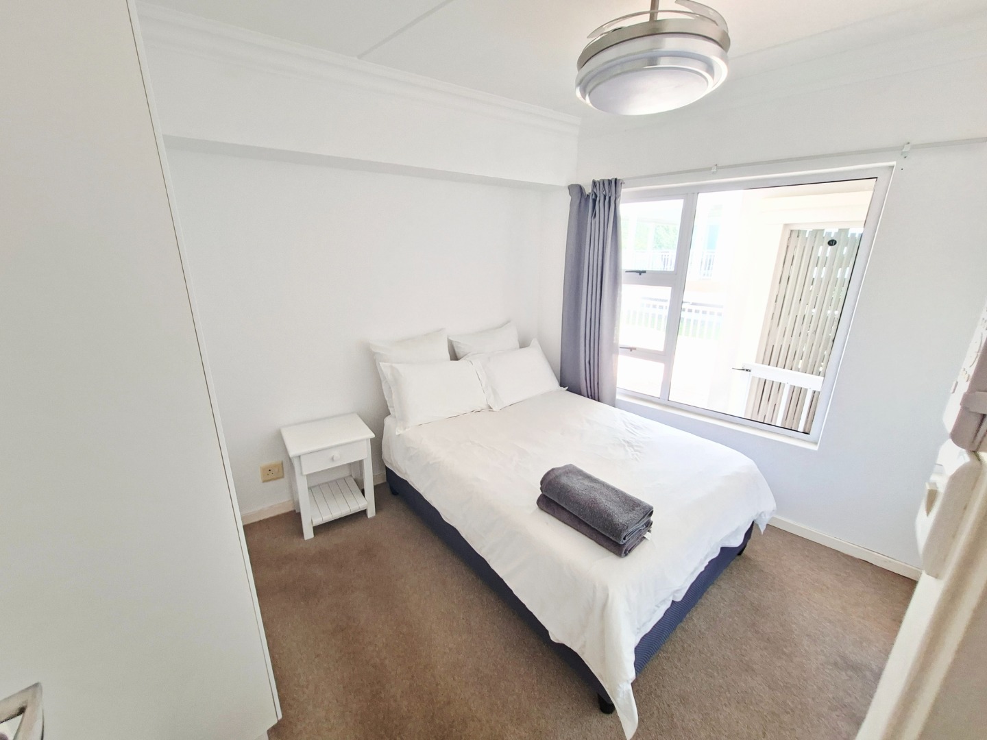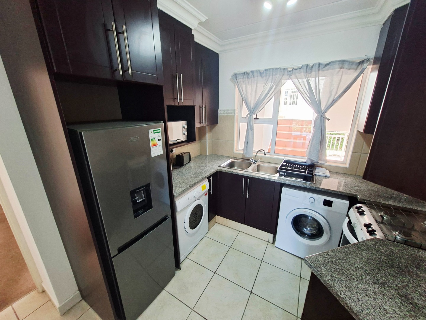 The thoughtfully furnished living space seamlessly connects to a spacious tiled balcony through large sliding glass doors, offering a delightful sea view and enhancing indoor-outdoor flow. The modern, compact kitchen is efficiently designed with dark wood cabinetry, granite countertops, and equipped with essential appliances including a fridge, gas stove with oven, washing machine, and tumble dryer. This unit boasts two comfortable bedrooms, with the main bedroom featuring an en-suite bathroom and direct access to your patio. The second well-appointed bathroom caters for the guest bedroom.