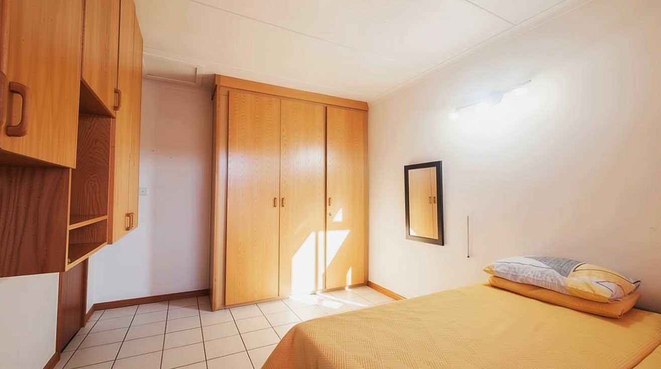 The residence comprises two comfortable bedrooms and a well-appointed bathroom. Both bedrooms benefit from the property's prime location, offering scenic views and maintaining the consistent tiled flooring found throughout the apartment.