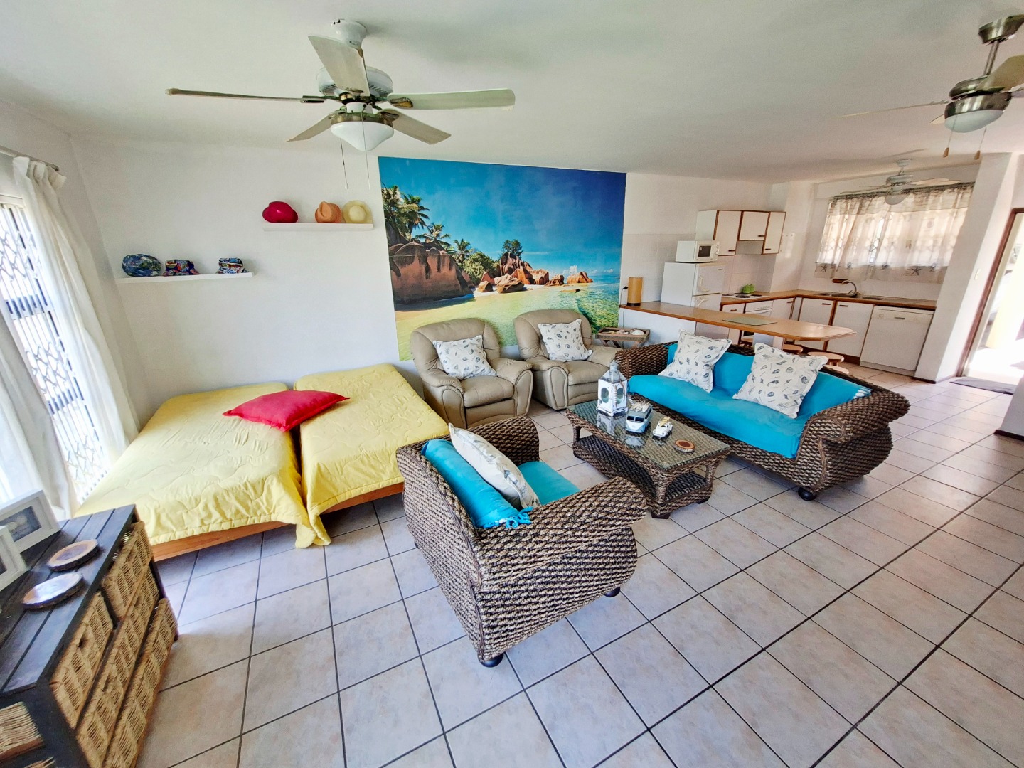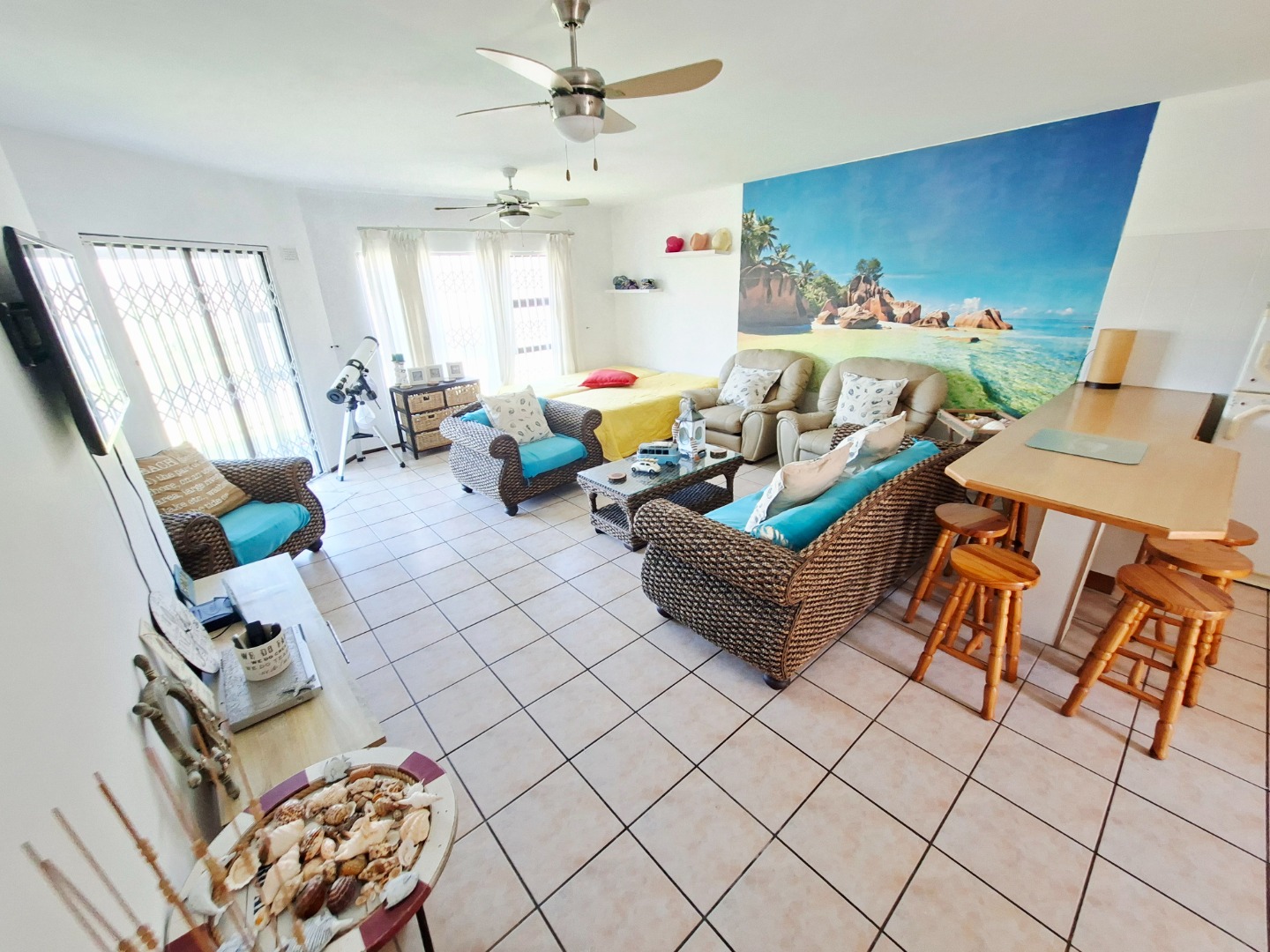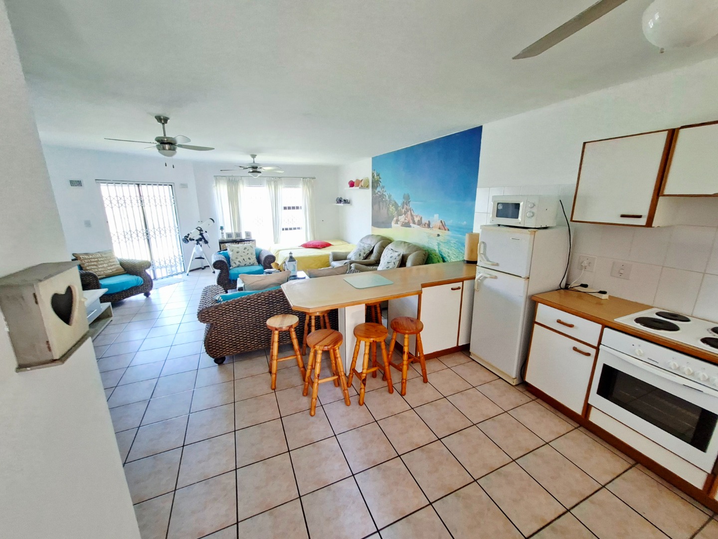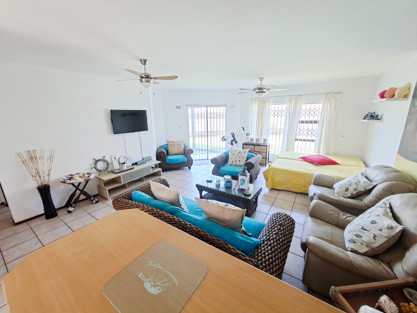 Step inside to an open-plan living area, thoughtfully designed with a vibrant tropical/beach theme, complete with tiled flooring and ceiling fans for comfort. The functional kitchen features essential appliances, ample counter space, and a convenient breakfast bar, making meal preparation a breeze. The lounge area is bright and airy, offering multiple seating options and a welcoming atmosphere. The lounge flows into your enclosed patio area, allowing for seamless entertainment.