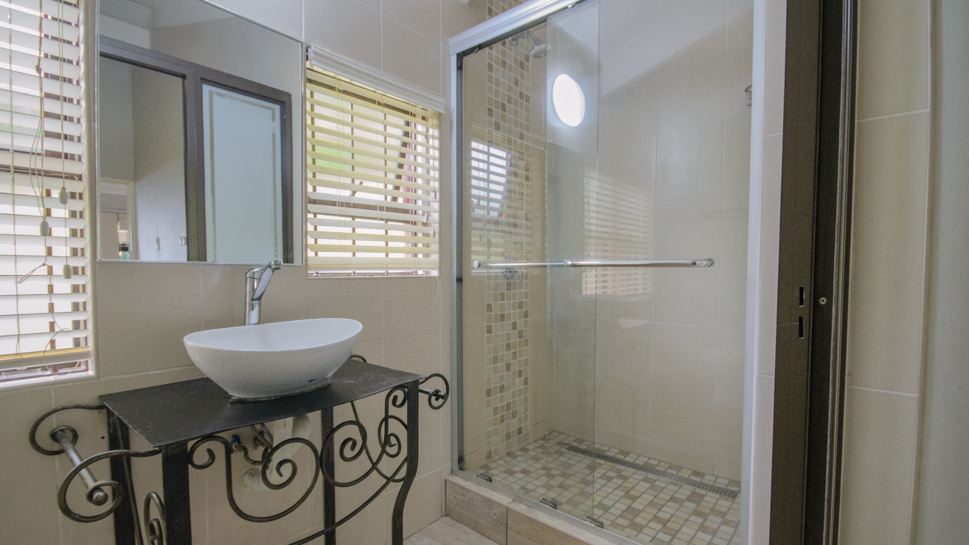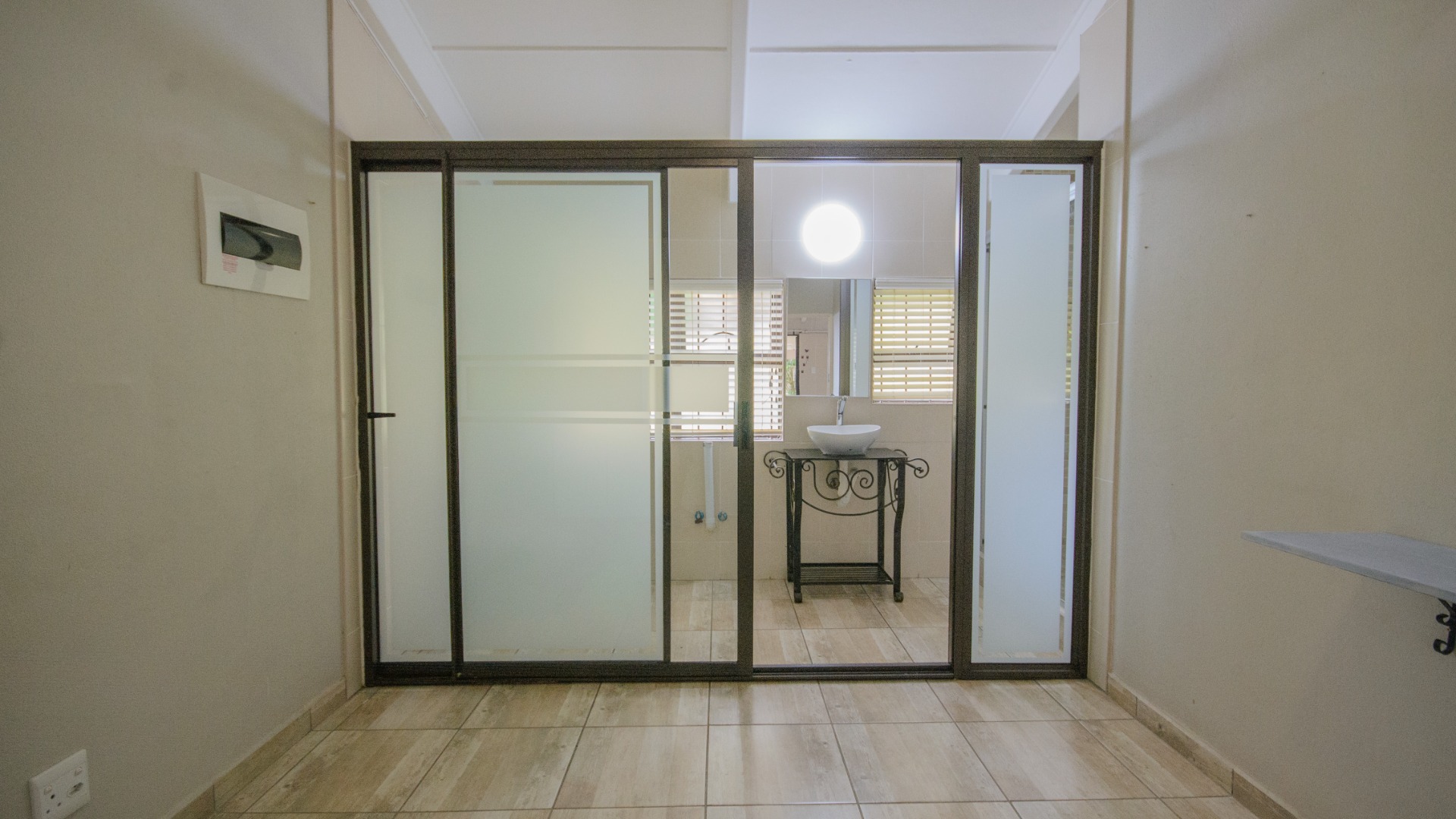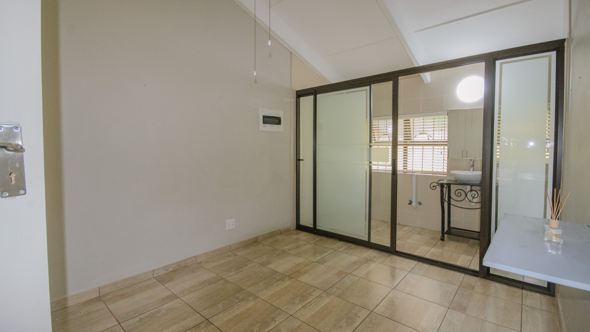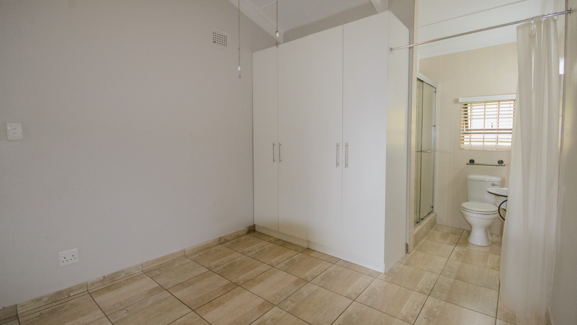 Both bedrooms are positioned off the living area and offer good separation from the main living space. Each bedroom includes built in cupboards, tiled floors, and ceiling fans. Both bedrooms are ensuite, each fitted with a shower, basin, and toilet. The main bedroom features an ensuite enclosed with frosted glass sliding doors, allowing light while maintaining privacy.