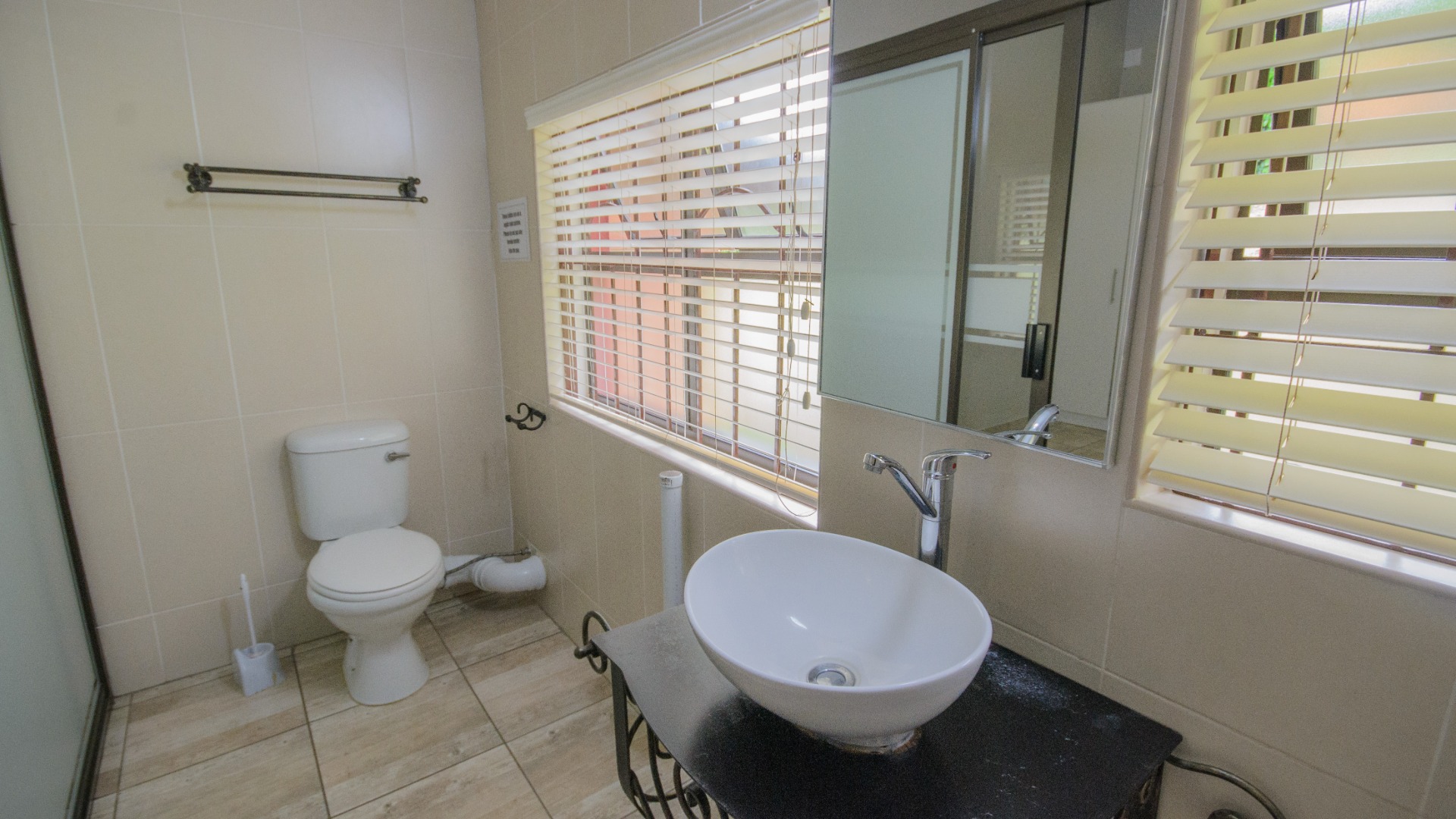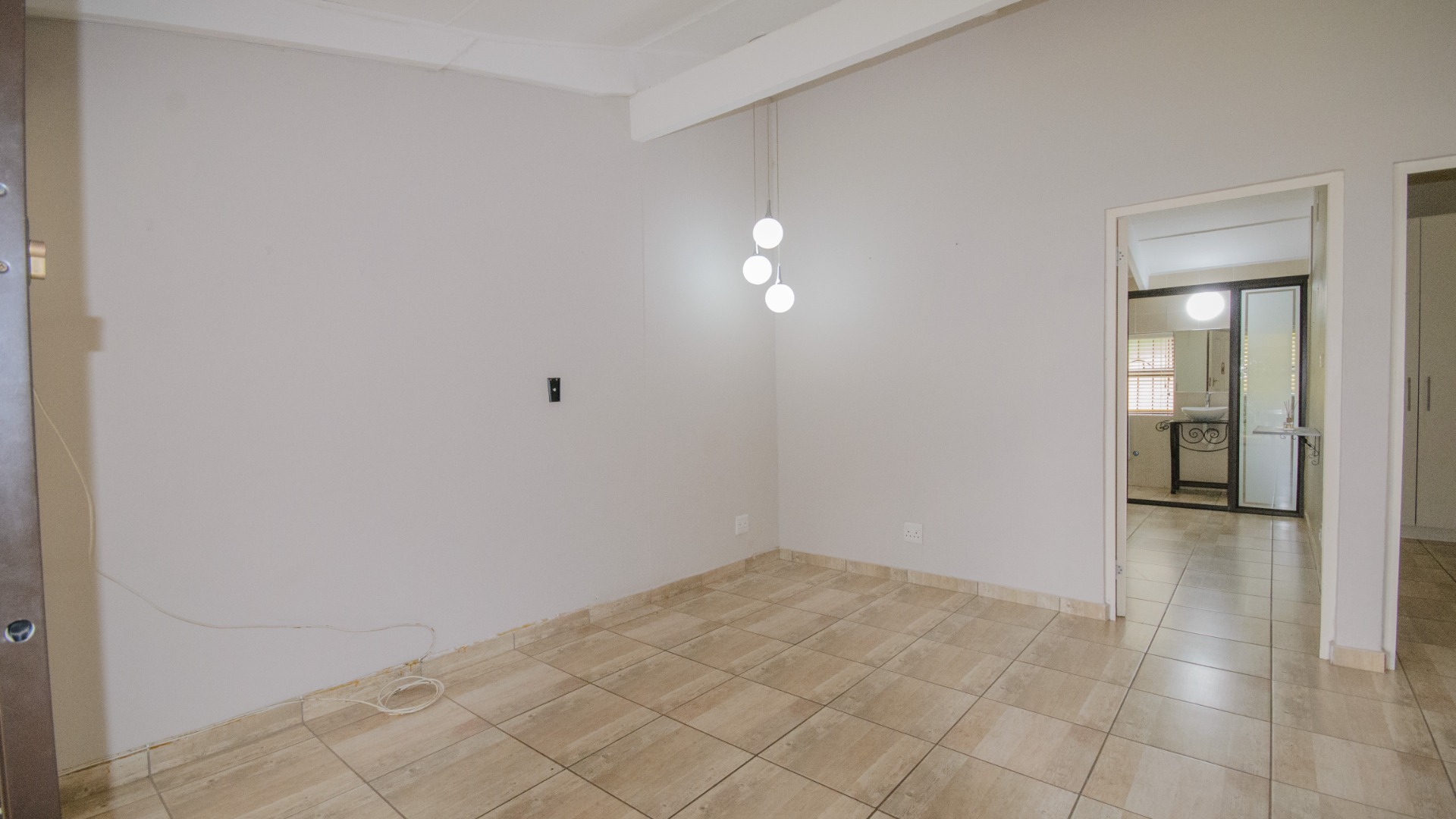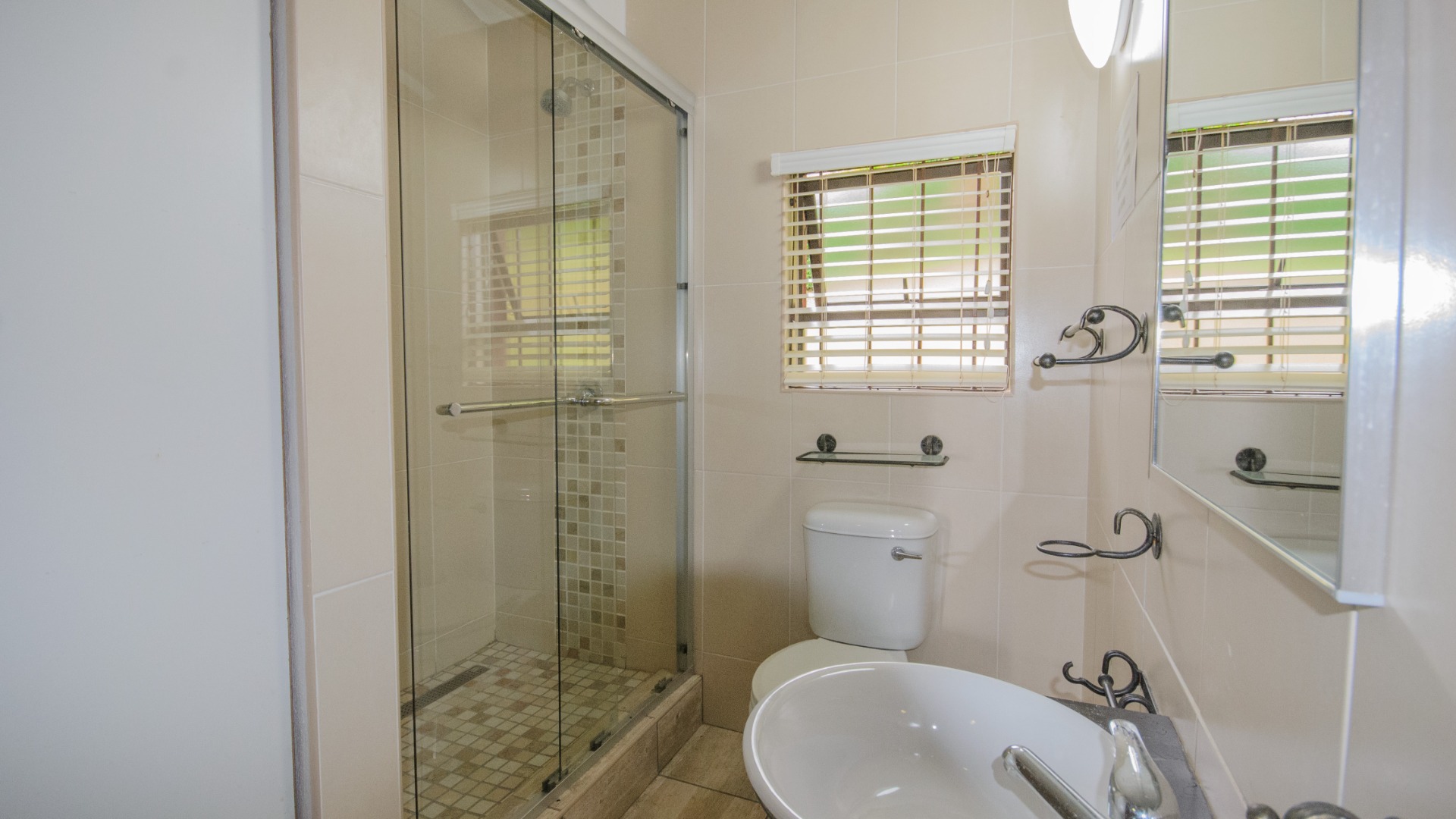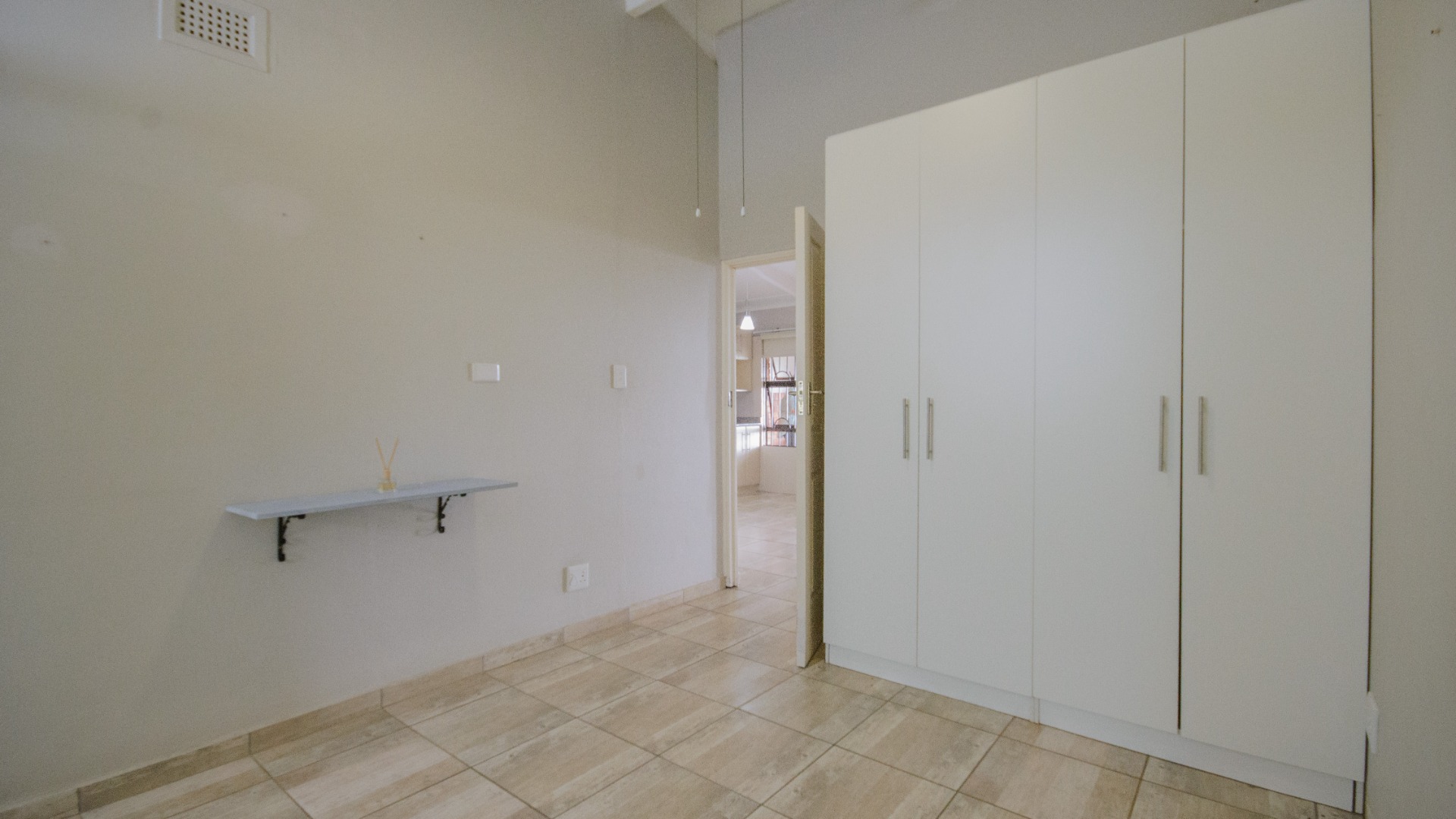 Both bedrooms are positioned off the living area and offer good separation from the main living space. Each bedroom includes built in cupboards, tiled floors, and ceiling fans. Both bedrooms are ensuite, each fitted with a shower, basin, and toilet. The main bedroom features an ensuite enclosed with frosted glass sliding doors, allowing light while maintaining privacy.