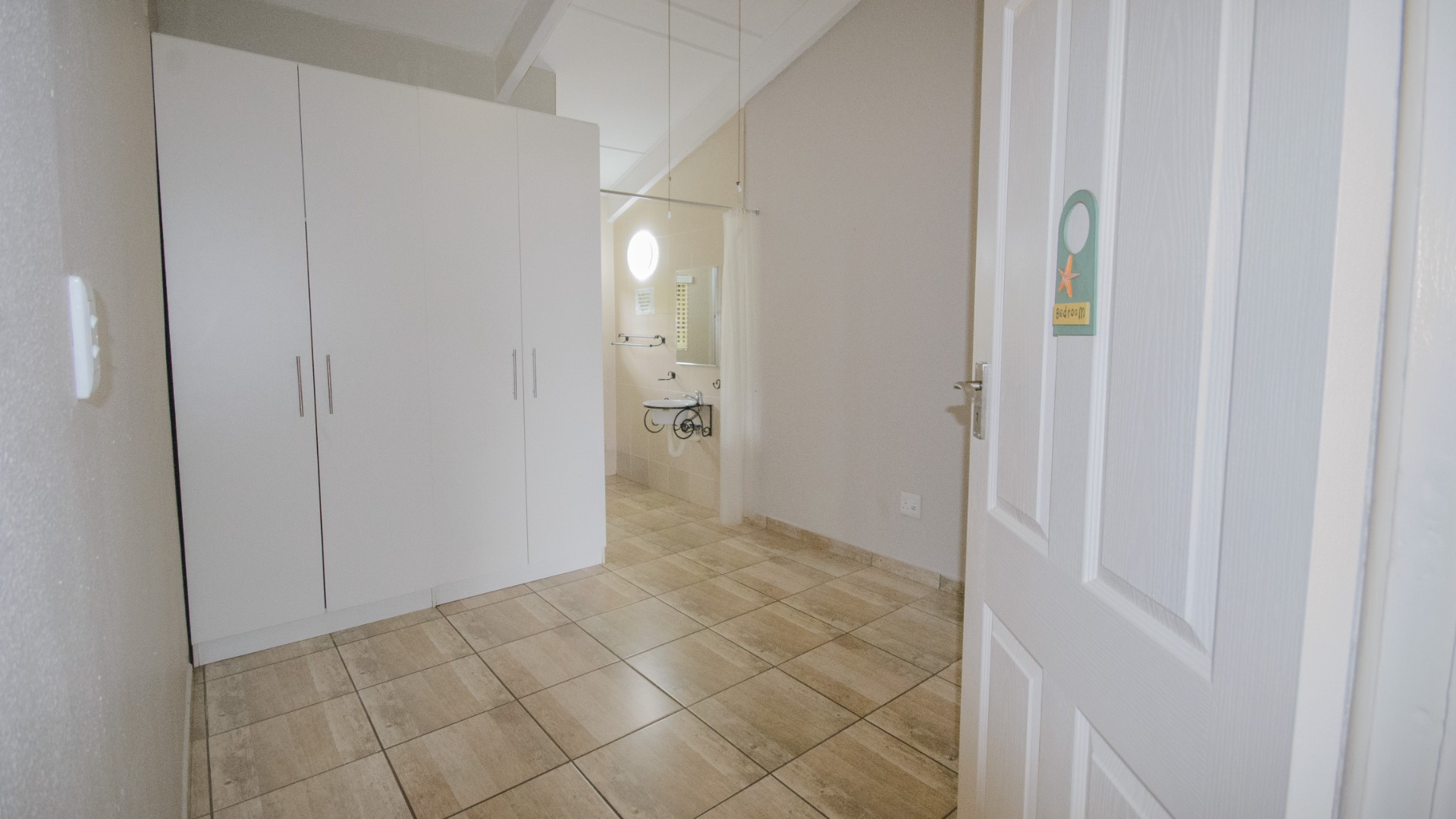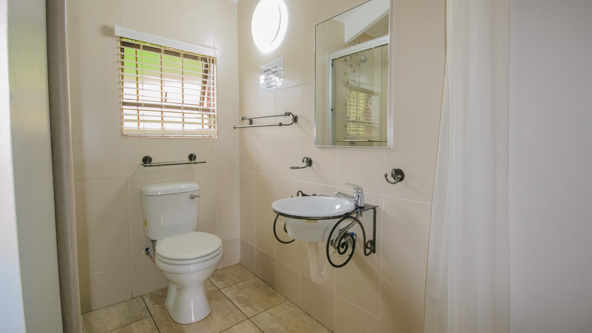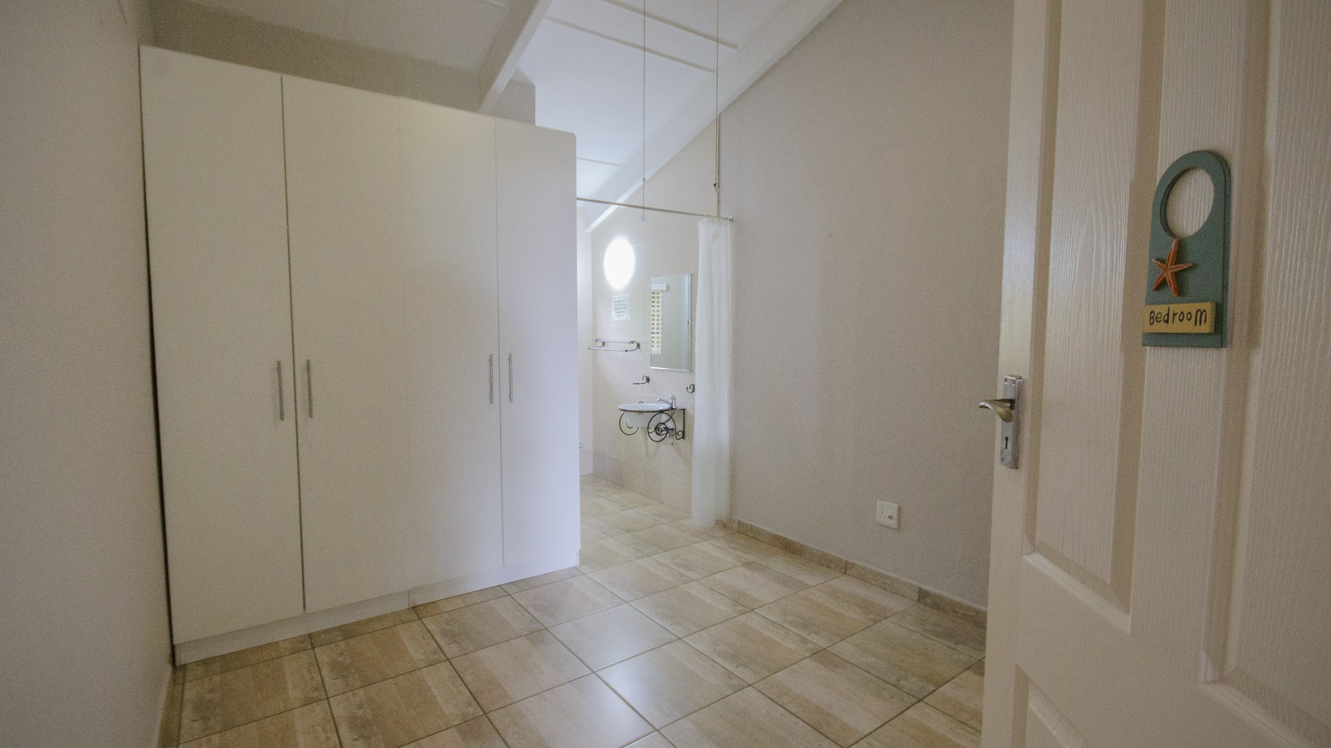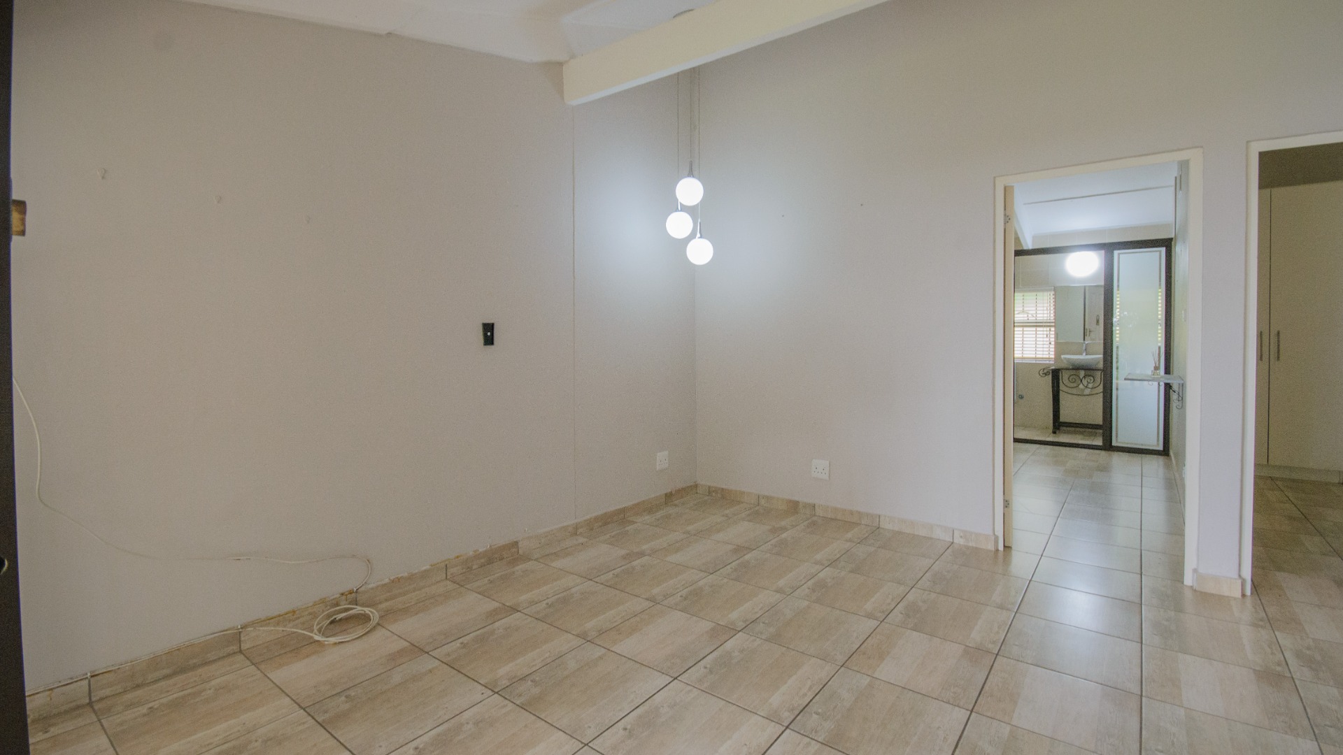 Both bedrooms are positioned off the living area and offer good separation from the main living space. Each bedroom includes built in cupboards, tiled floors, and ceiling fans. Both bedrooms are ensuite, each fitted with a shower, basin, and toilet. The main bedroom features an ensuite enclosed with frosted glass sliding doors, allowing light while maintaining privacy.