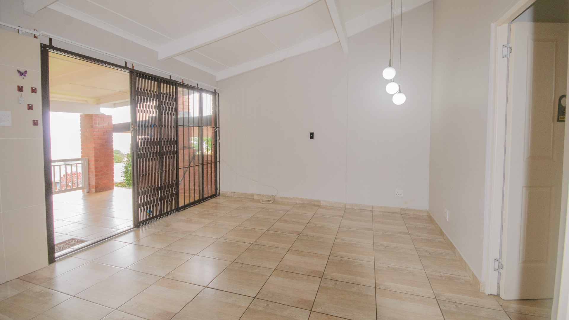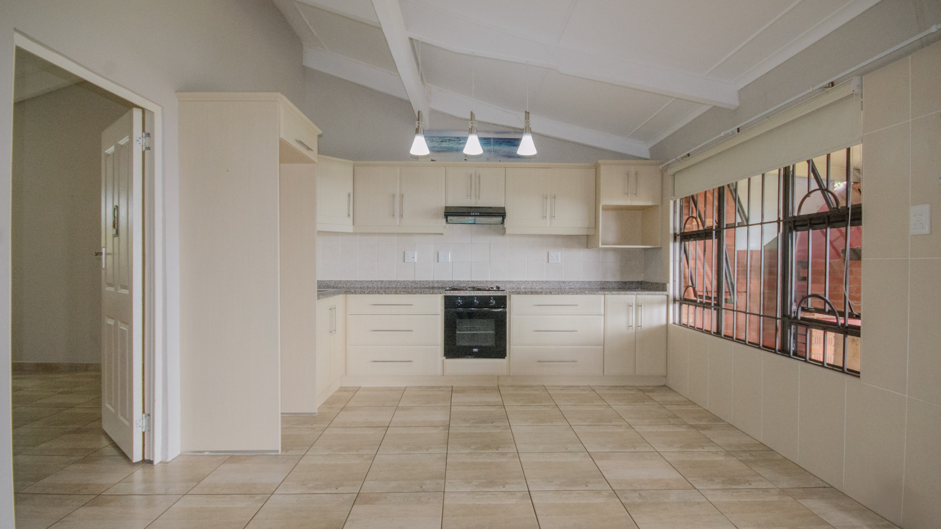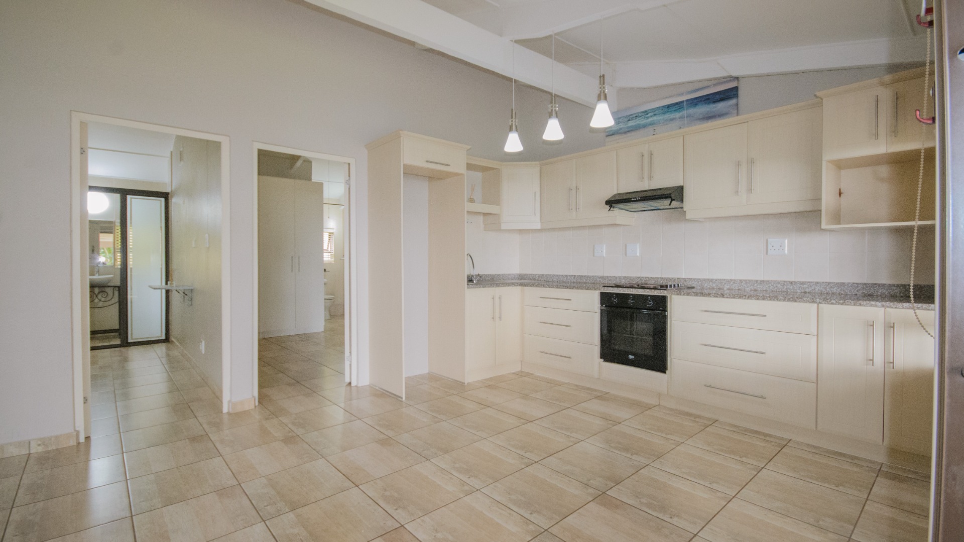 From the patio, sliding doors lead directly into the open plan kitchen and lounge area. The living space is fully tiled and laid out for easy everyday living. The lounge connects naturally with the kitchen, creating a practical and open feel without wasted space.