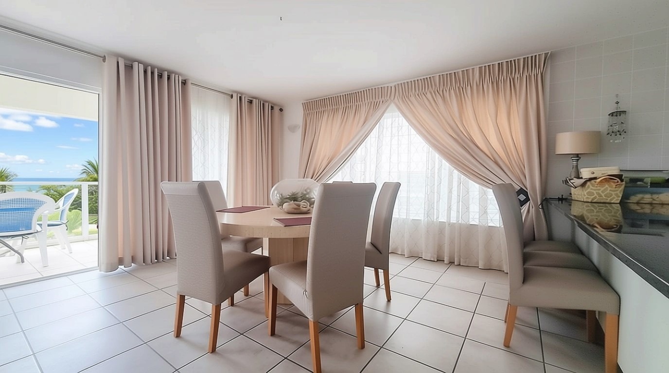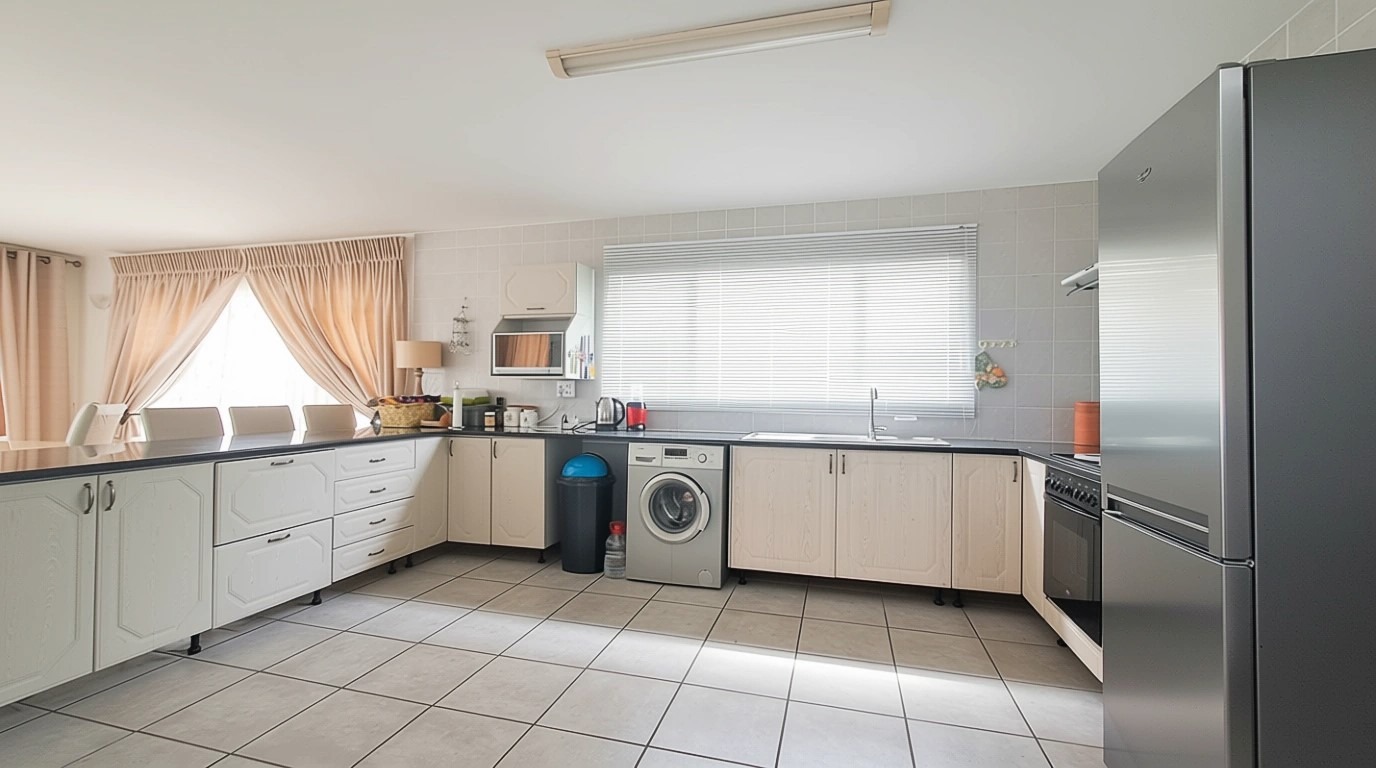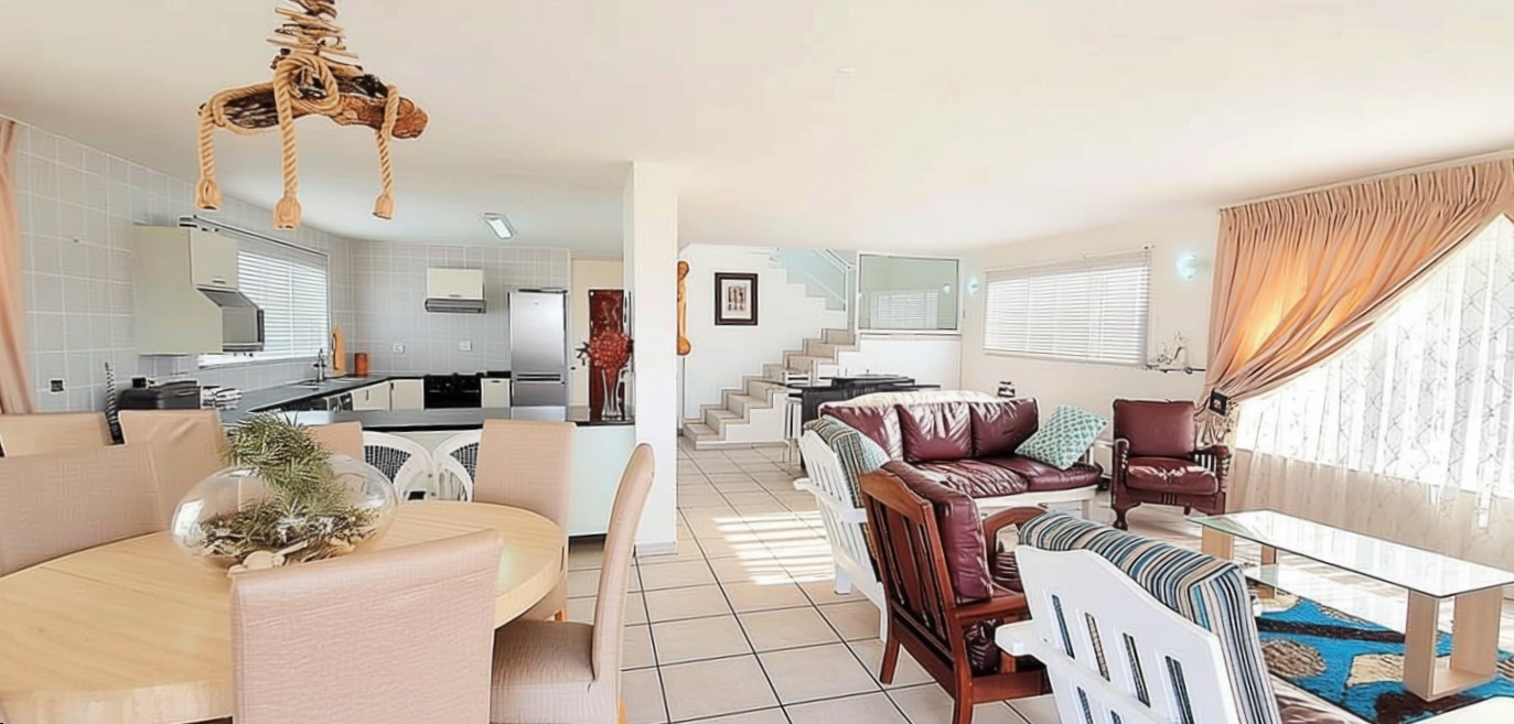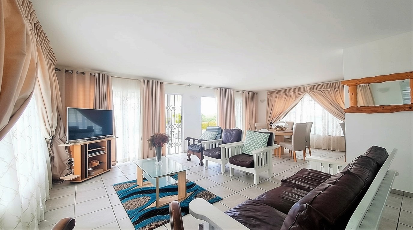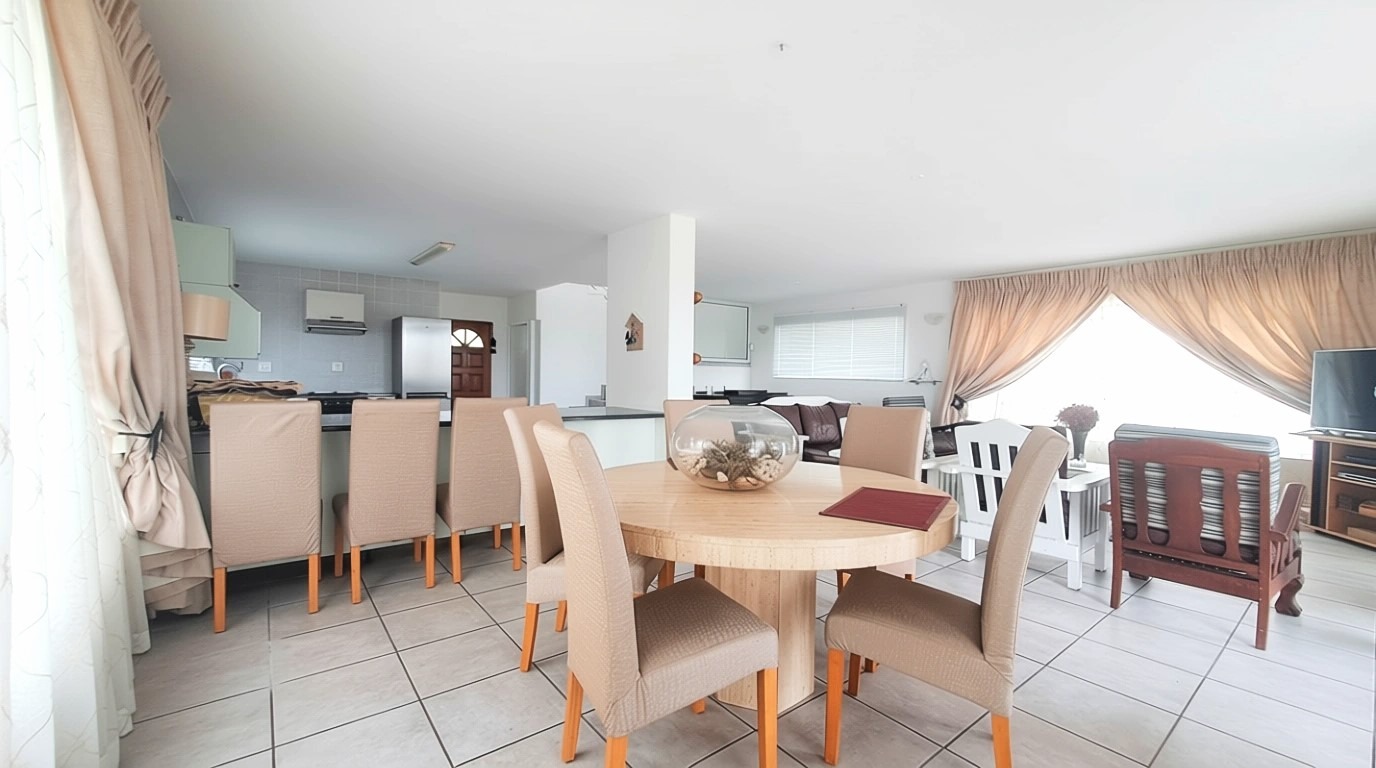 Seamlessly connecting the lounge, dining area, and kitchen. Abundant natural light floods the living spaces through multiple windows and sliding doors, creating a bright and airy atmosphere.