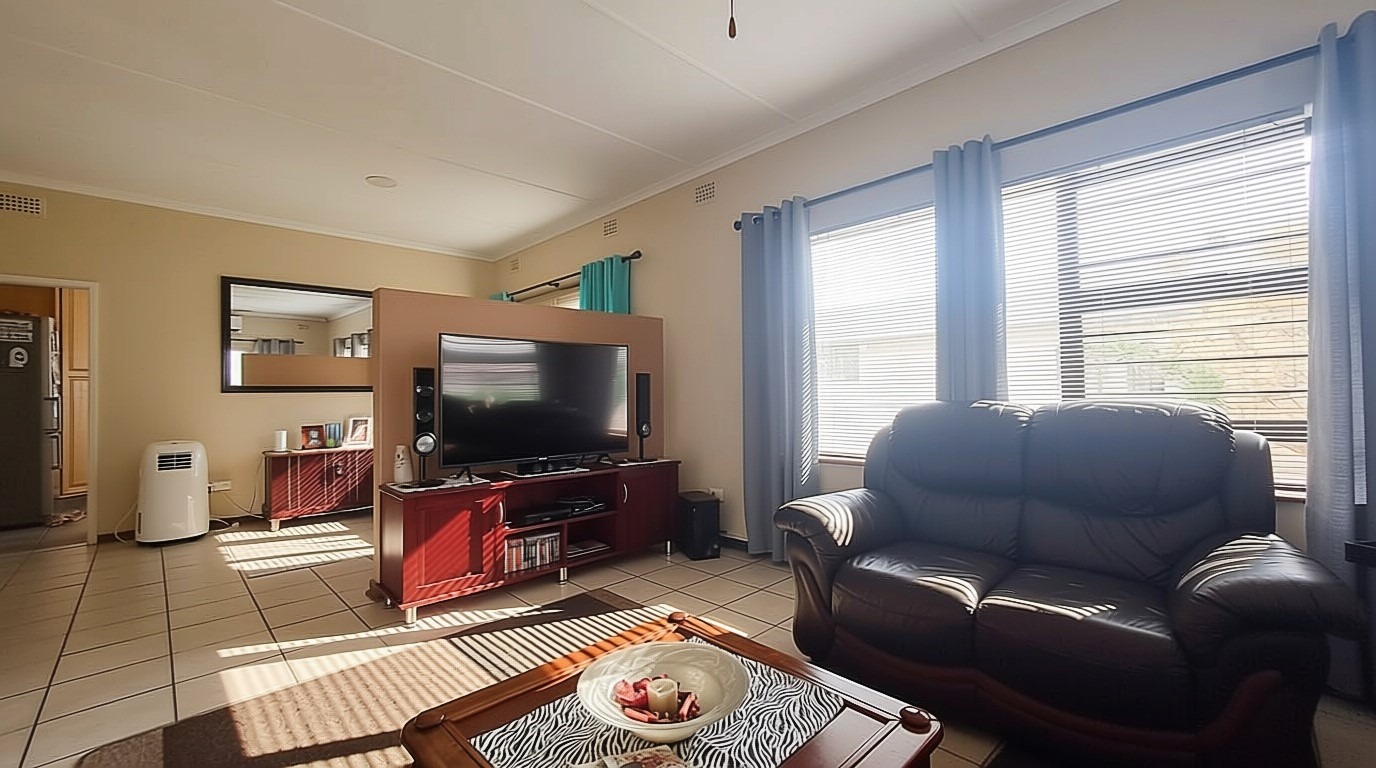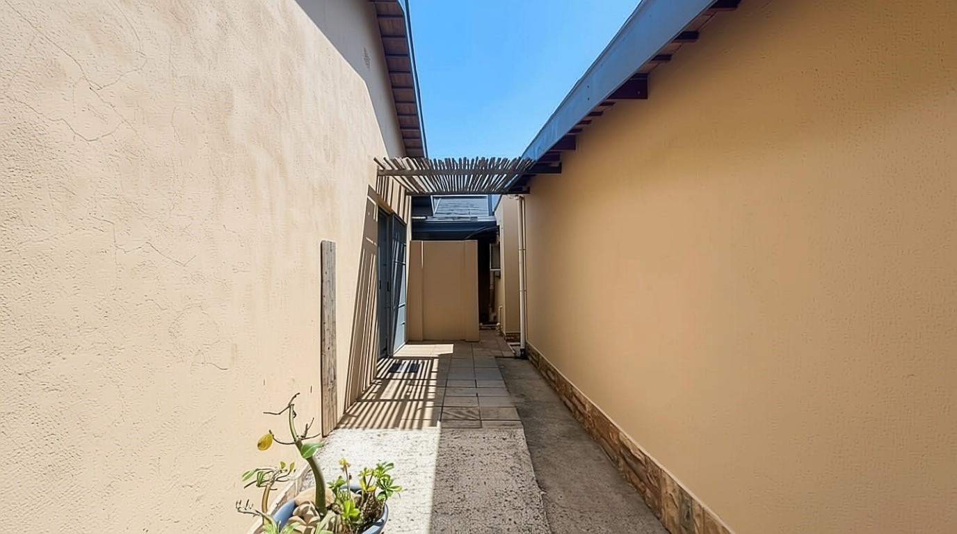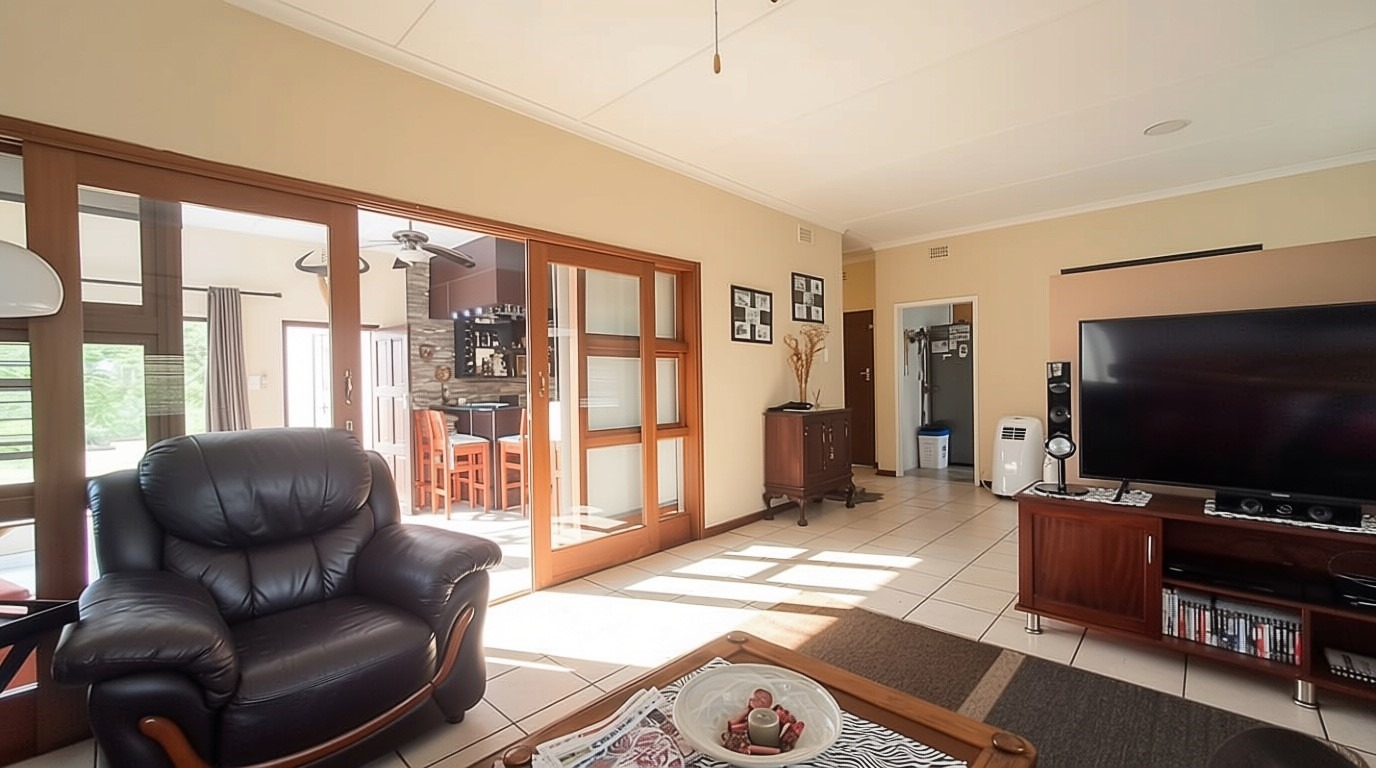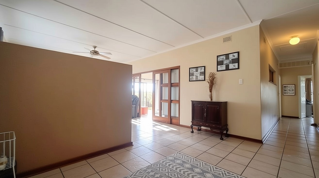 The appealing exterior, featuring a peach facade with a stone-textured base, is complemented by a well-maintained lawn and mature landscaping, creating an inviting first impression. Step outside to discover a private oasis, complete with a sparkling swimming pool, a charming lapa, and a spacious patio perfect for outdoor entertaining. The established garden, built-in braai, and jacuzzi further enhance the lifestyle offerings, while two garages and four additional parking spaces provide ample accommodation for vehicles.