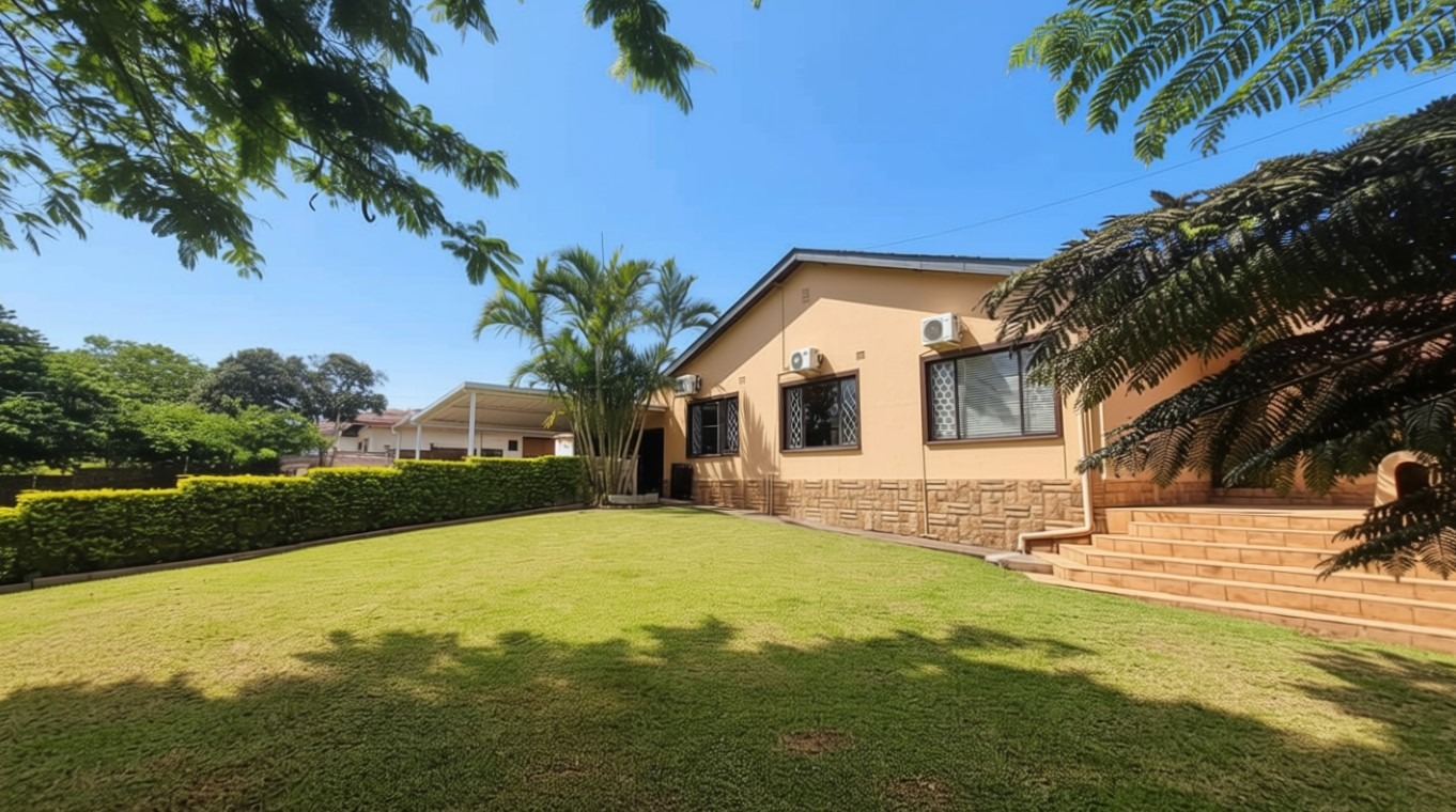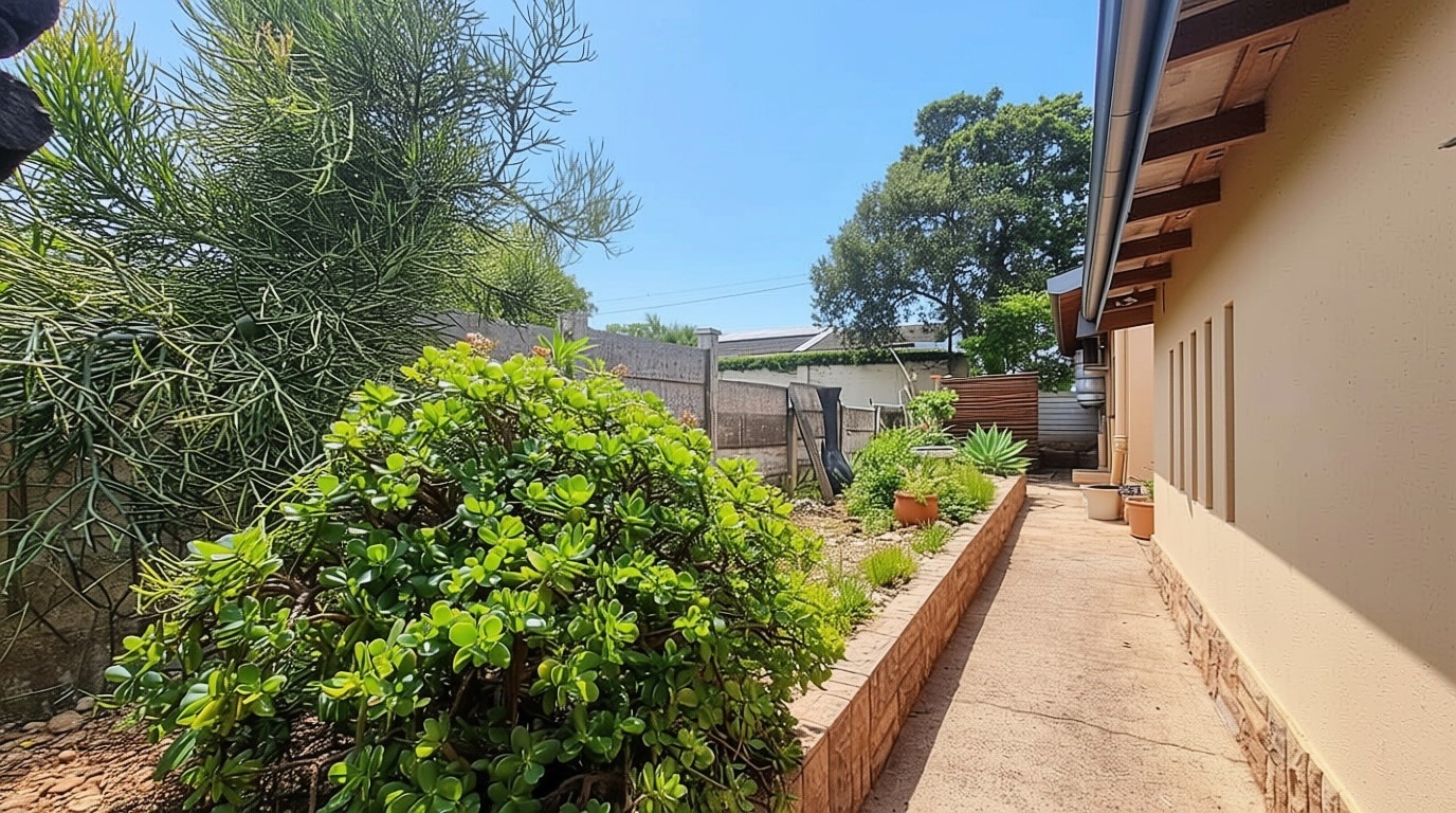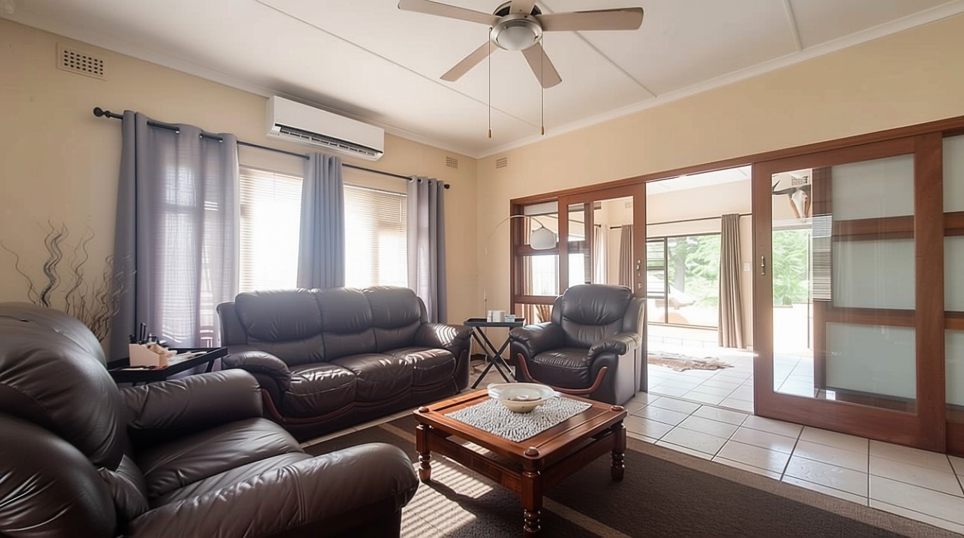 The appealing exterior, featuring a peach facade with a stone-textured base, is complemented by a well-maintained lawn and mature landscaping, creating an inviting first impression. Step outside to discover a private oasis, complete with a sparkling swimming pool, a charming lapa, and a spacious patio perfect for outdoor entertaining. The established garden, built-in braai, and jacuzzi further enhance the lifestyle offerings, while two garages and four additional parking spaces provide ample accommodation for vehicles.