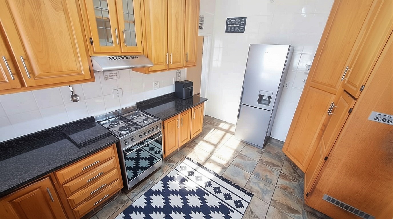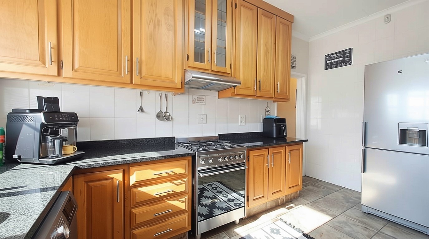 The interior boasts a versatile layout designed for both relaxation and entertainment. With a lounge, dining room, and a family room with a built-in bar, there is ample space for every occasion. The property features a well-appointed kitchen, equipped with light wood cabinetry and granite countertops. Three comfortable bedrooms and two bathrooms, one of which is en suite.