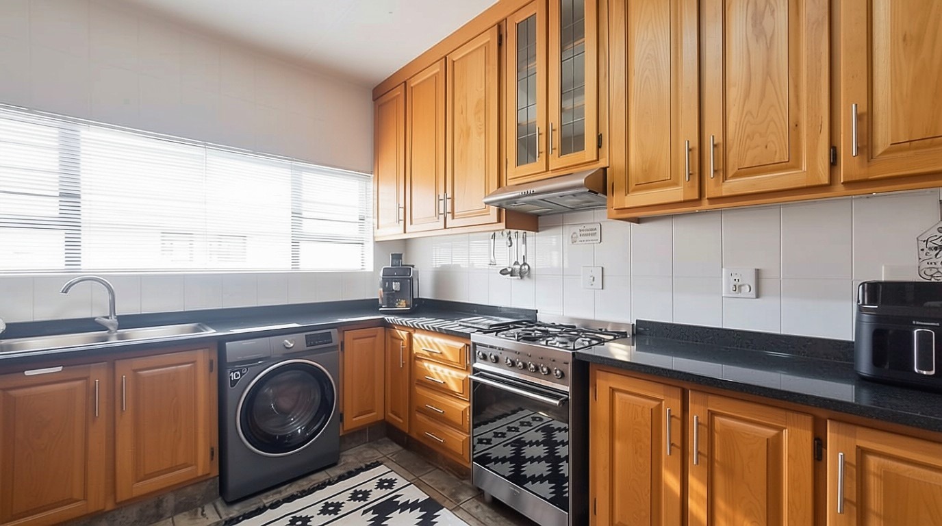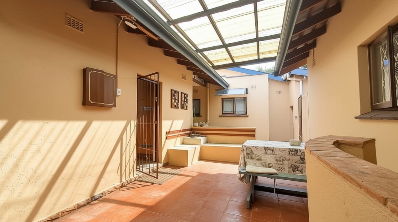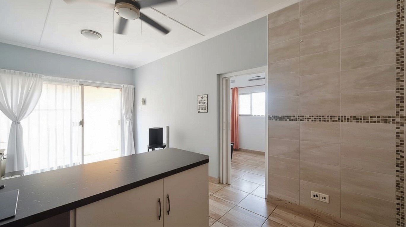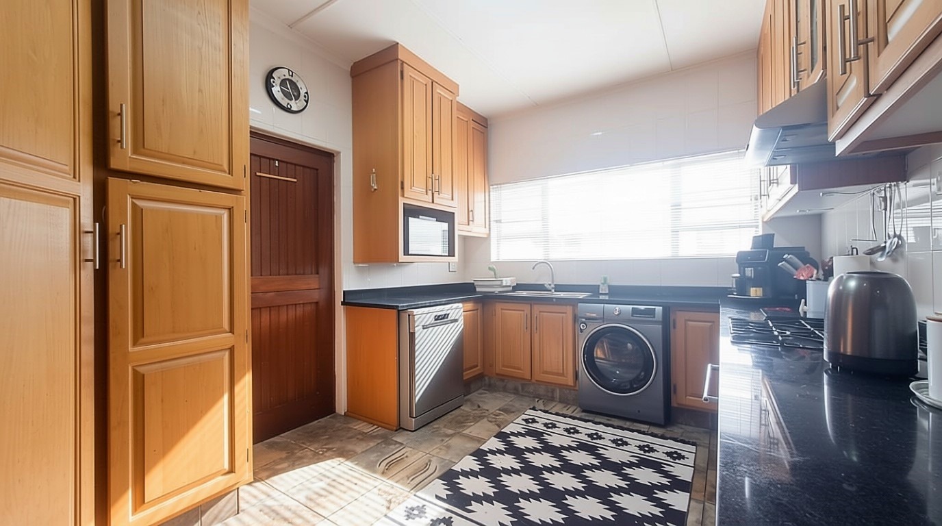 Security is paramount with 24-hour security, an alarm system, burglar bars, and a security gate, all within a totally walled perimeter. Modern amenities include a solar geyser, solar panels, a battery inverter, and water tanks, promoting sustainable living. Fibre connectivity ensures high-speed internet access, catering to contemporary needs.