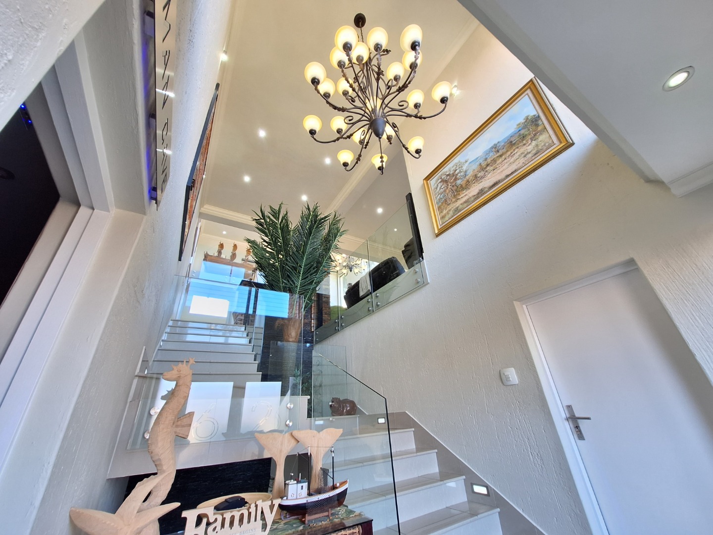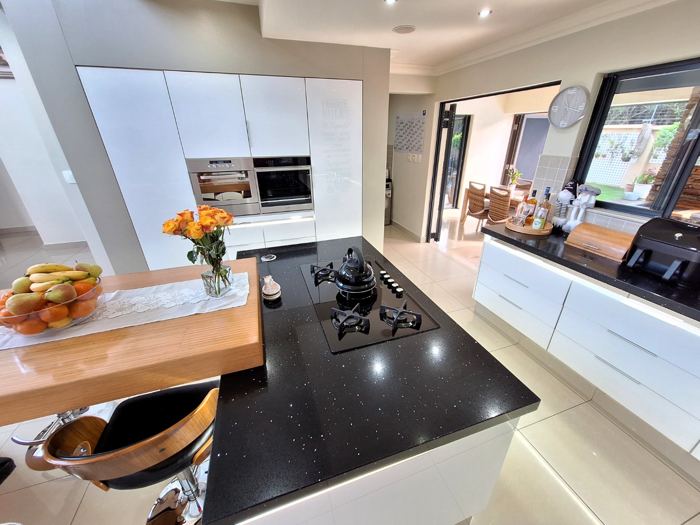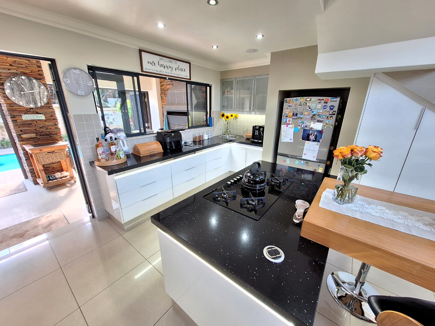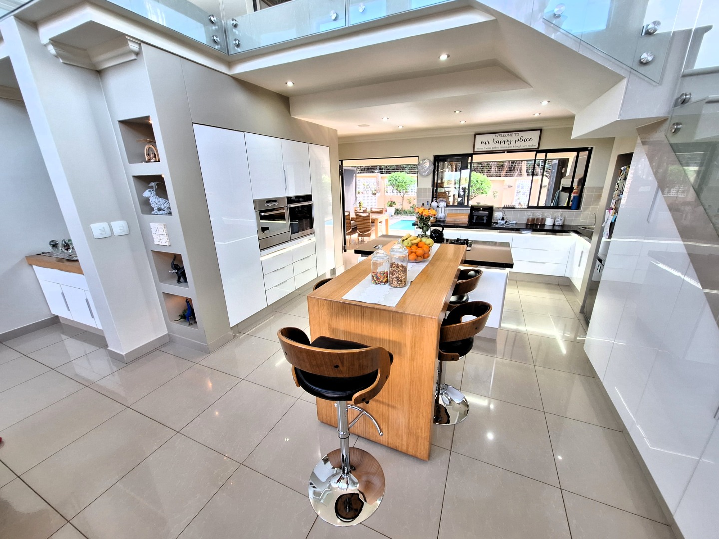 The heart of this home is undoubtedly its state-of-the-art kitchen, a culinary haven featuring sleek, high-gloss white cabinetry, integrated appliances, and a substantial island with breakfast bar seating. This exquisite space effortlessly transitions to the outdoor entertainment area, boasting a built-in braai and bar, perfect for alfresco dining and enjoying the South African climate.