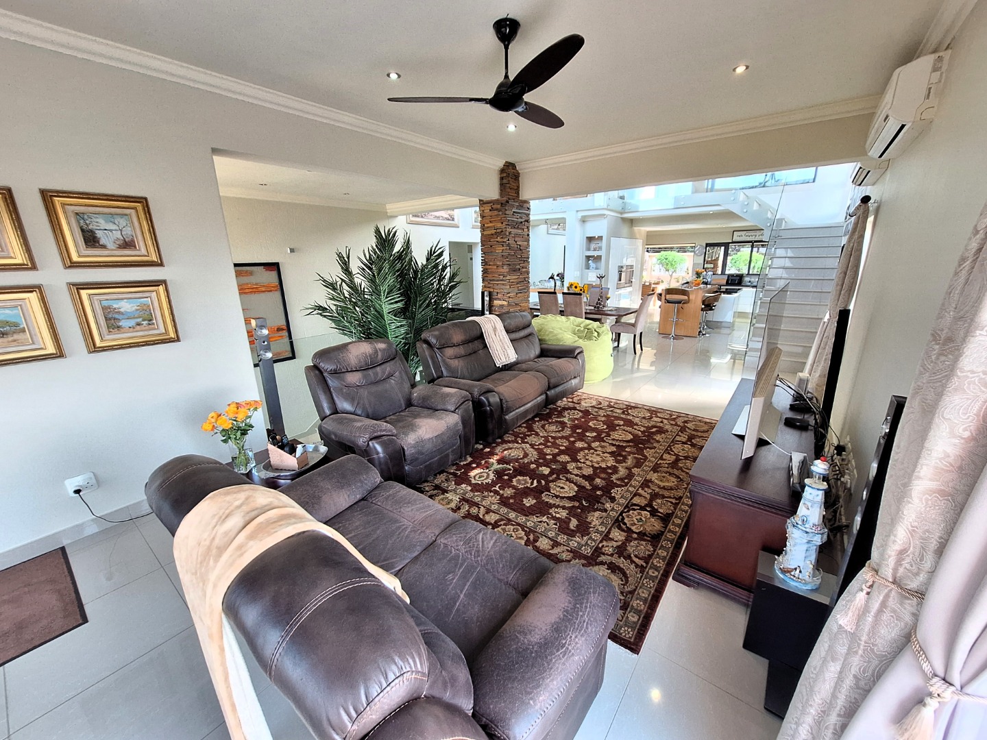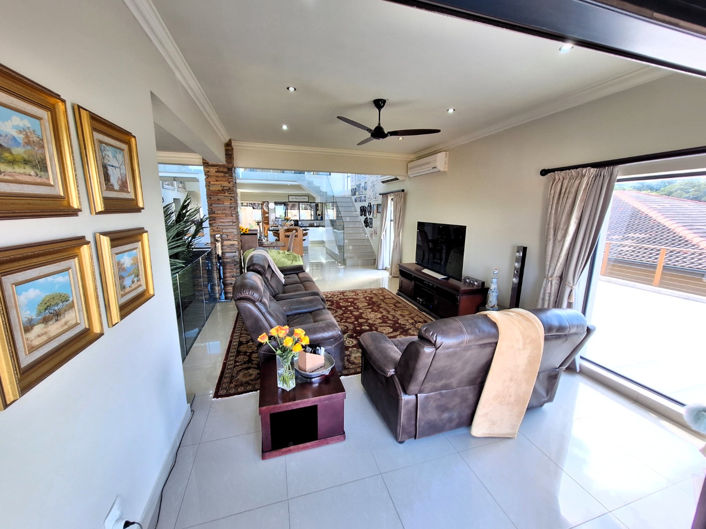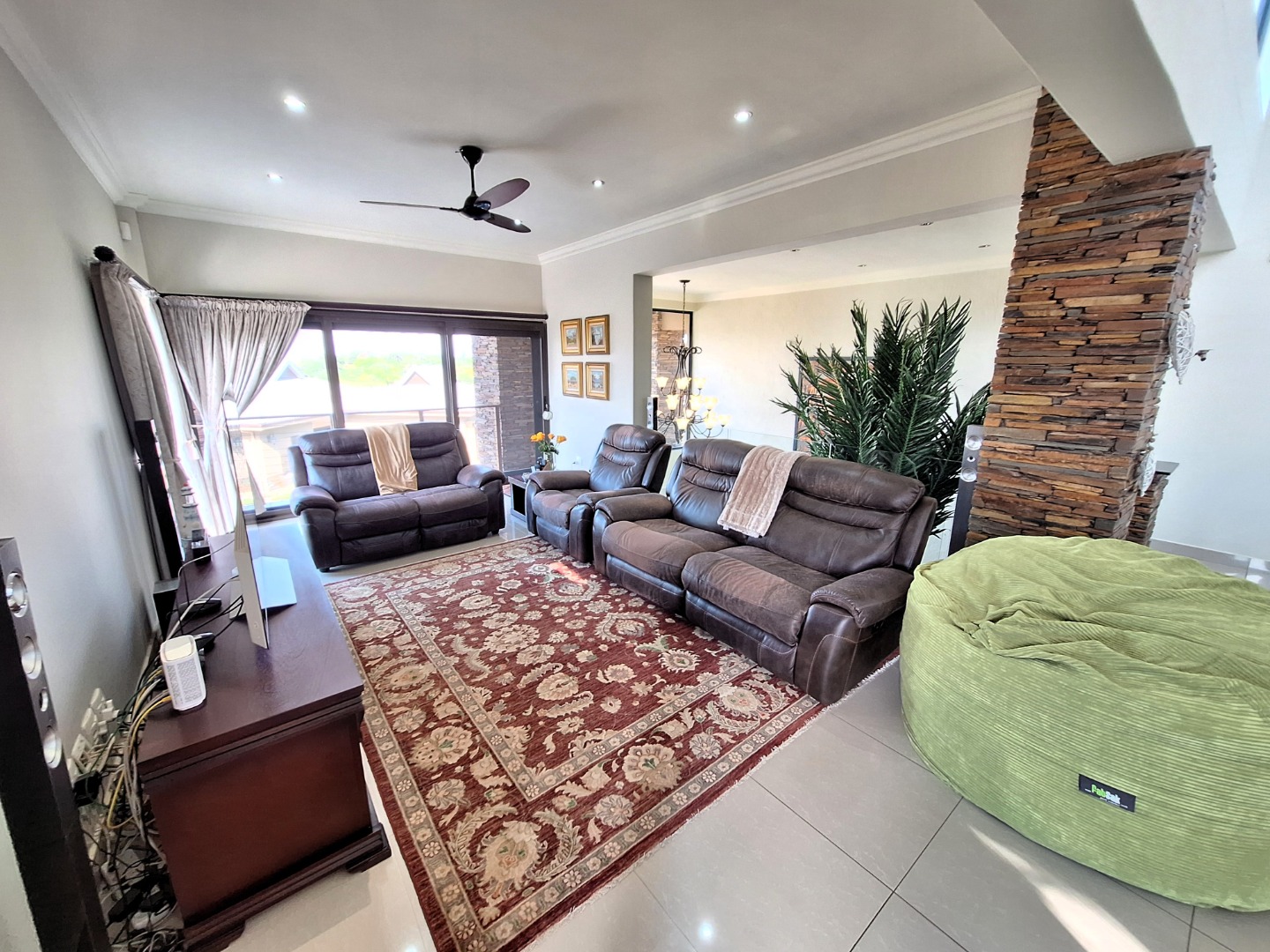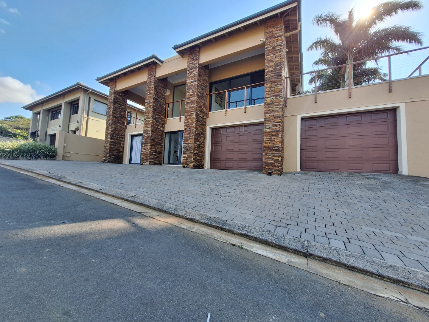 Discover an architectural masterpiece nestled within a prestigious eco-estate in Shelly Beach. This contemporary residence presents a striking facade, characterized by elegant stone-clad pillars, expansive glazing, and a harmonious blend of pitched tile and flat roofing, creating an immediate sense of grandeur and sophisticated kerb appeal. Multiple garages and an extensive paved driveway ensure ample parking for residents and guests alike, setting the stage for an exceptional living experience.