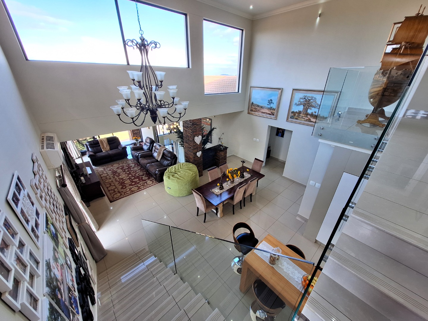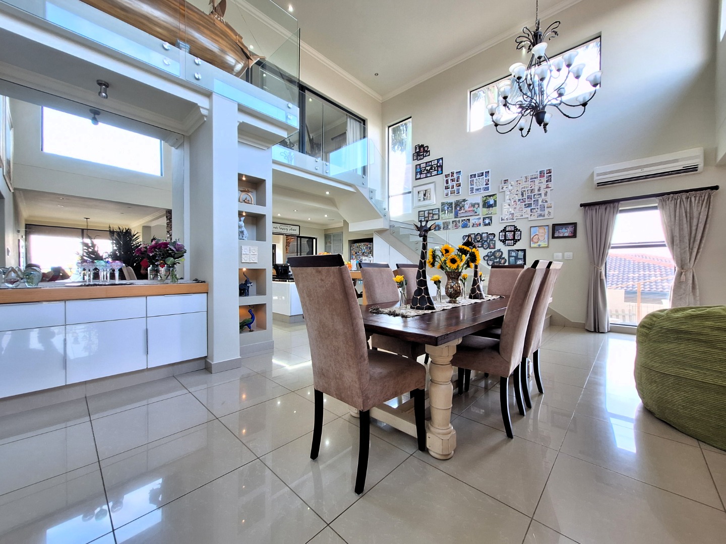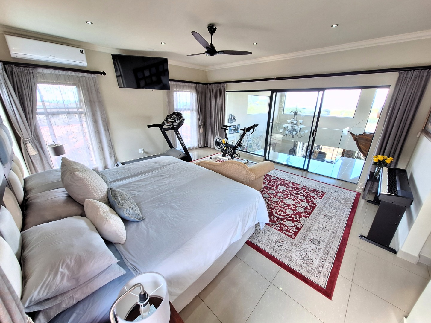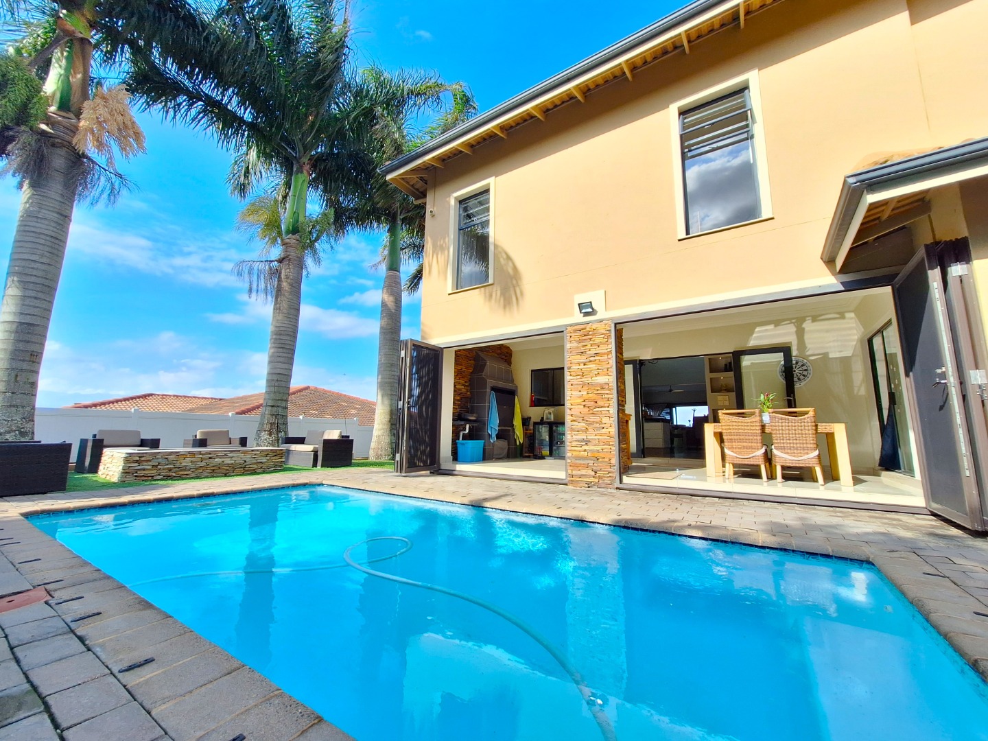 Discover an architectural masterpiece nestled within a prestigious eco-estate in Shelly Beach. This contemporary residence presents a striking facade, characterized by elegant stone-clad pillars, expansive glazing, and a harmonious blend of pitched tile and flat roofing, creating an immediate sense of grandeur and sophisticated kerb appeal. Multiple garages and an extensive paved driveway ensure ample parking for residents and guests alike, setting the stage for an exceptional living experience.
