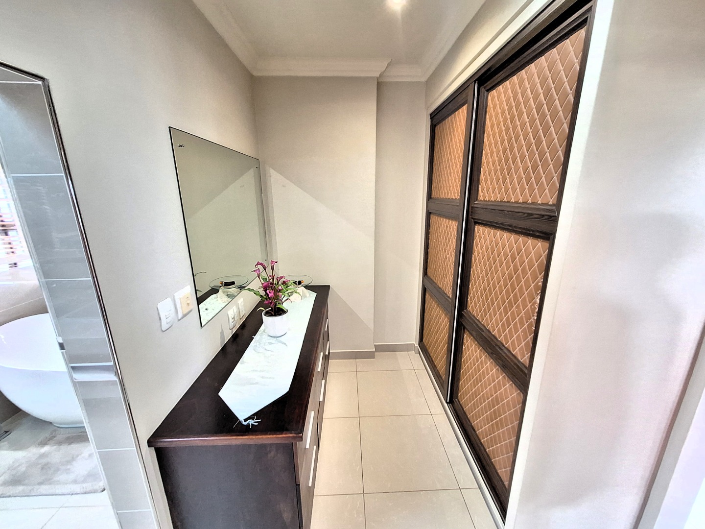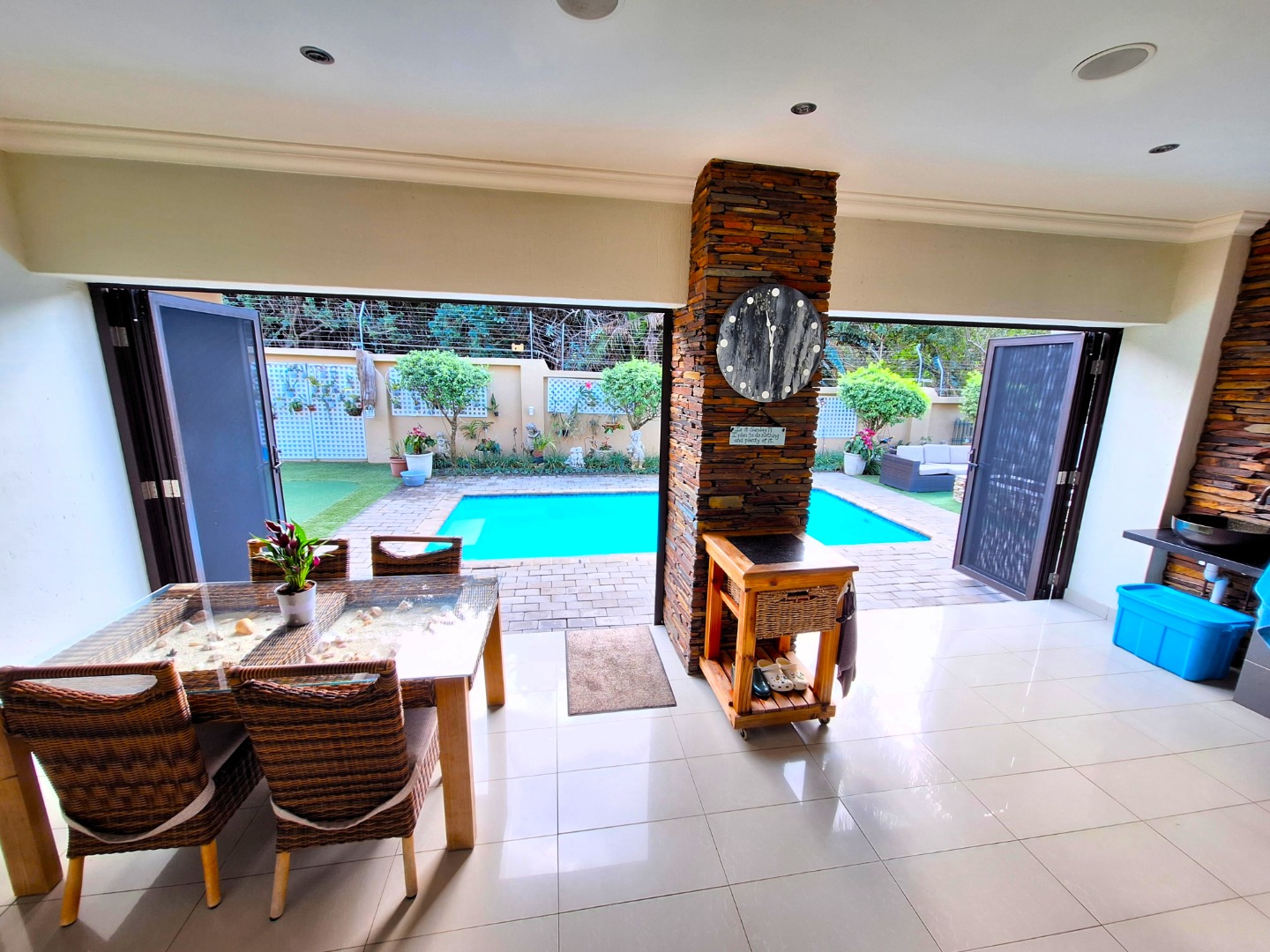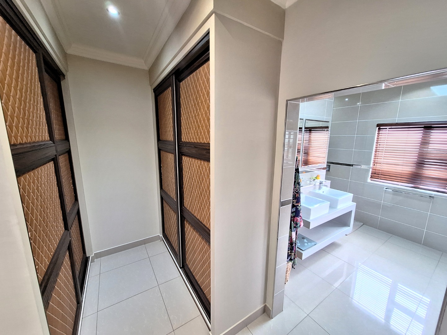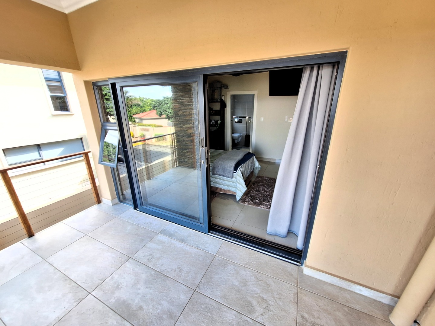 Discover an architectural masterpiece nestled within a prestigious eco-estate in Shelly Beach. This contemporary residence presents a striking facade, characterized by elegant stone-clad pillars, expansive glazing, and a harmonious blend of pitched tile and flat roofing, creating an immediate sense of grandeur and sophisticated kerb appeal. Multiple garages and an extensive paved driveway ensure ample parking for residents and guests alike, setting the stage for an exceptional living experience.