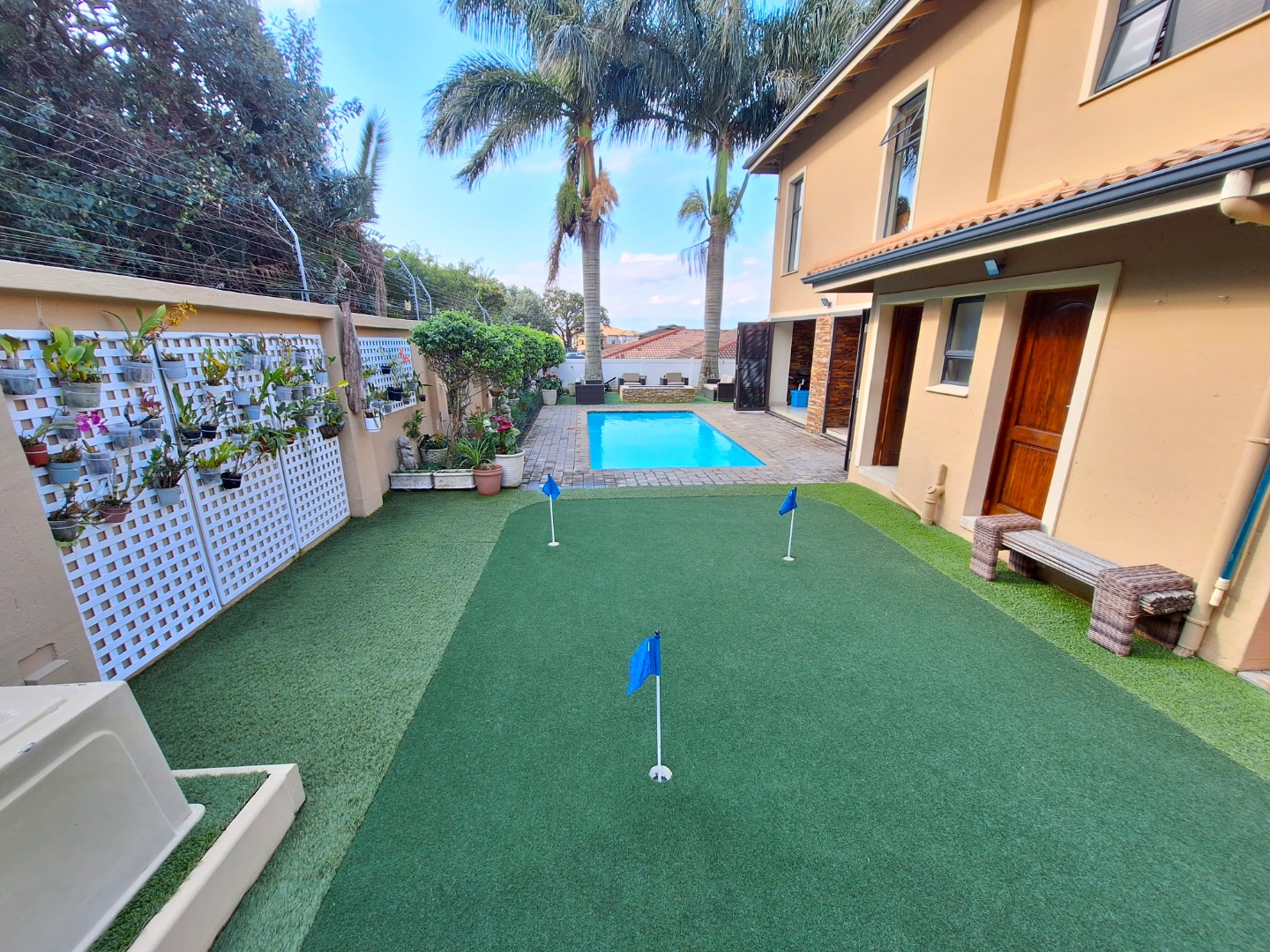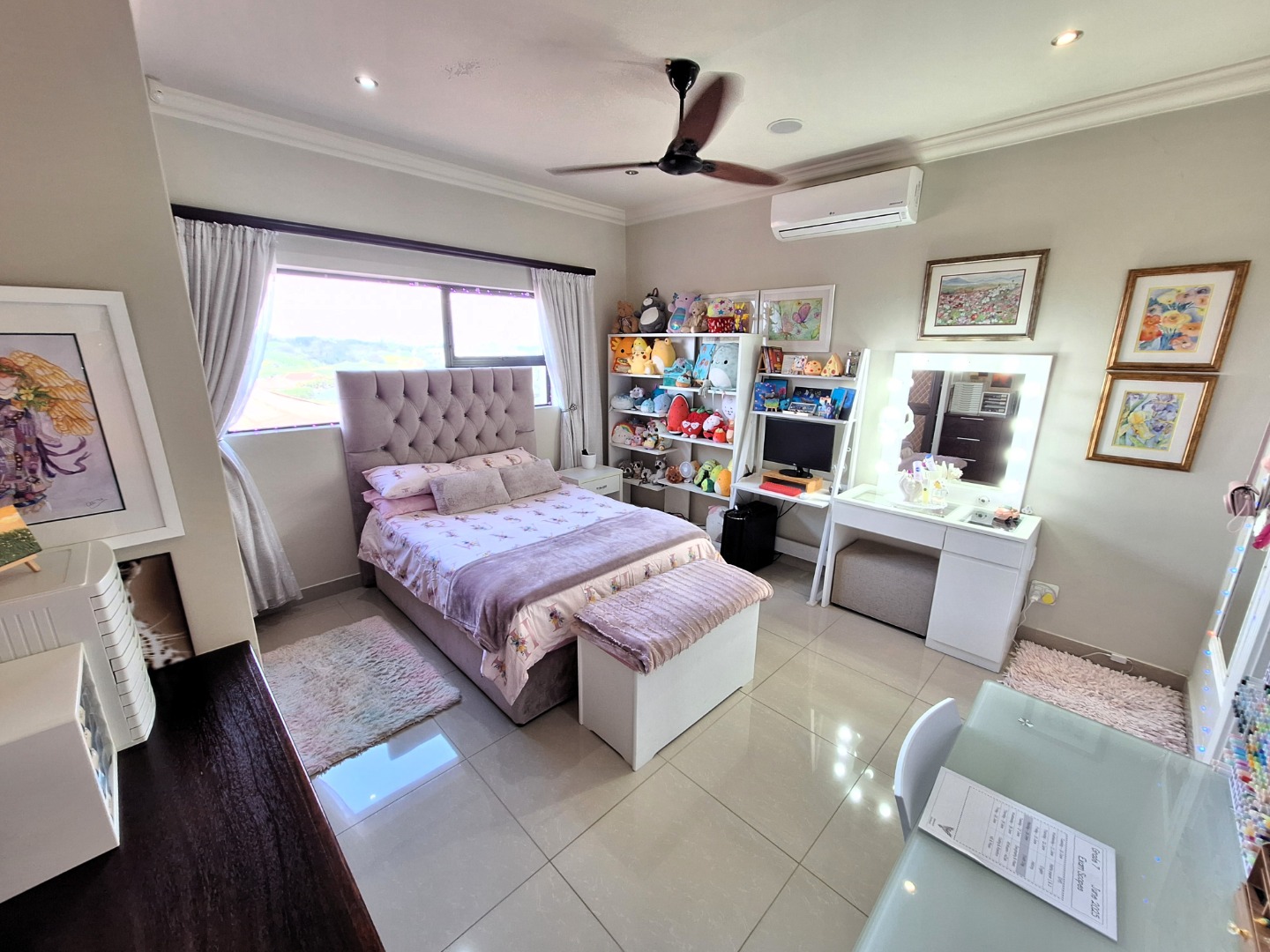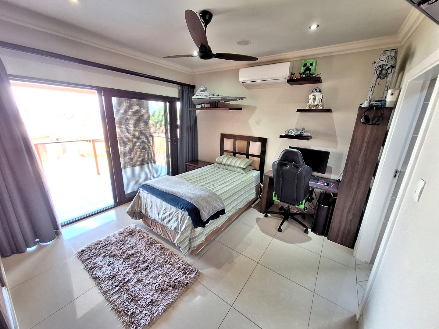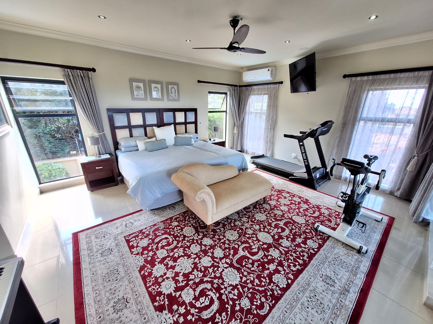 Discover an architectural masterpiece nestled within a prestigious eco-estate in Shelly Beach. This contemporary residence presents a striking facade, characterized by elegant stone-clad pillars, expansive glazing, and a harmonious blend of pitched tile and flat roofing, creating an immediate sense of grandeur and sophisticated kerb appeal. Multiple garages and an extensive paved driveway ensure ample parking for residents and guests alike, setting the stage for an exceptional living experience.