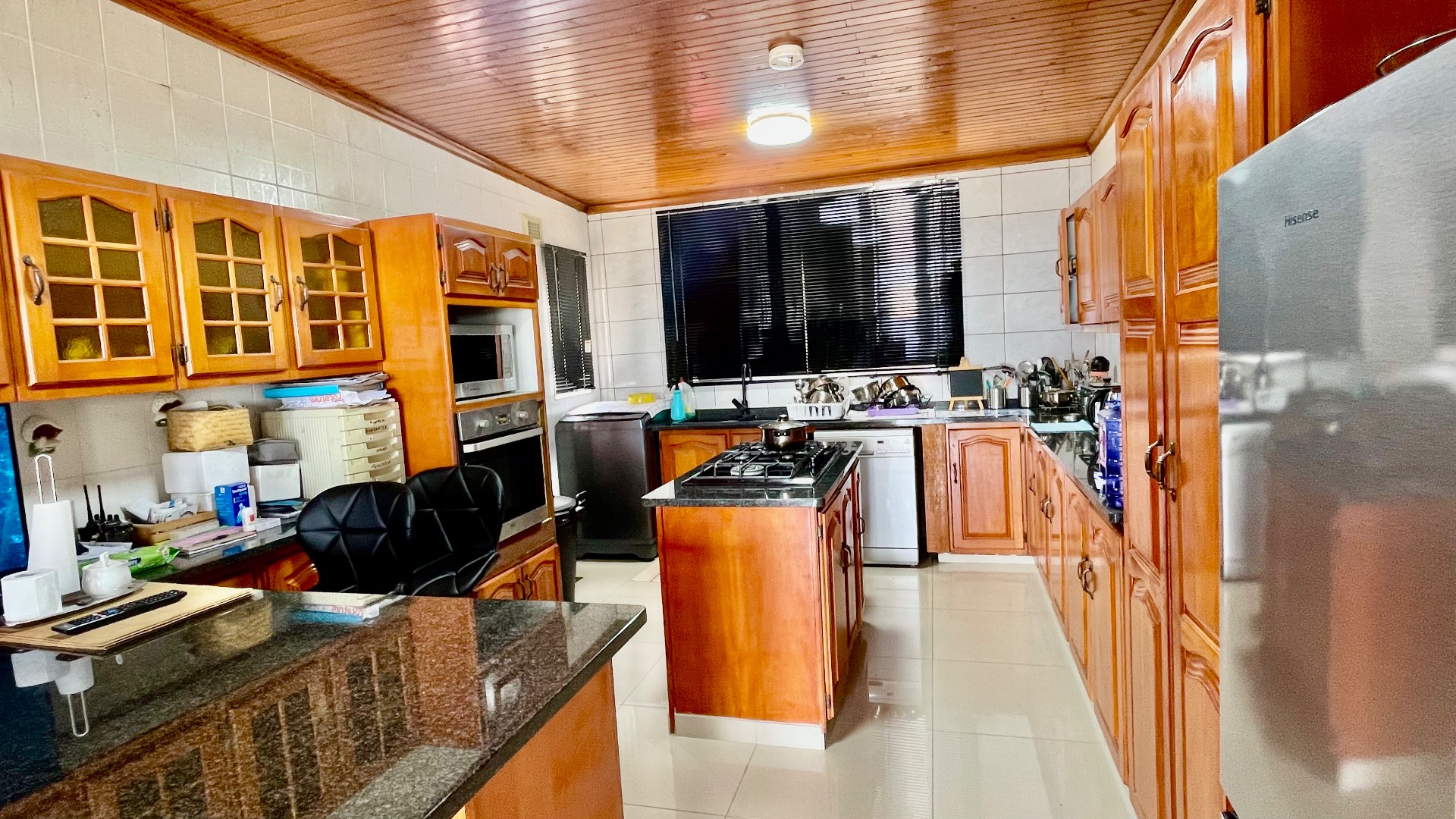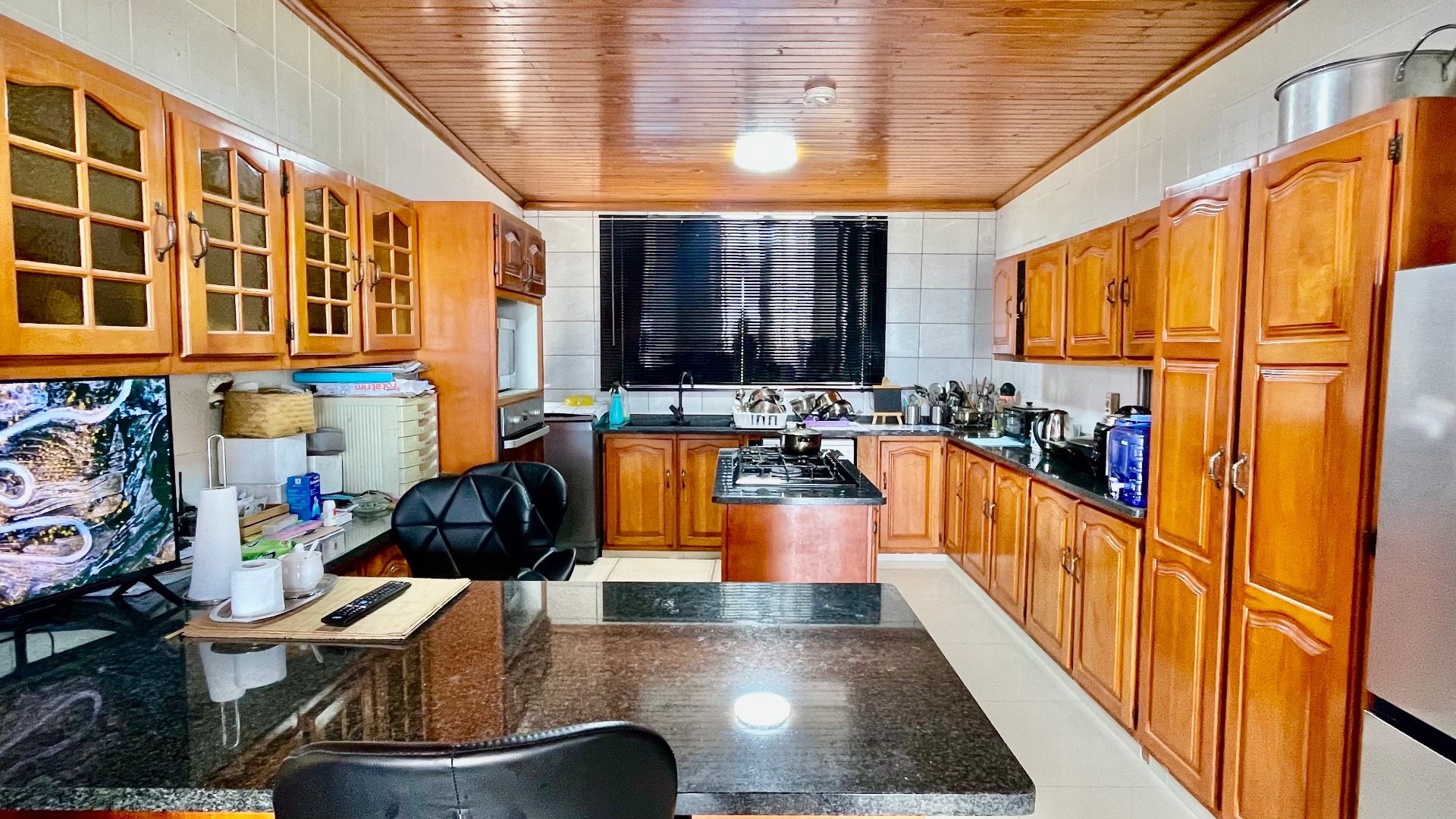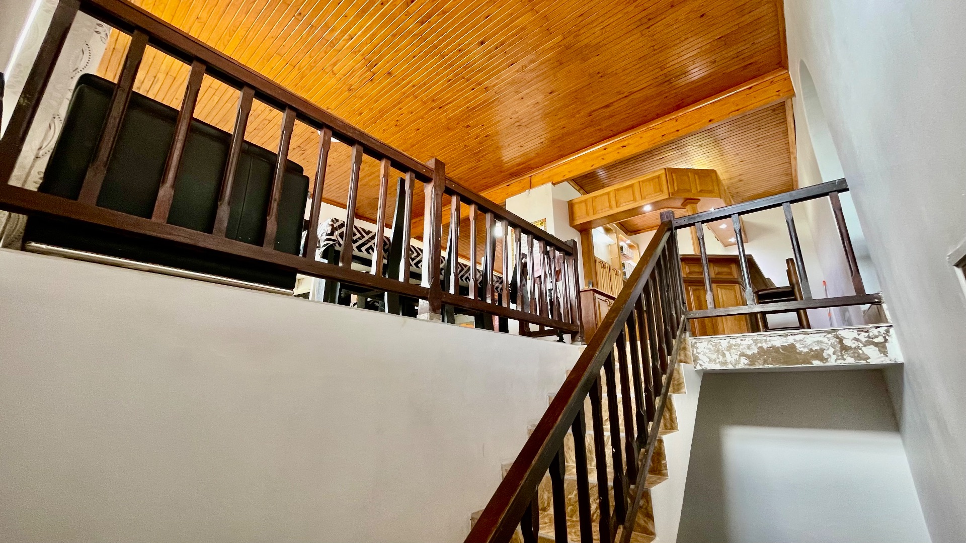 The interior features a versatile multi-level layout, encompassing a comfortable lounge and an impressive three kitchens, catering to diverse living arrangements. Distinctive elements include a prominent wooden staircase. A dedicated bar area, complete with extensive built-in wooden cabinetry, offers an ideal space for entertaining.