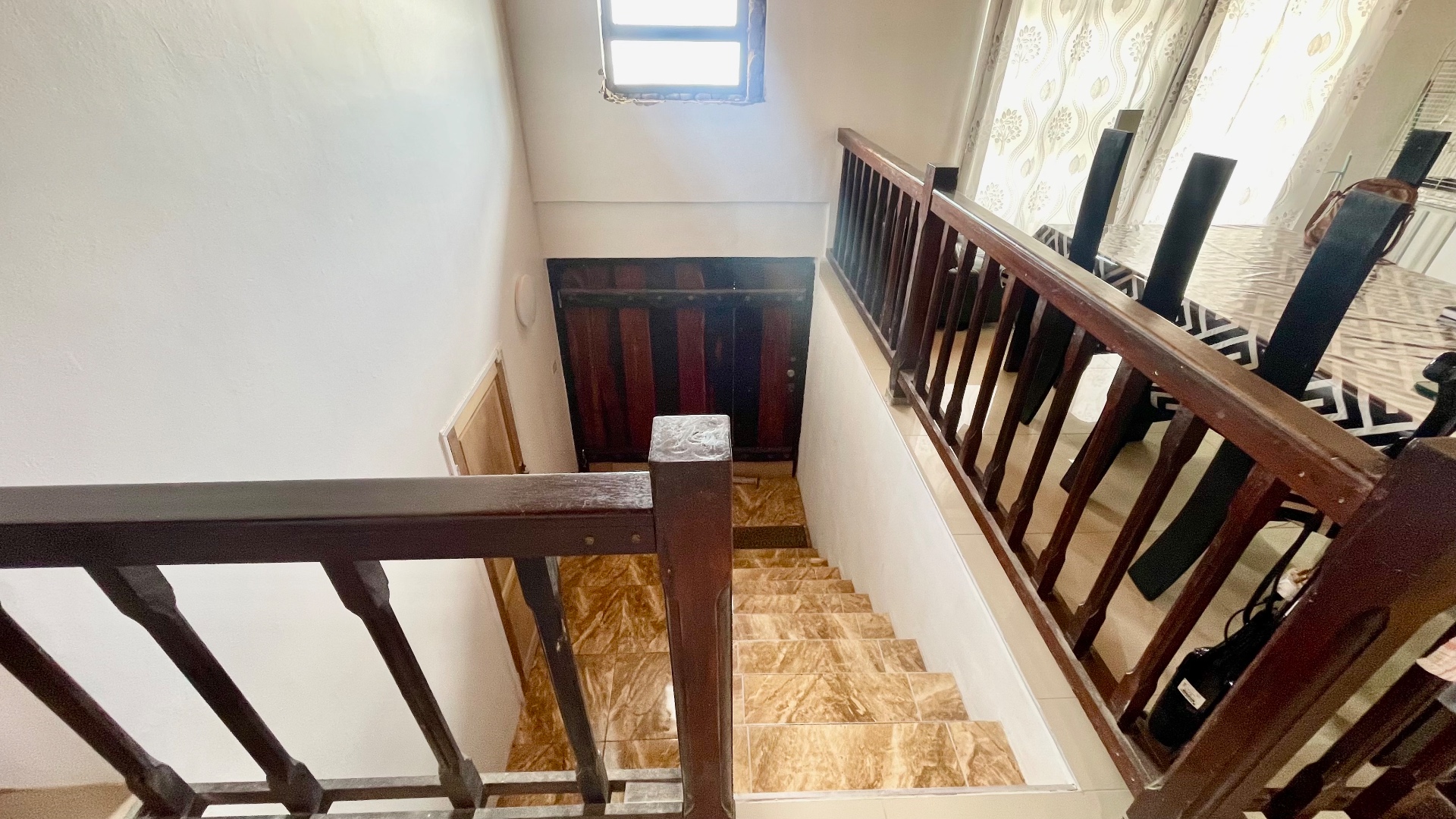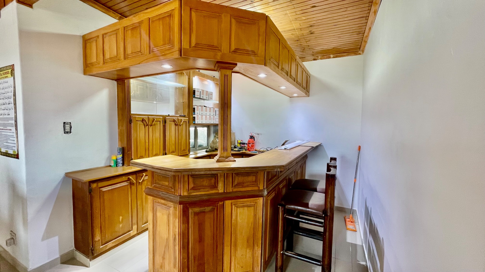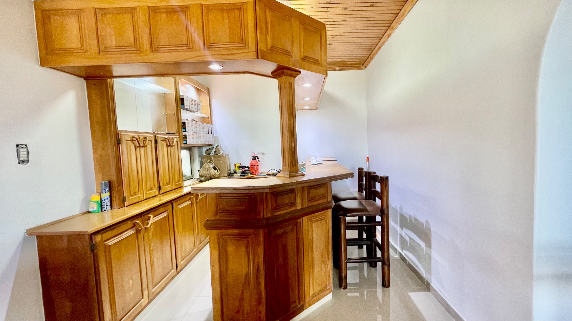 The interior features a versatile multi-level layout, encompassing a comfortable lounge and an impressive three kitchens, catering to diverse living arrangements. Distinctive elements include a prominent wooden staircase. A dedicated bar area, complete with extensive built-in wooden cabinetry, offers an ideal space for entertaining.