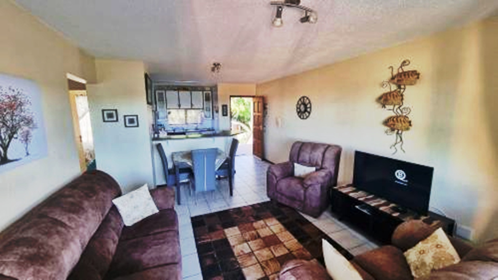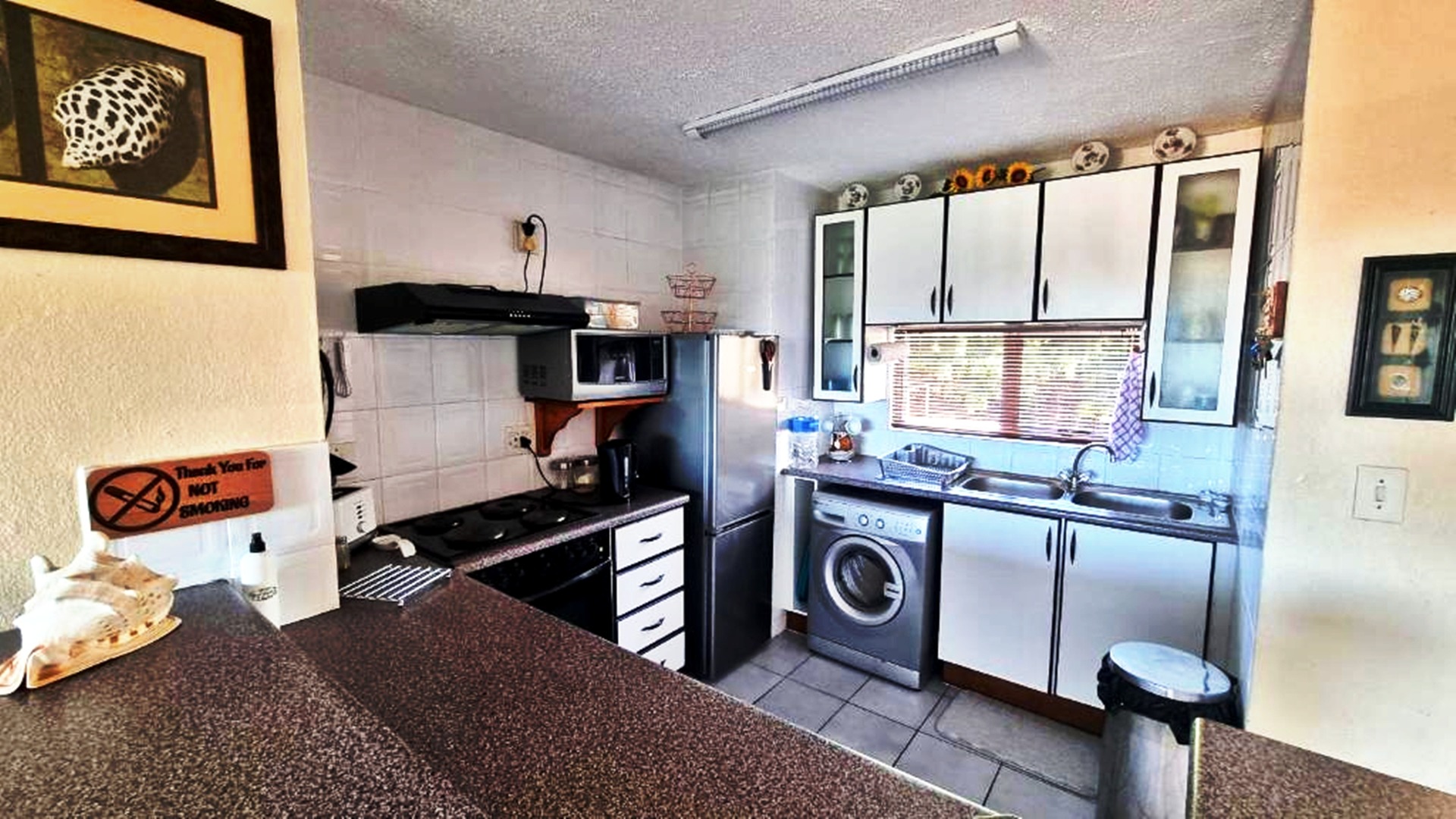 The open plan kitchen and lounge flow onto a private balcony. You overlook established gardens and the swimming pool. The setting feels calm and secure, with the beach only steps away.