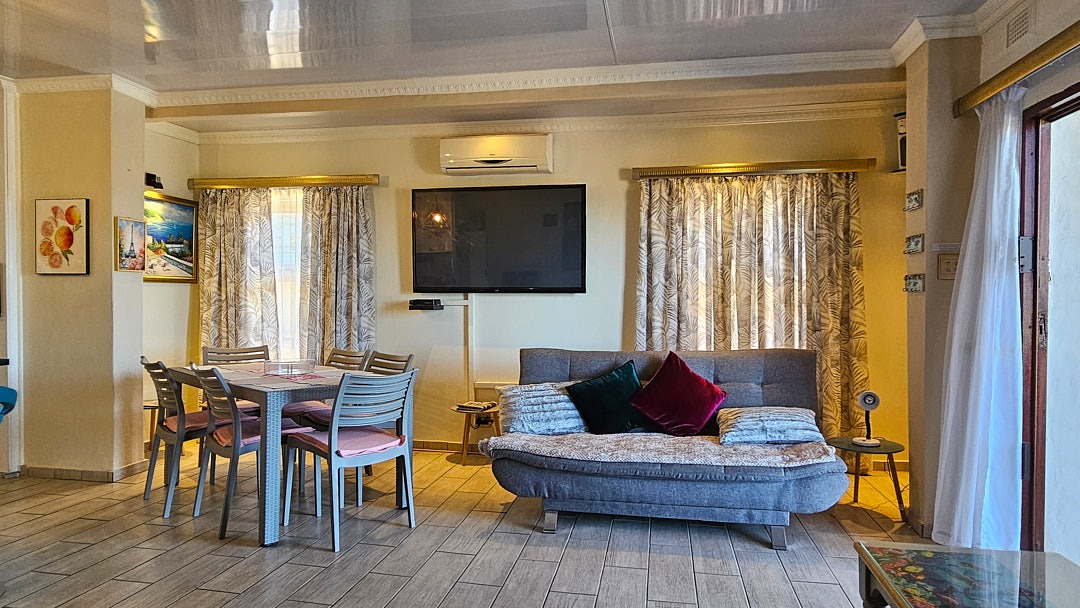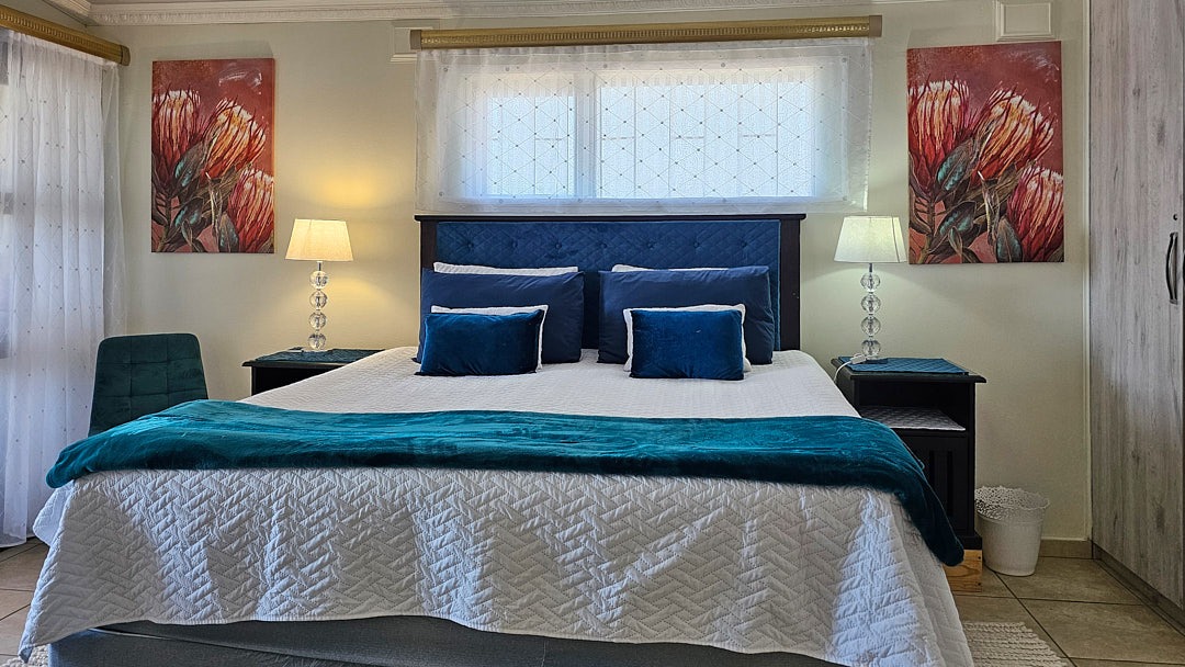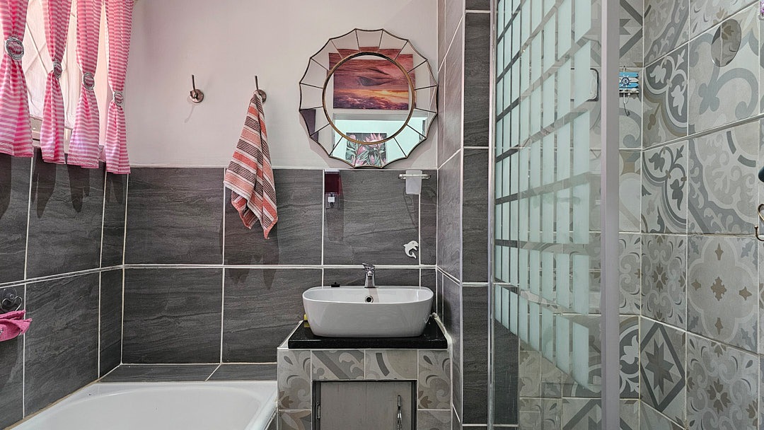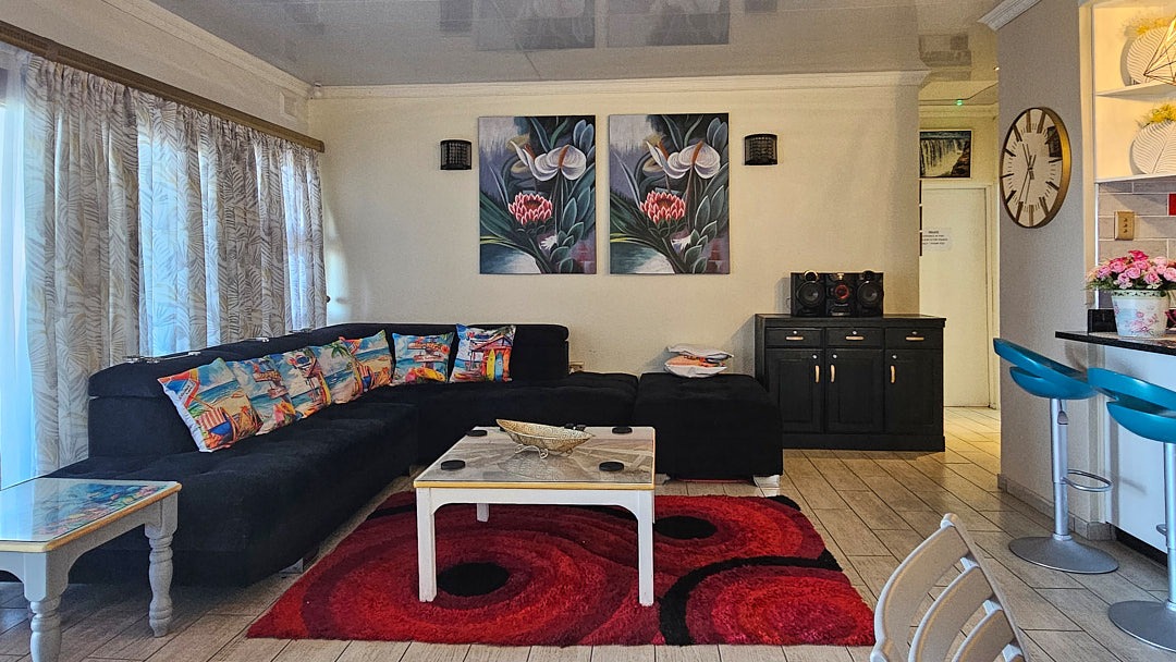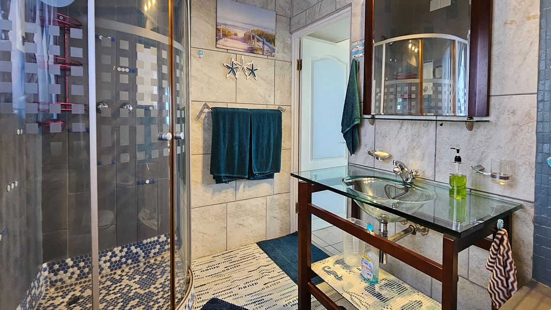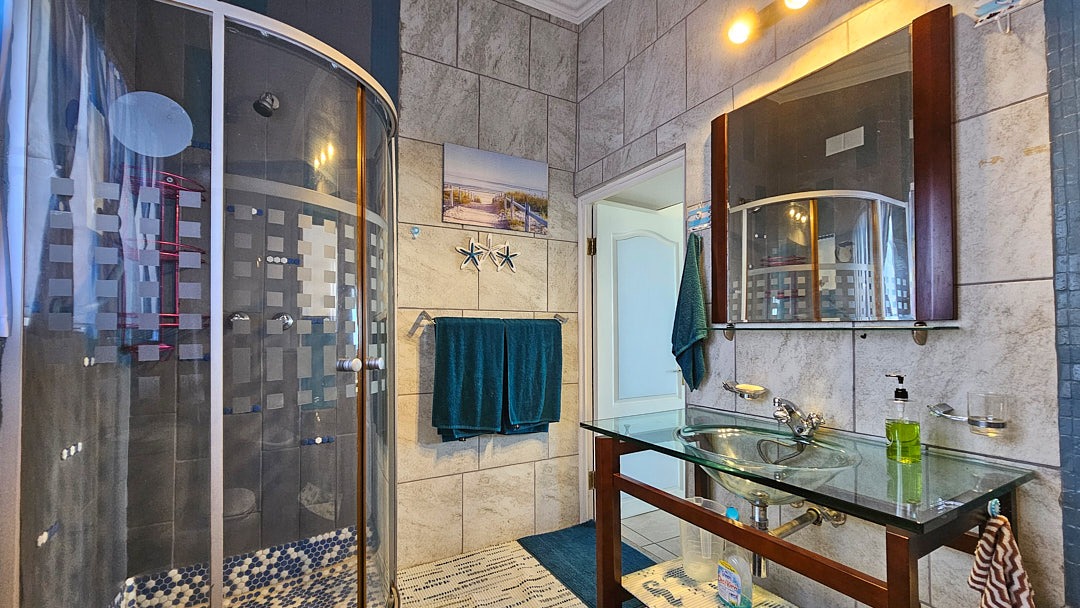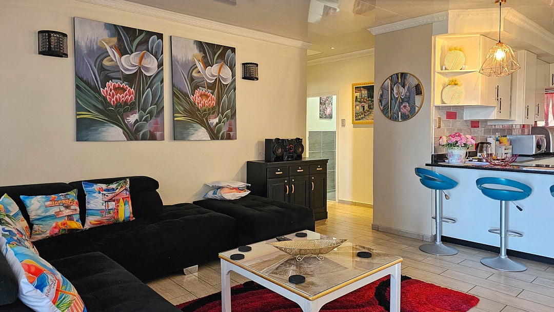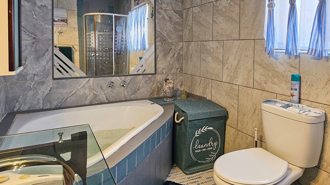 The 3 bedrooms are all spacious with the main bedroom and the 2nd bedroom being spoilt by the ocean views. The main bedroom is en-suite to a beautiful, spacious and modern full bathroom. No luxury has been spared, even a spa-bath! The bedroom has lots of stunning built-in cupboards and opens to a enclosed balcony. This can be ideal if you have a small child or a home office. Work away whilst peeking at the ocean!! The other 2 bedrooms are also super spacious and share another full, modern bathroom. Sheer luxury... The cherry on top is the solar system: no darkness for this house!!! Not with 17 panels! The sale includes all the curtains. This house has one lock-up garage and a double, covered parking behind another gate. Speaking of which, the security in this house is top-notch. An alarm with 8 cameras and a connection to a security company. There is a large back-up water tank as well. Ticking all the boxes....GIVE ME A CALL!
