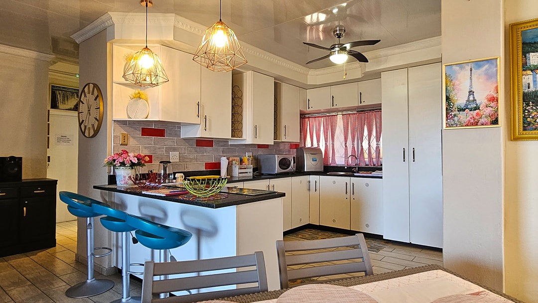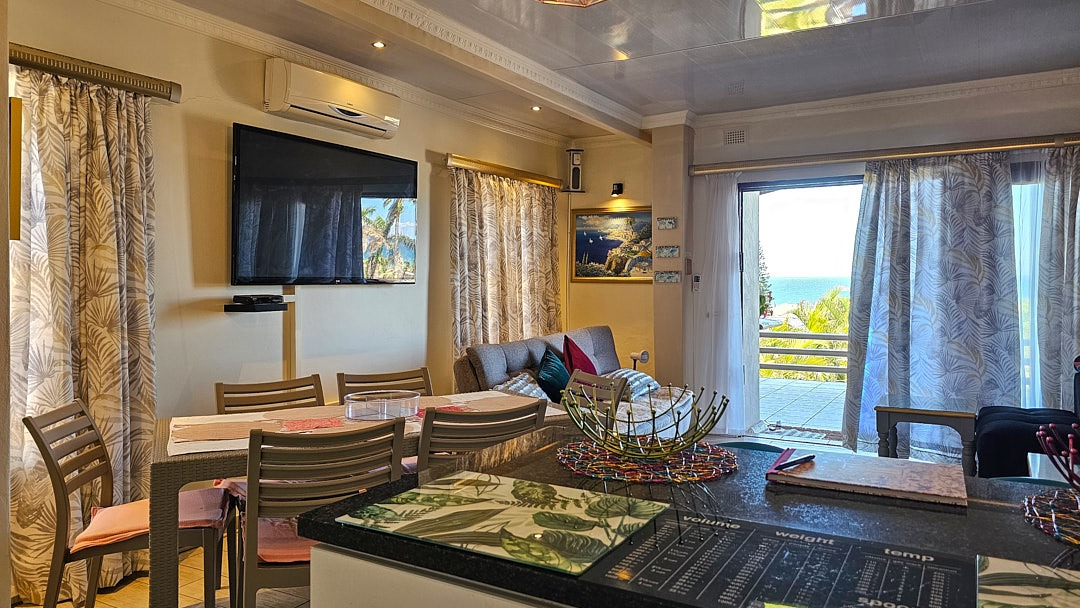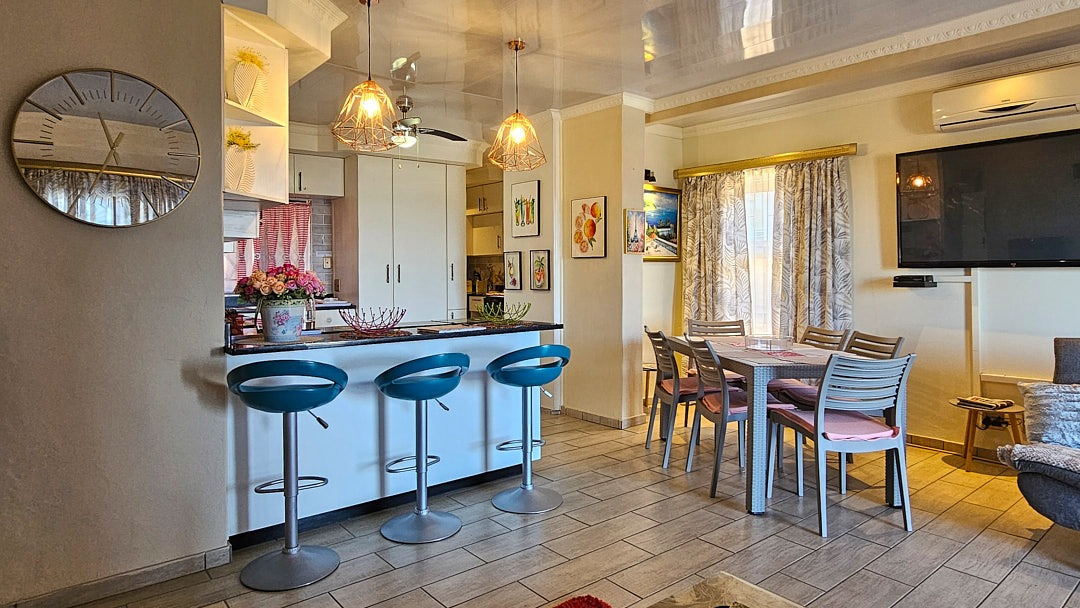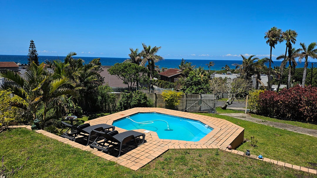 This house is a DREAM COME TRUE house!! Recently modernized, you are going to fall in love...just like I did. When you are inside the lounge , a glass sliding door opens to a spacious. under-cover patio with a built-in bar AND braai. The view is spectacular... indeed SPECTACULAR! 180 Degree sea views that can be quite overwhelming in it's blue mass of ocean! In front of the patio lies a delightful swimming pool where you can relax and enjoy the sun. While this house definitely accommodates outside entertainment, it is also spacious and super modern inside. The open plan dining room/ lounge/ kitchen is light and airy, modern and luxurious. Small touches like the down lights make all the difference from modern, to luxuriously modern. The kitchen is a delight with it's granite counter tops and dining counter. You can very well enjoy ocean views whilst you are cooking... sheer bliss!! The kitchen has a scullery for all your appliances with a back door to the outside.