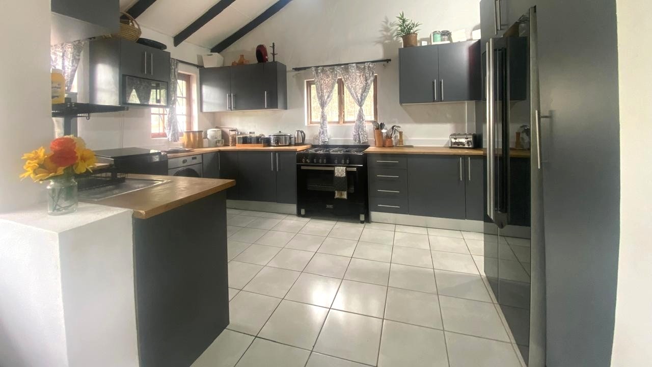The modern kitchen is a highlight, boasting sleek dark grey cabinetry, light wood-look countertops. High vaulted ceilings with exposed beams add character and spaciousness. The home provides four well-proportioned bedrooms, with one featuring an en-suite bathroom, ensuring comfort and privacy for all residents.