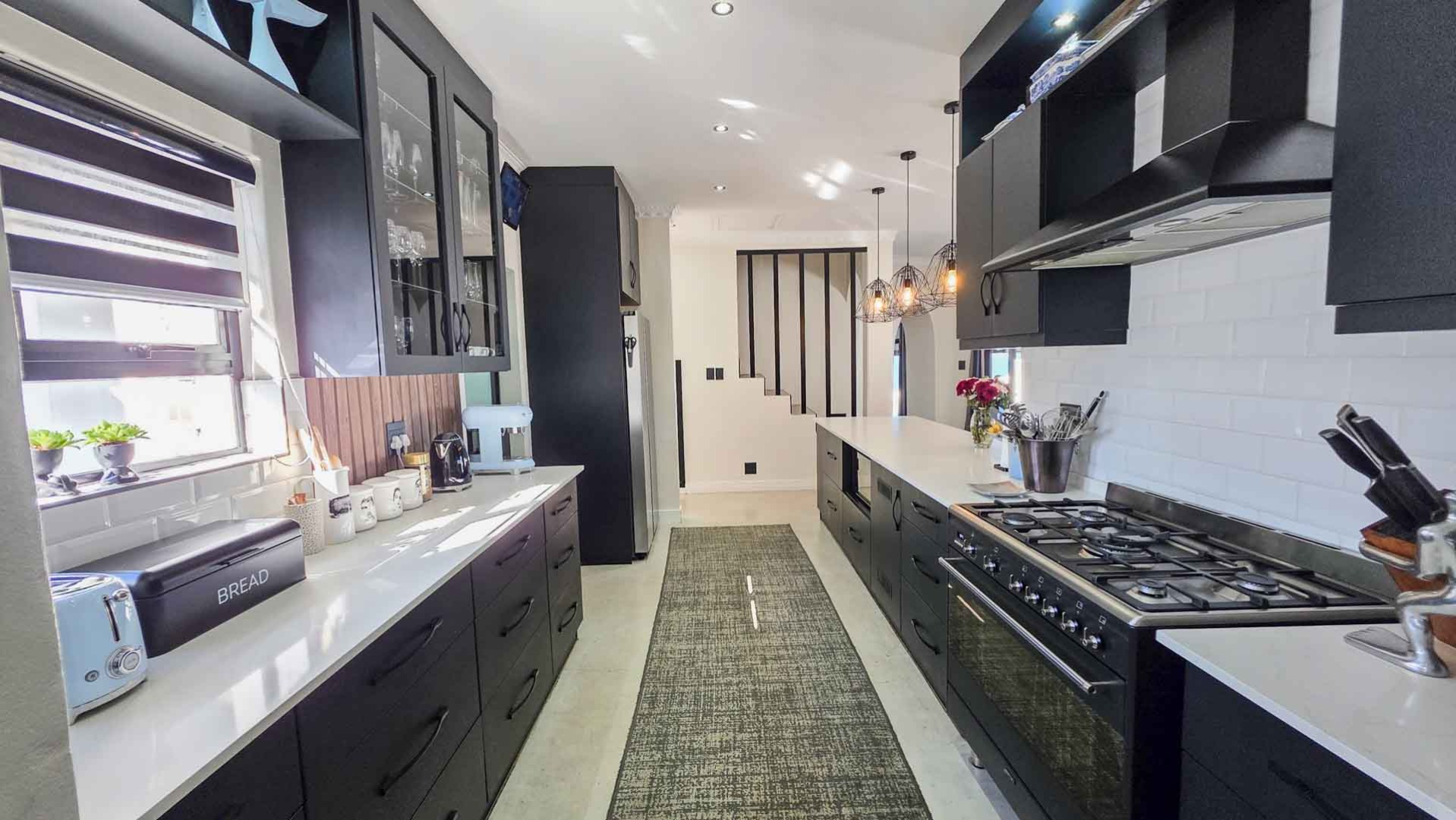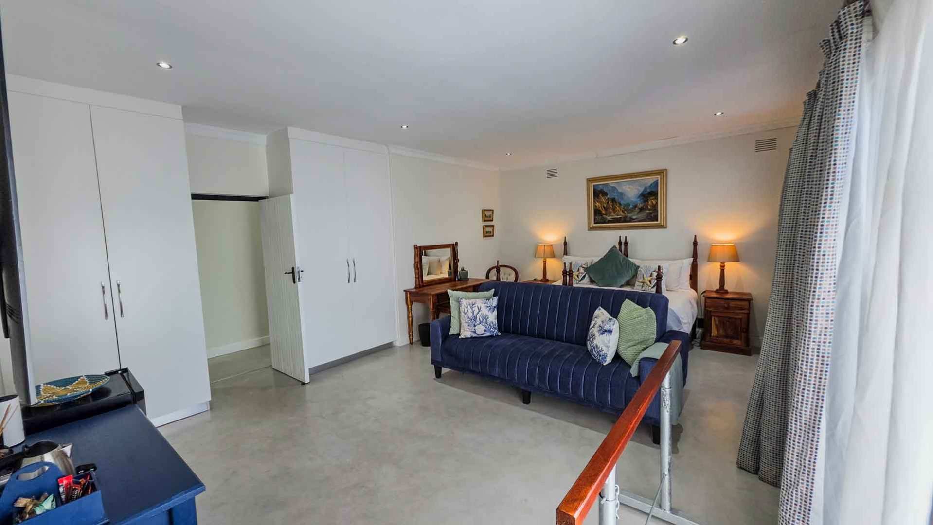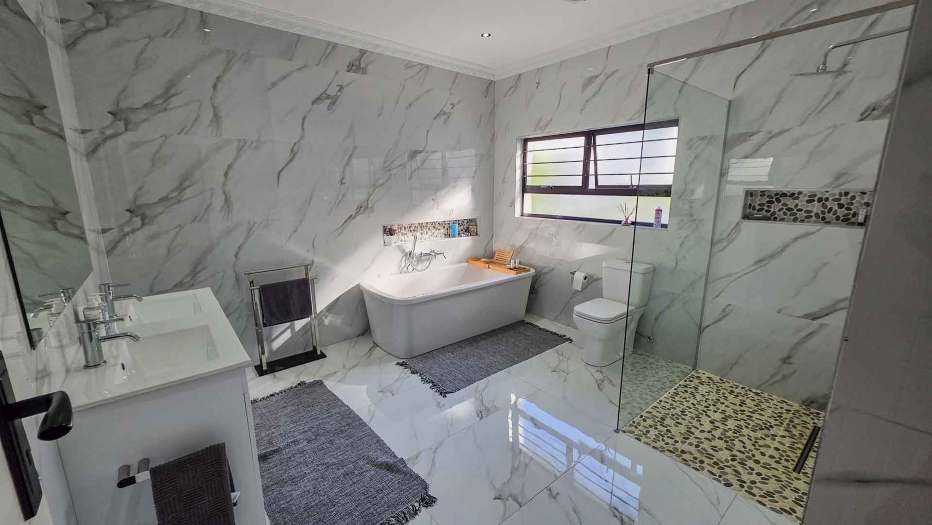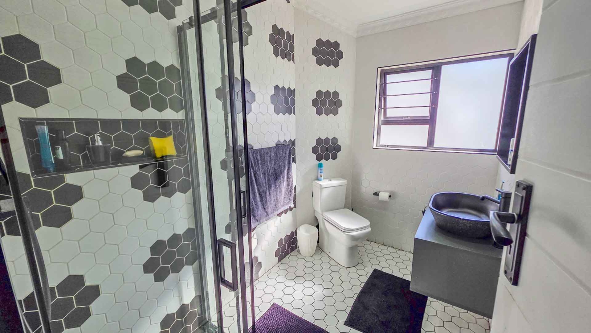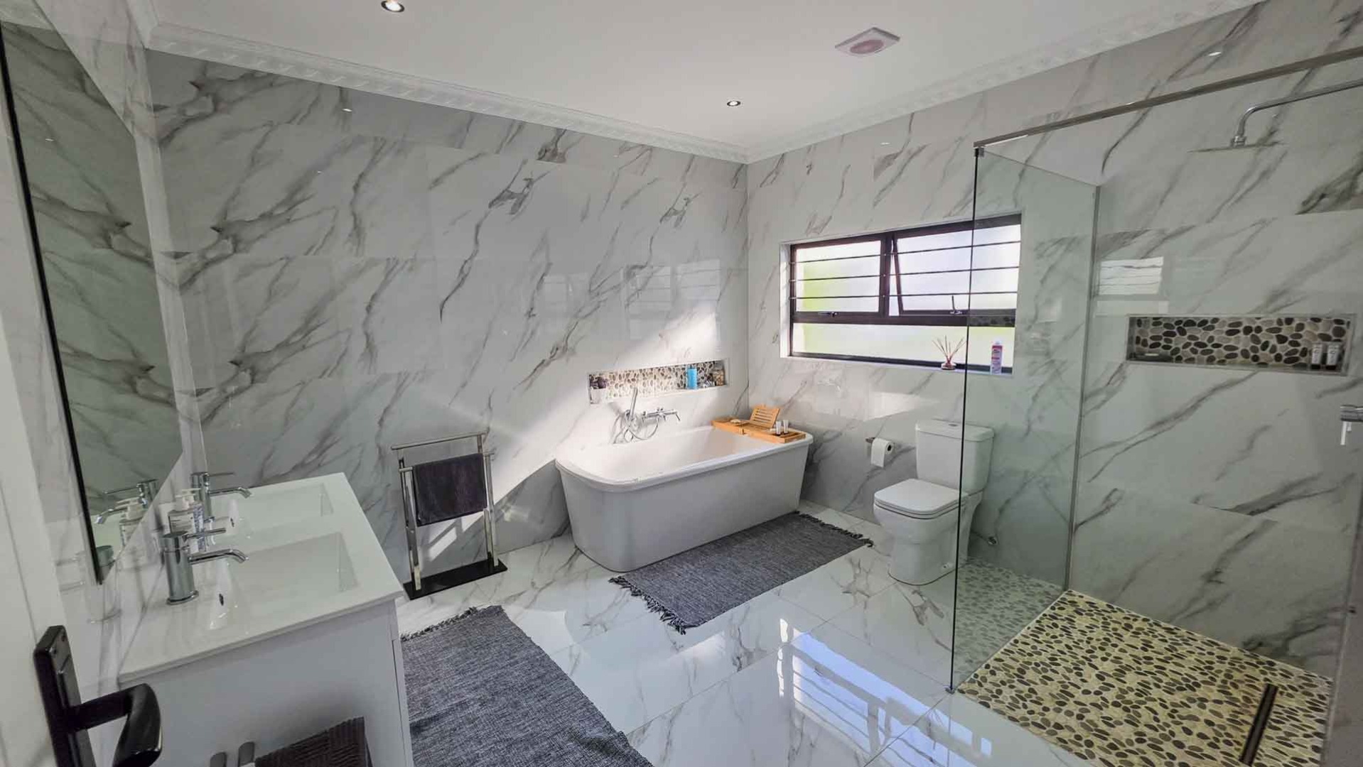Every bathroom is fully tiled to the ceiling with a combination of bath and shower options to suit all preferences. The living areas are spacious and light-filled – the lounge has big picture windows framing the lush garden and sparkling pool, and the dining room connects to both the kitchen and an enclosed entertainment/sunroom via sliding doors. It’s the kind of space that invites long summer braais and lazy afternoons with friends and family. The kitchen is a chef’s dream – modern, sleek, and functional with a separate scullery and pantry. Upstairs, there’s a fantastic bonus: a games room or bar area (currently used as a gym/home office) – perfect for entertaining, and its own private balcony with amazing sea views. There’s also a separate flatlet that links the kitchen and garages, as well as a dedicated outside laundry space. The home boasts a double, extra-spacious, automated garage. But what truly sets this property apart are the thoughtful eco-friendly features. It’s equipped with a solar power system and a generous 14kW battery backup, as well as a 5,200L water tank – giving you peace of mind and long-term sustainability.