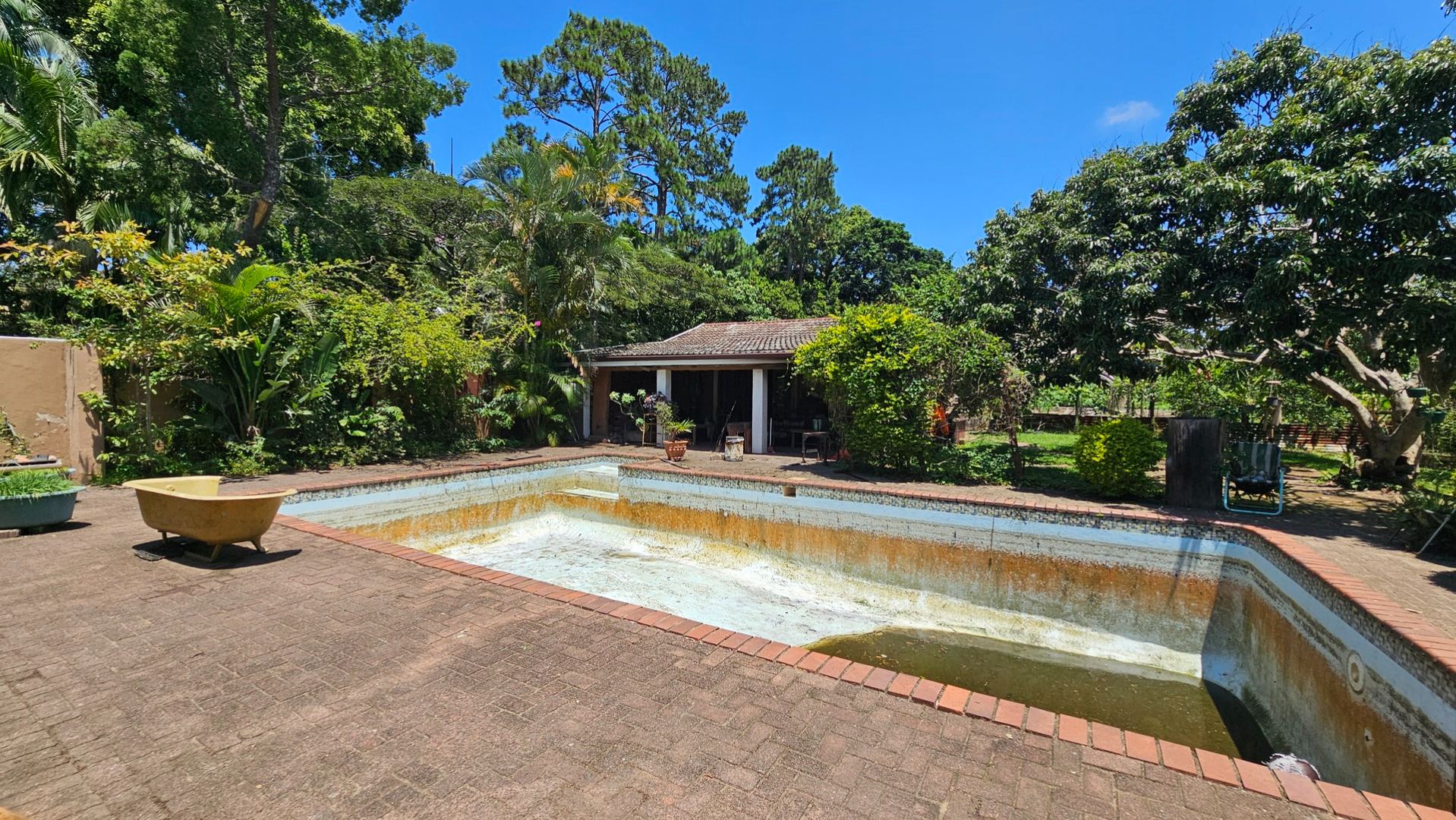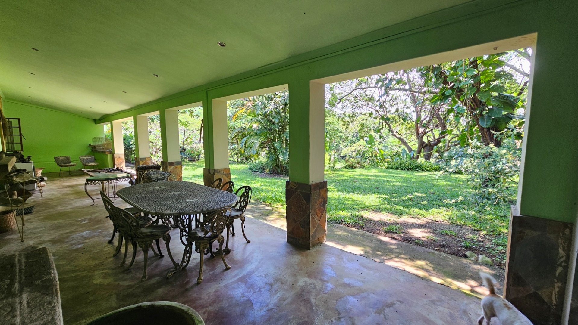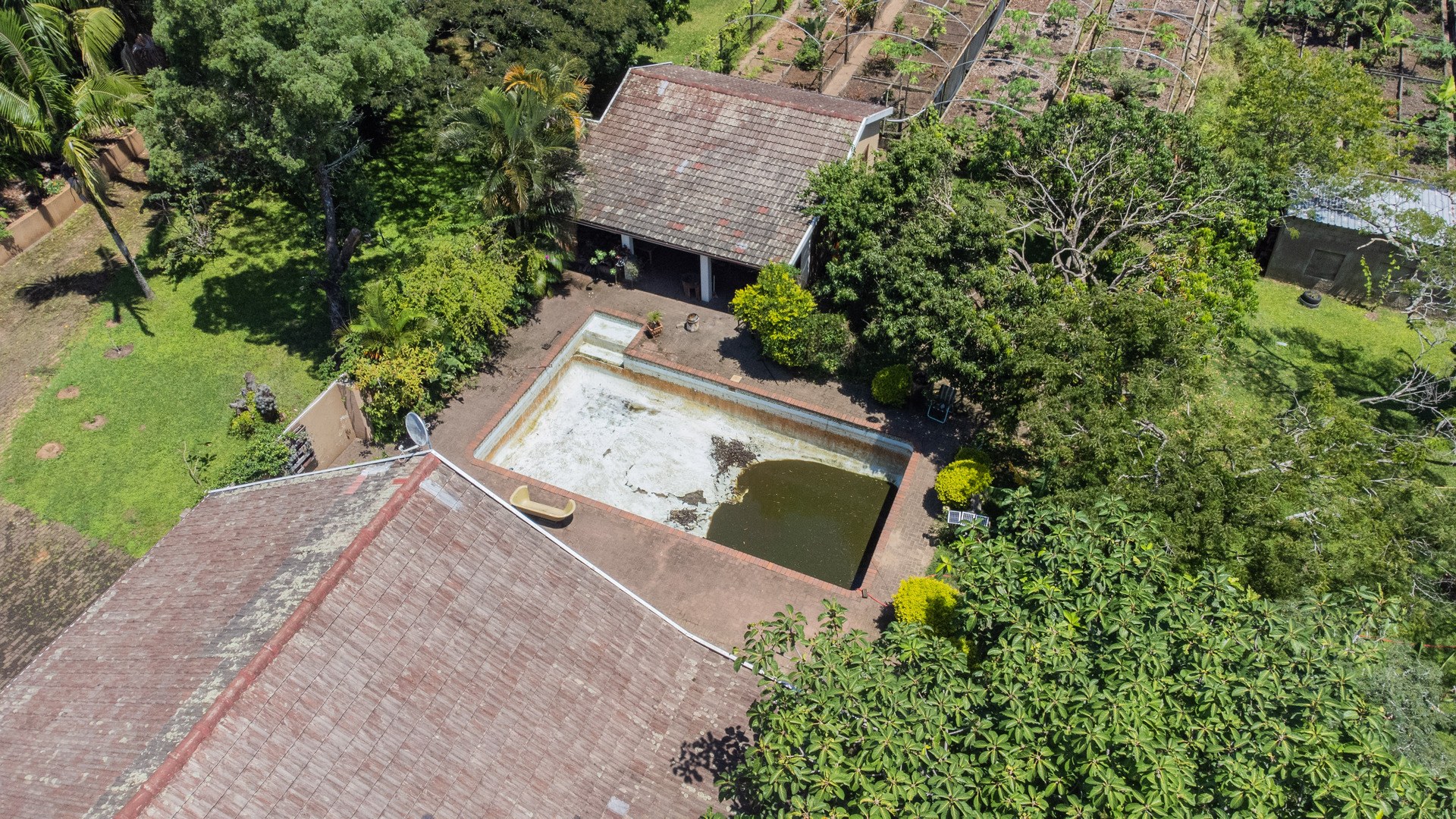 Just beyond the patio to the left of the house is the pool and entertainment area, featuring a large swimming pool (in need of repair)