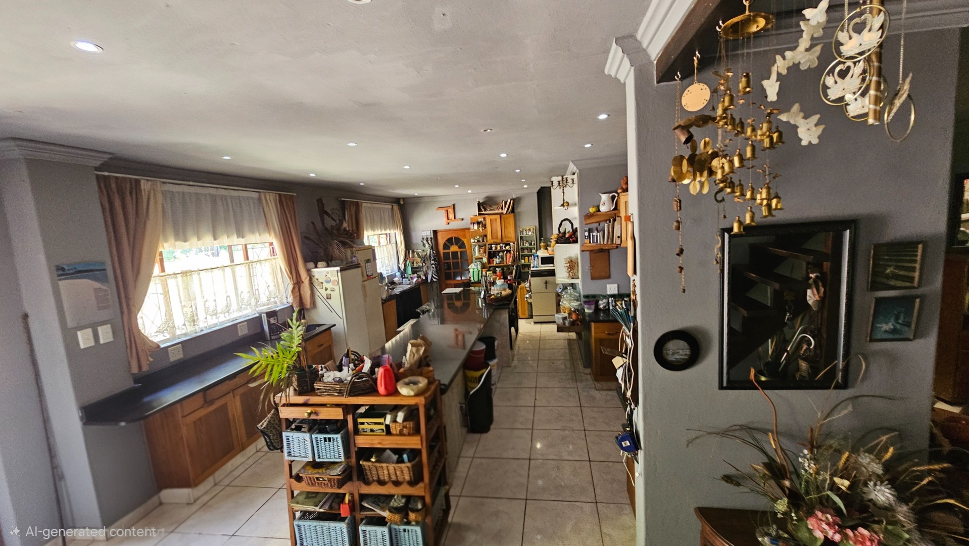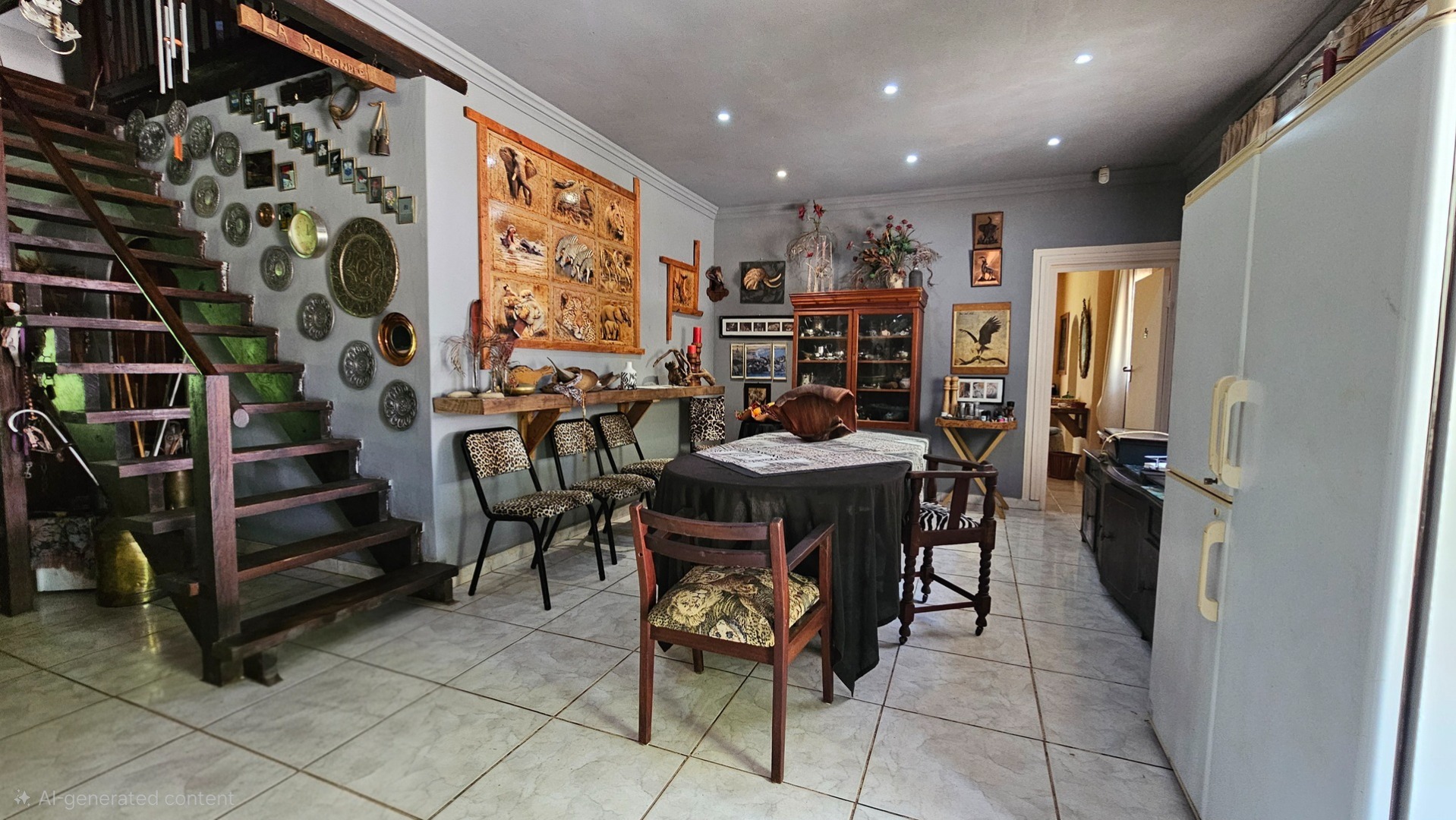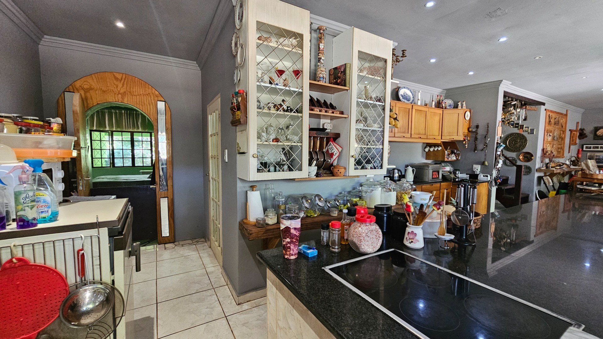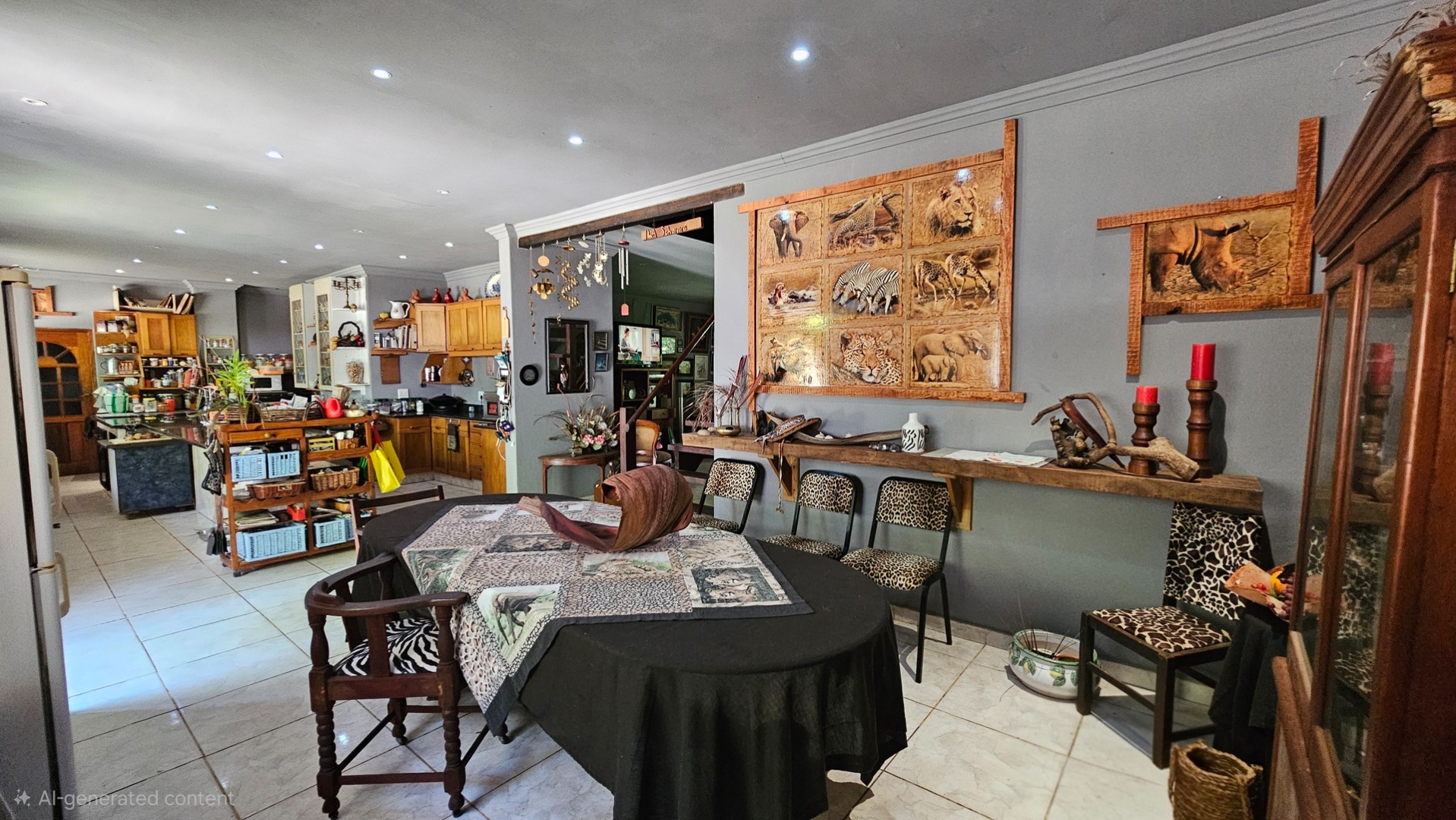 The property is set on an expansive 8 921 m² stand, surrounded by beautiful, established gardens with mature trees, fruit trees, vegetable patches, and abundant plant life Entering the home through the farmhouse-style kitchen, you are immediately welcomed by the scale and character of this spacious property. The kitchen truly is the heart of the home, offering ample cupboard space, a pantry, granite countertops, a prepping basin, two under-counter ovens, a glass hob, and a generous breakfast nook that comfortably seats at least eight people. There are fittings for both a washing machine and dishwasher, and garages provide direct access into the kitchen for added convenience. The kitchen flows effortlessly into the large dining room, from where stairs lead up to a versatile loft area ideal for storage, an office, or an additional room.