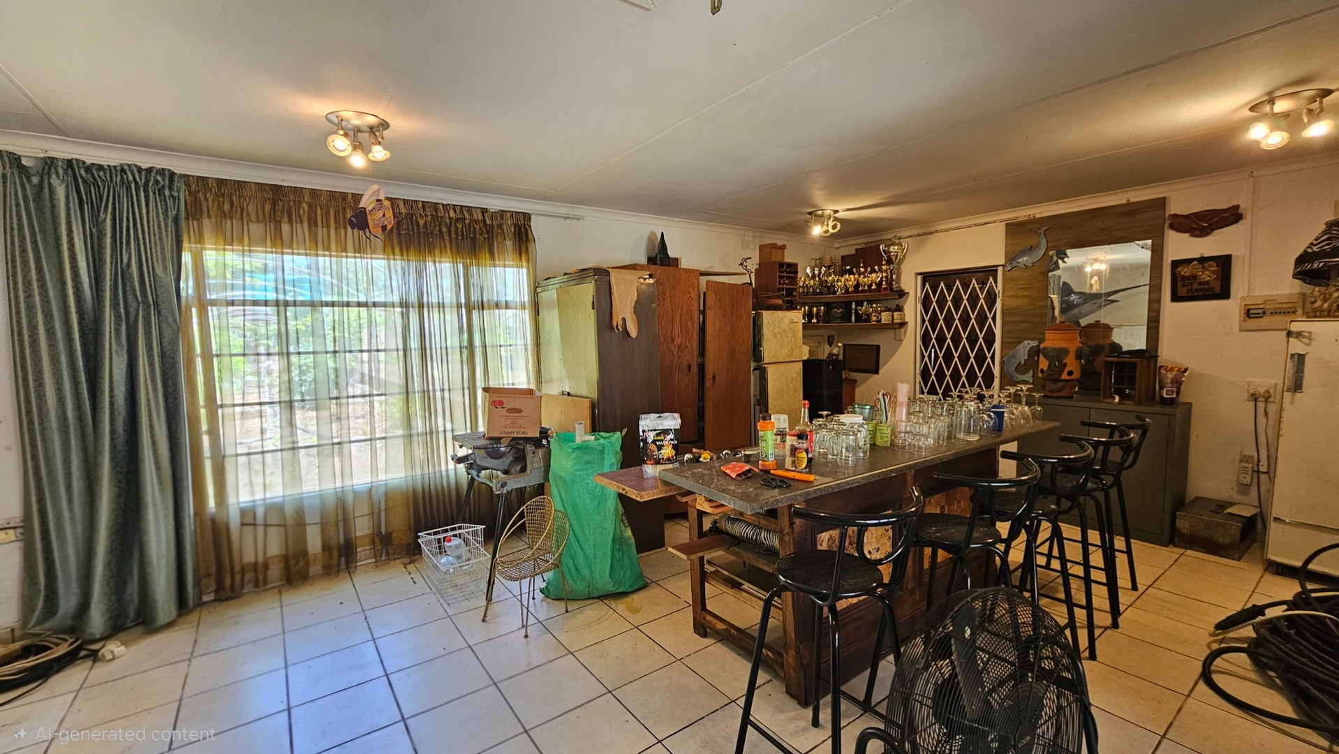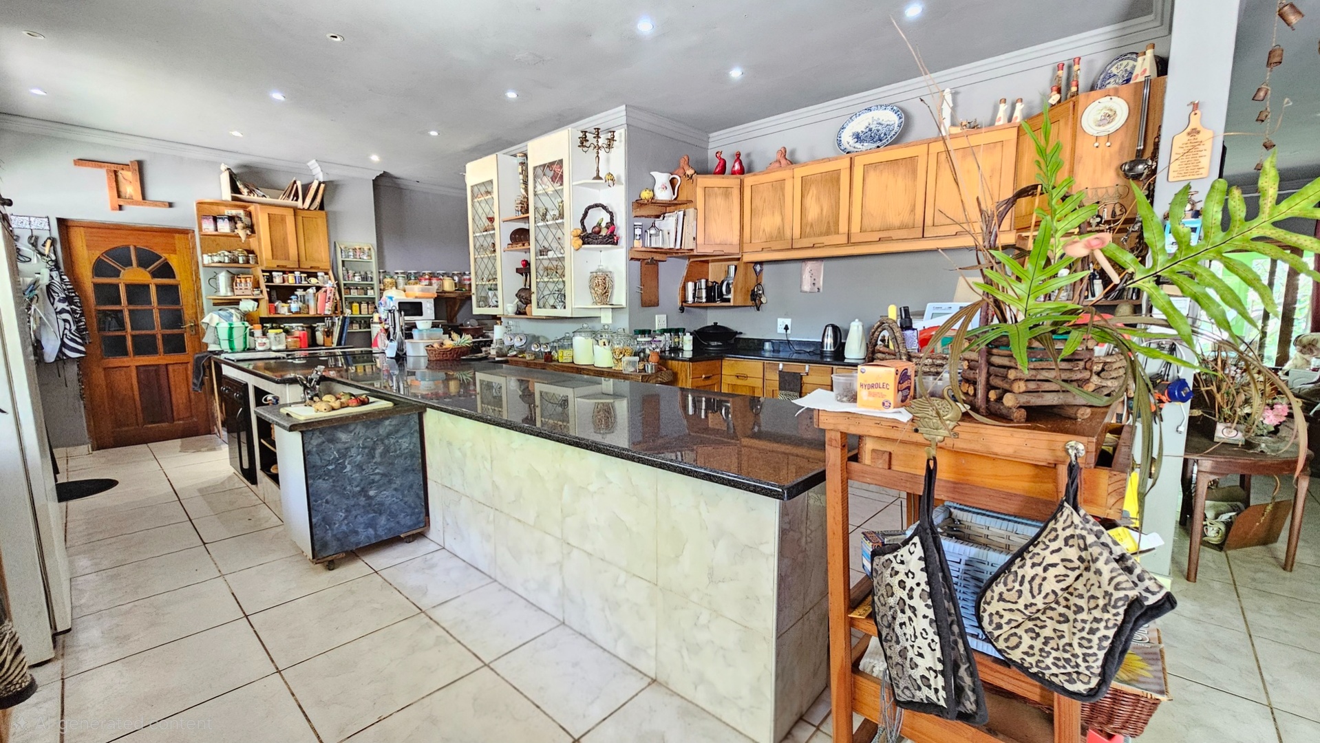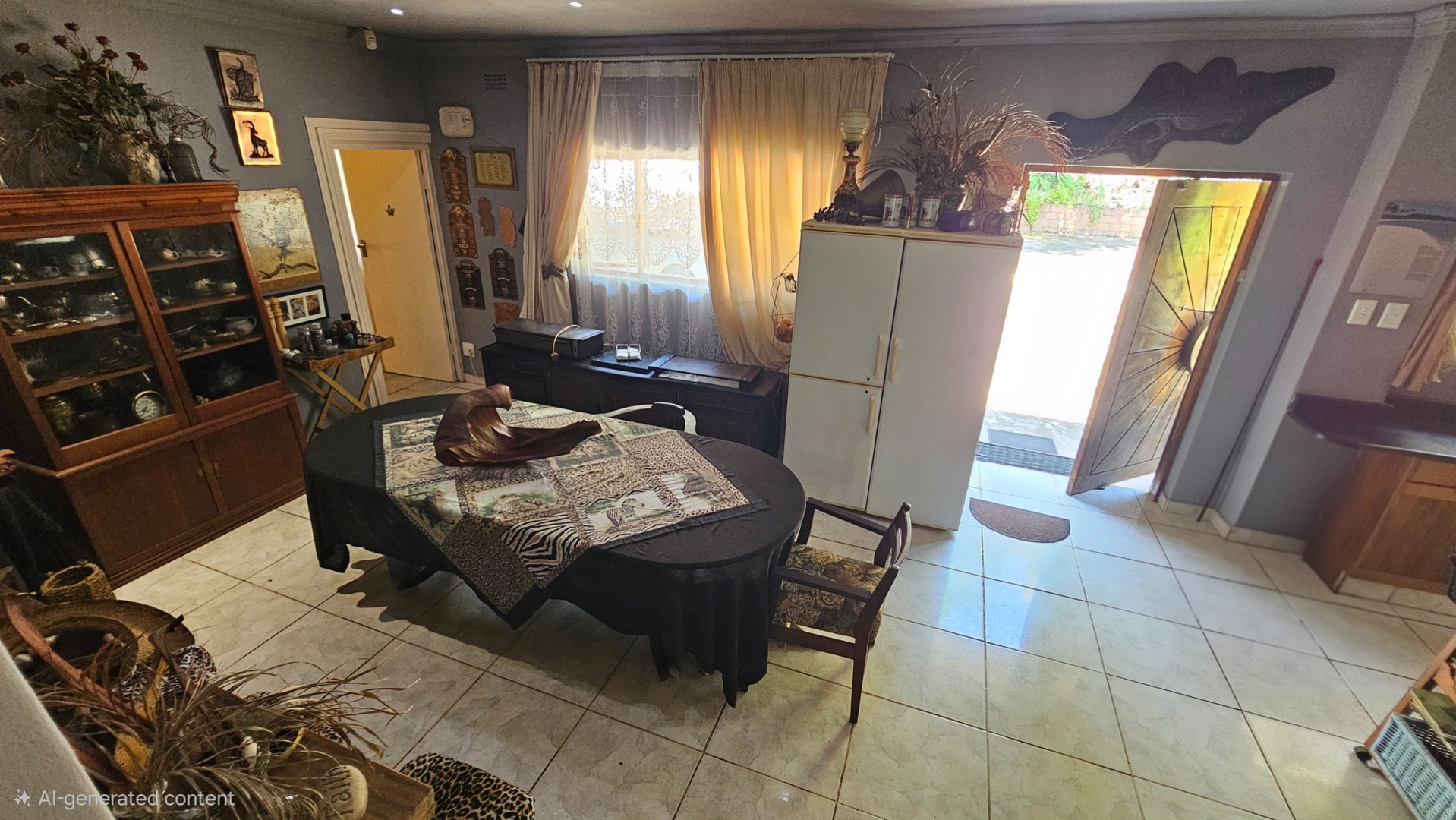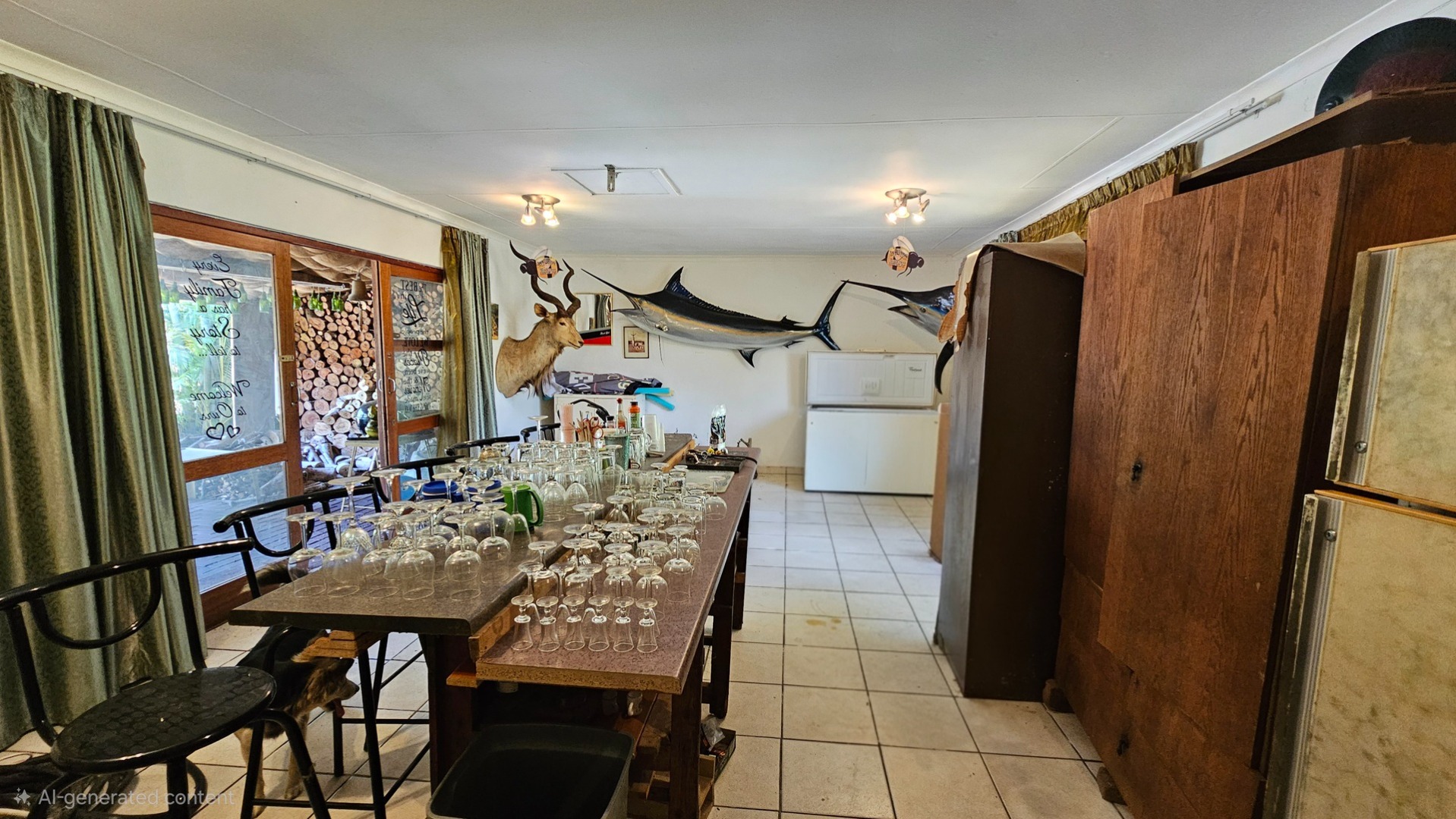 The property is set on an expansive 8 921 m² stand, surrounded by beautiful, established gardens with mature trees, fruit trees, vegetable patches, and abundant plant life Entering the home through the farmhouse-style kitchen, you are immediately welcomed by the scale and character of this spacious property. The kitchen truly is the heart of the home, offering ample cupboard space, a pantry, granite countertops, a prepping basin, two under-counter ovens, a glass hob, and a generous breakfast nook that comfortably seats at least eight people. There are fittings for both a washing machine and dishwasher, and garages provide direct access into the kitchen for added convenience. The kitchen flows effortlessly into the large dining room, from where stairs lead up to a versatile loft area ideal for storage, an office, or an additional room.