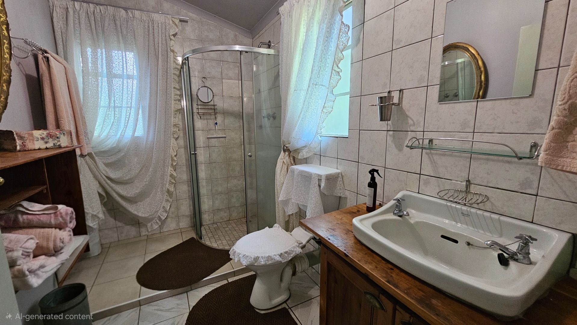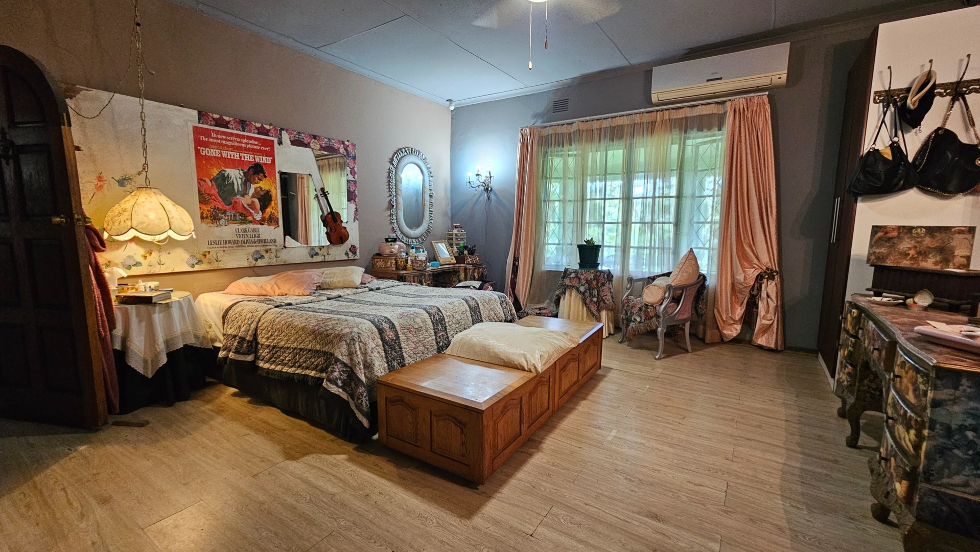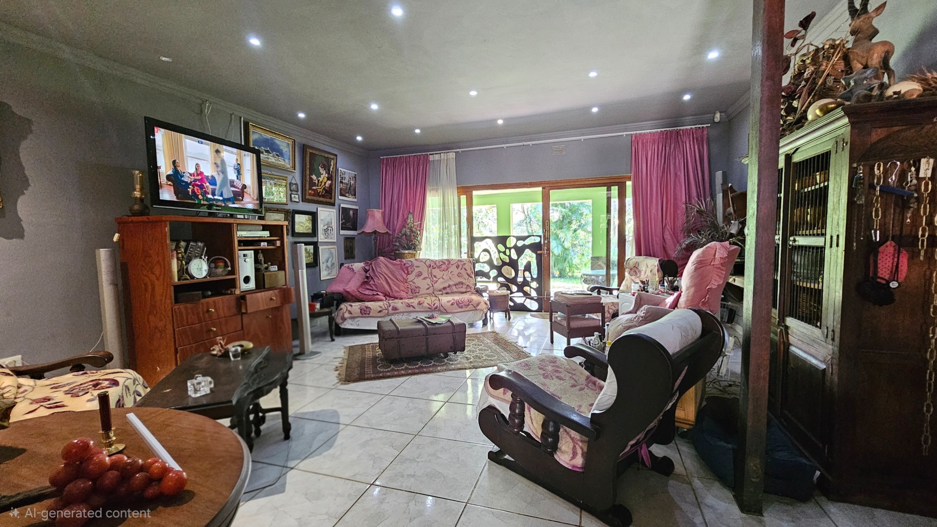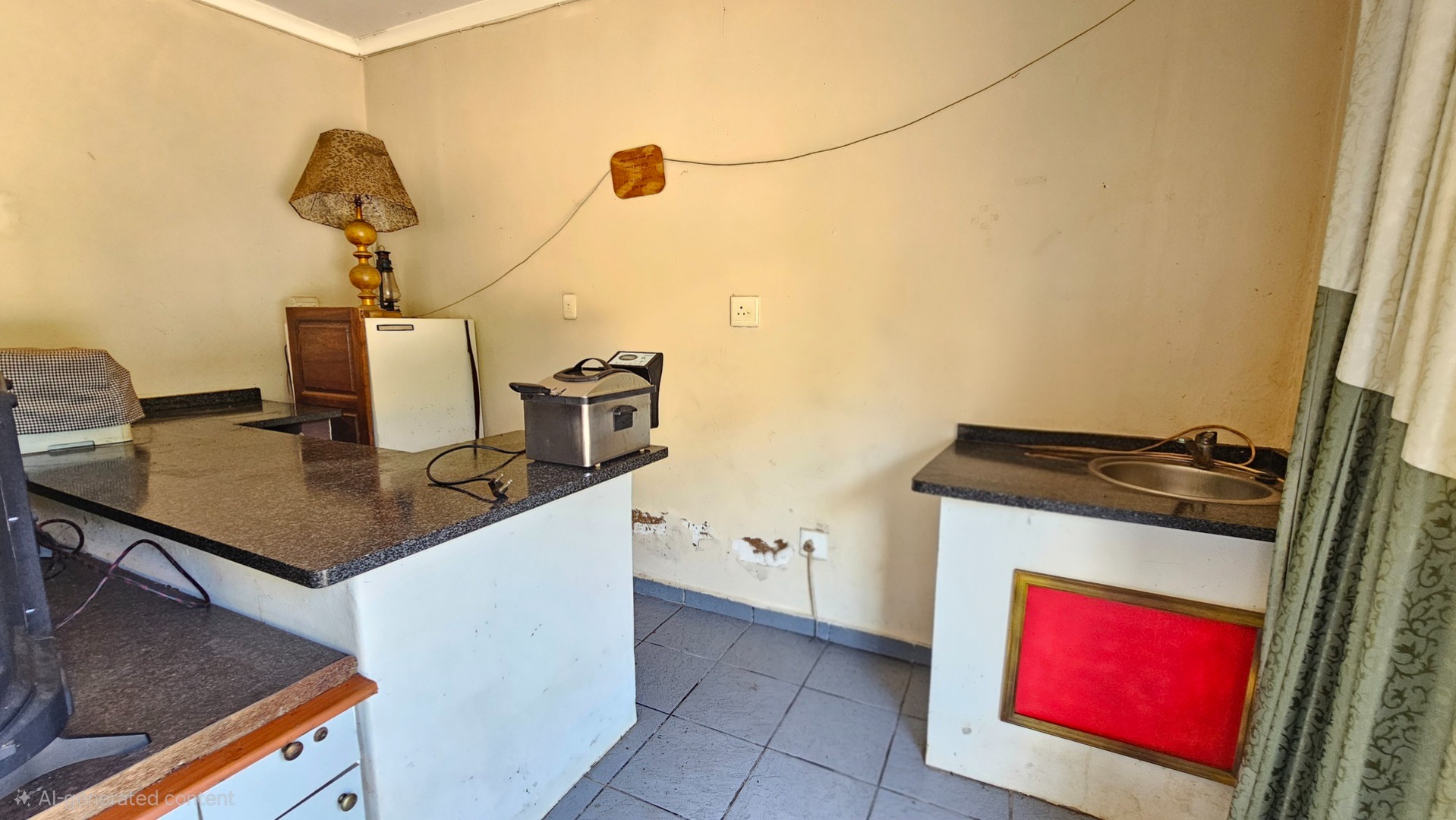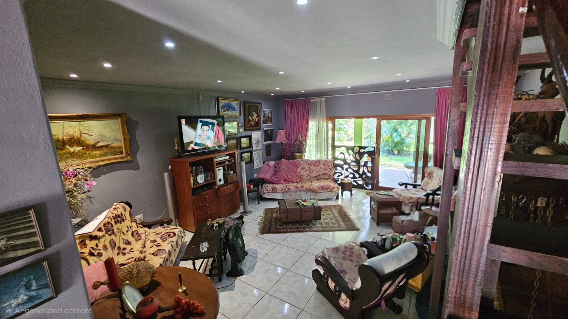 The property is set on an expansive 8 921 m² stand, surrounded by beautiful, established gardens with mature trees, fruit trees, vegetable patches, and abundant plant life Entering the home through the farmhouse-style kitchen, you are immediately welcomed by the scale and character of this spacious property. The kitchen truly is the heart of the home, offering ample cupboard space, a pantry, granite countertops, a prepping basin, two under-counter ovens, a glass hob, and a generous breakfast nook that comfortably seats at least eight people. There are fittings for both a washing machine and dishwasher, and garages provide direct access into the kitchen for added convenience. The kitchen flows effortlessly into the large dining room, from where stairs lead up to a versatile loft area ideal for storage, an office, or an additional room.