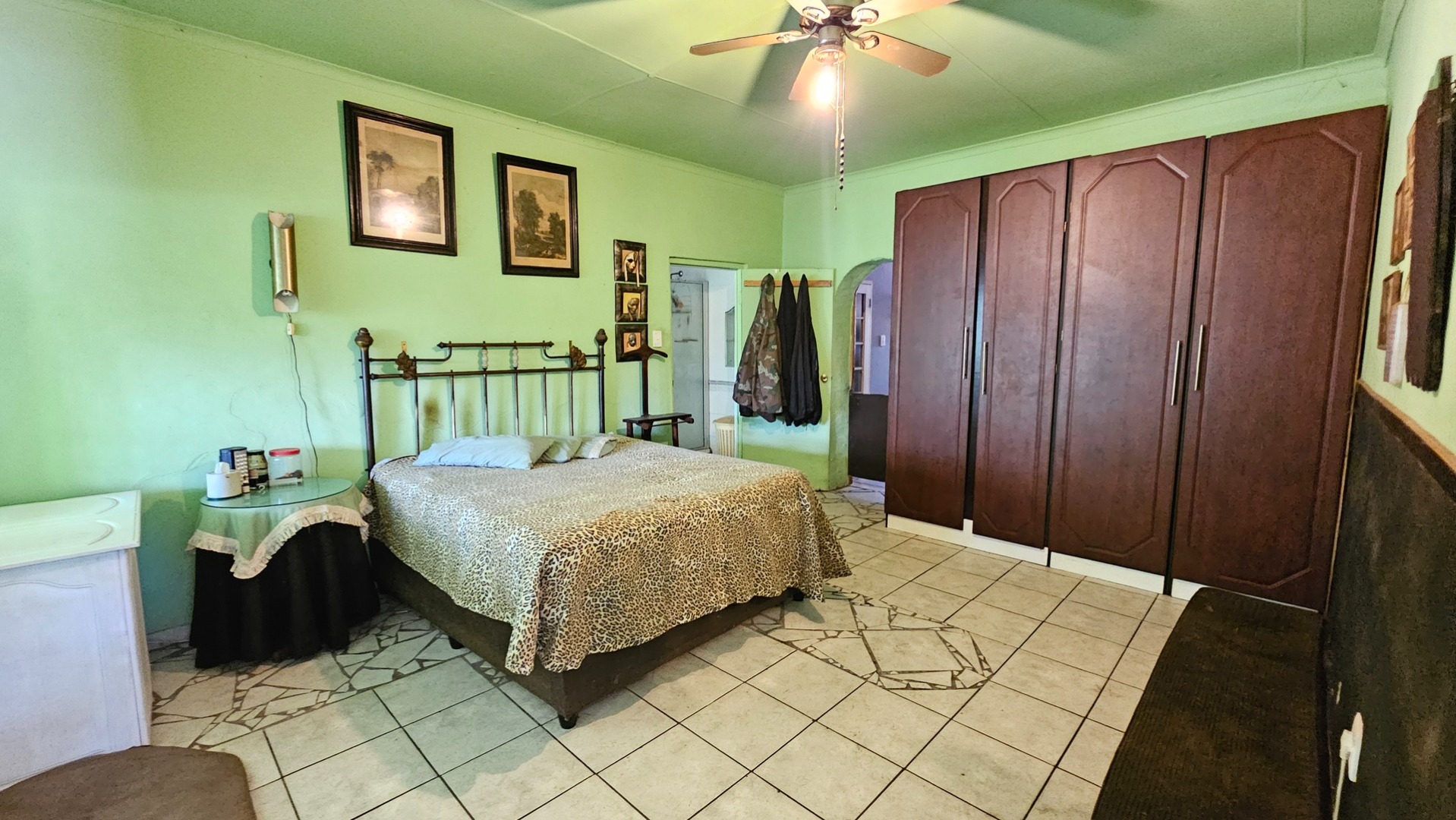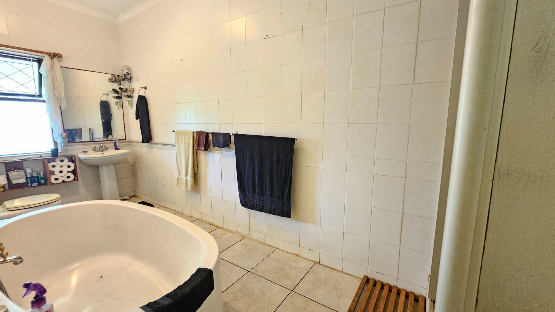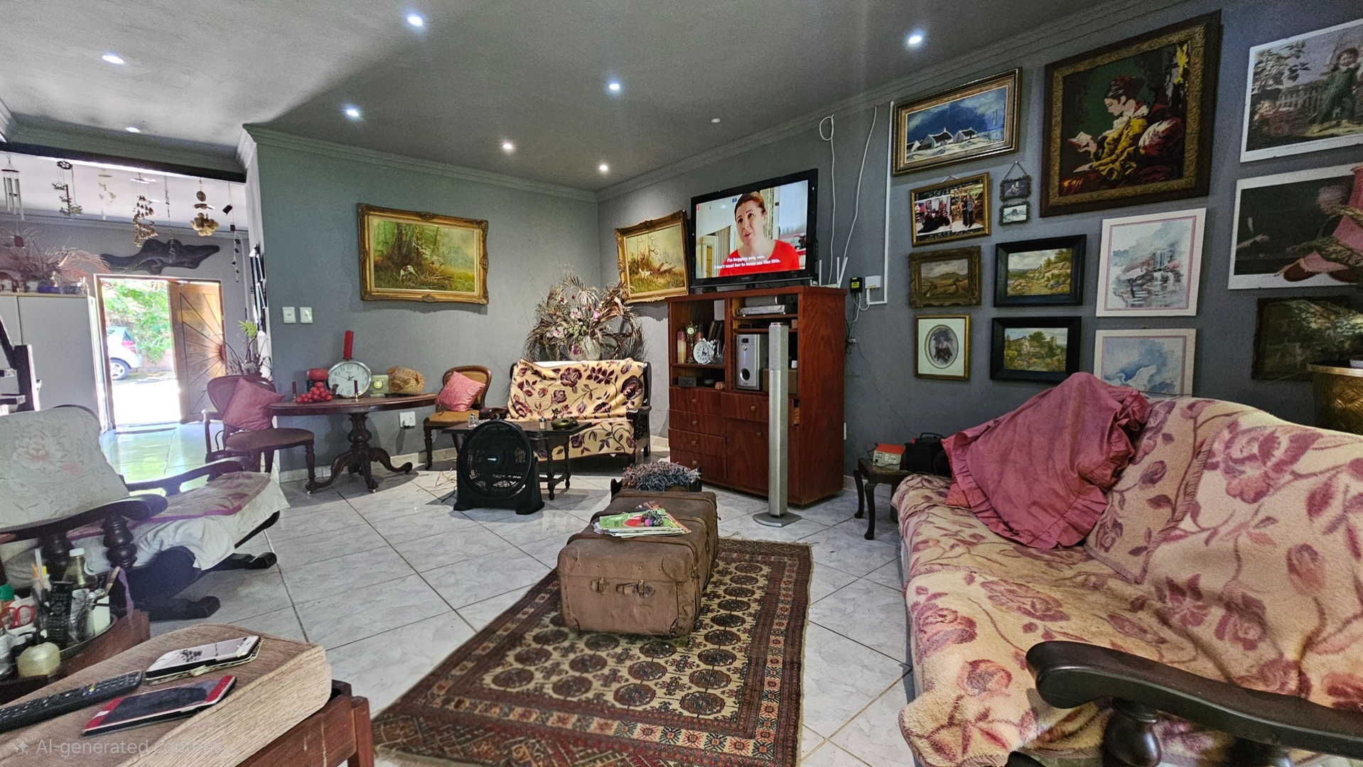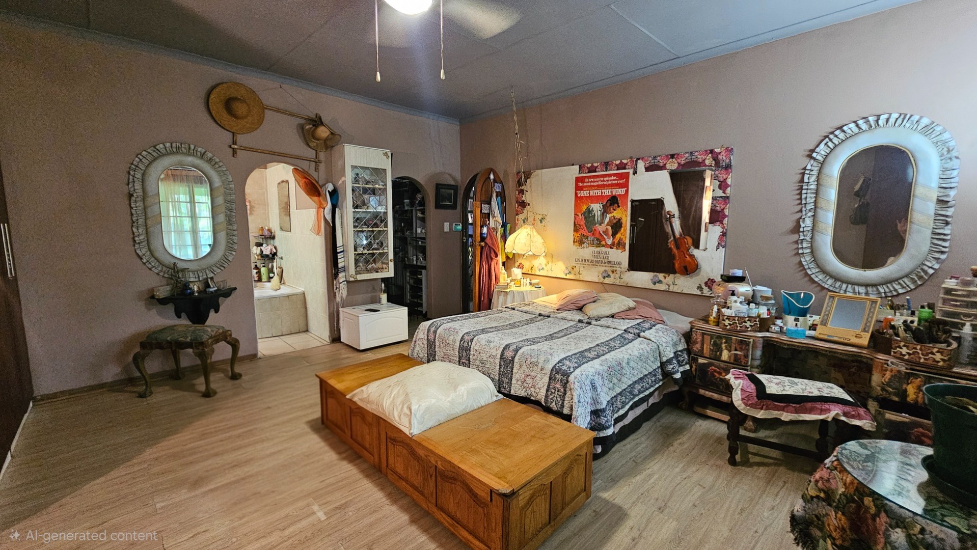 The property is set on an expansive 8 921 m² stand, surrounded by beautiful, established gardens with mature trees, fruit trees, vegetable patches, and abundant plant life Entering the home through the farmhouse-style kitchen, you are immediately welcomed by the scale and character of this spacious property. The kitchen truly is the heart of the home, offering ample cupboard space, a pantry, granite countertops, a prepping basin, two under-counter ovens, a glass hob, and a generous breakfast nook that comfortably seats at least eight people. There are fittings for both a washing machine and dishwasher, and garages provide direct access into the kitchen for added convenience. The kitchen flows effortlessly into the large dining room, from where stairs lead up to a versatile loft area ideal for storage, an office, or an additional room.