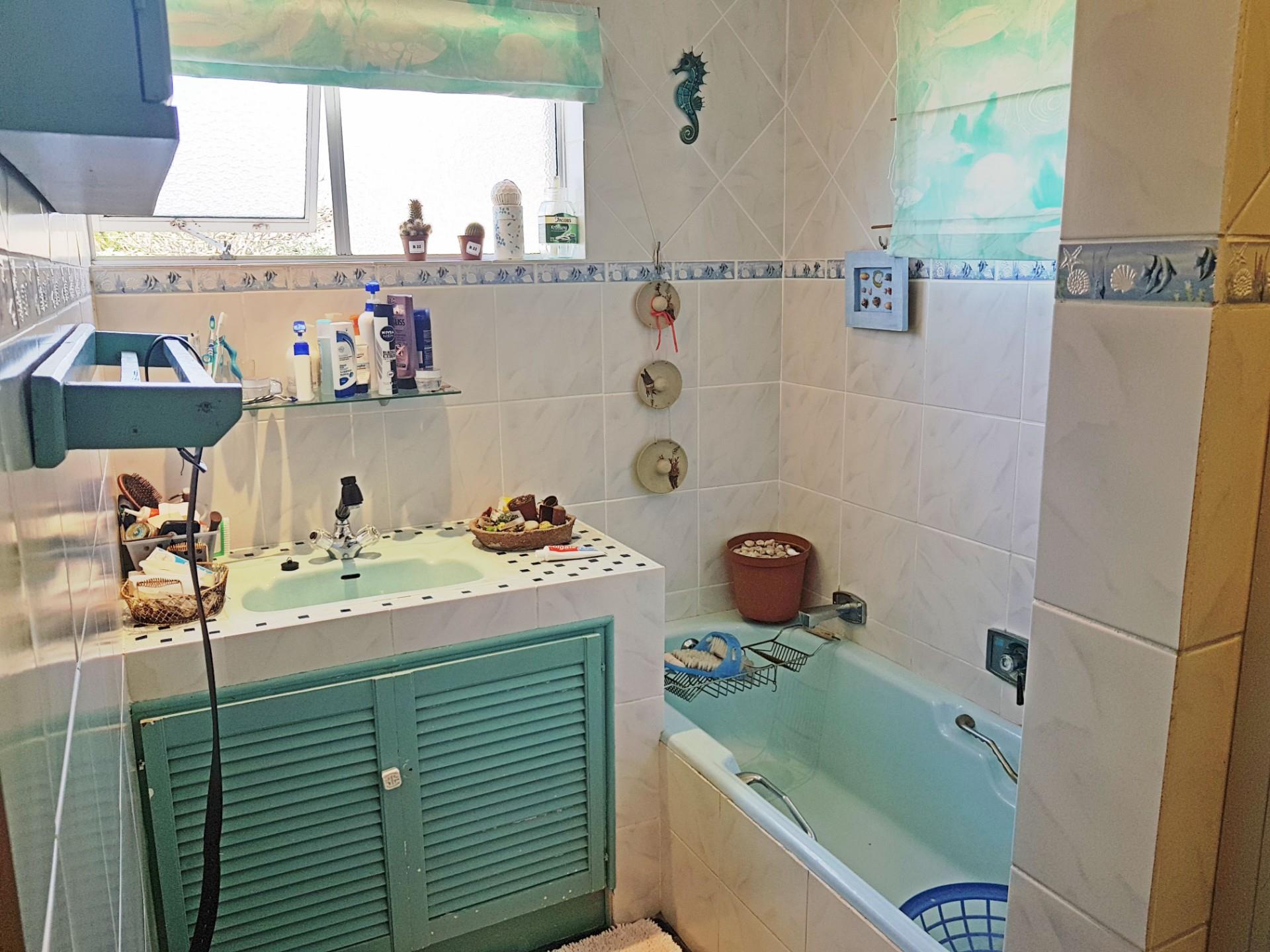 The flat, a spacious 130m², offers three bedrooms, two bathrooms (main en-suite), a lounge, dining area, and a compact kitchenette. A store room provides additional convenience, and both the main bedroom and lounge open onto a charming sea-facing patio.