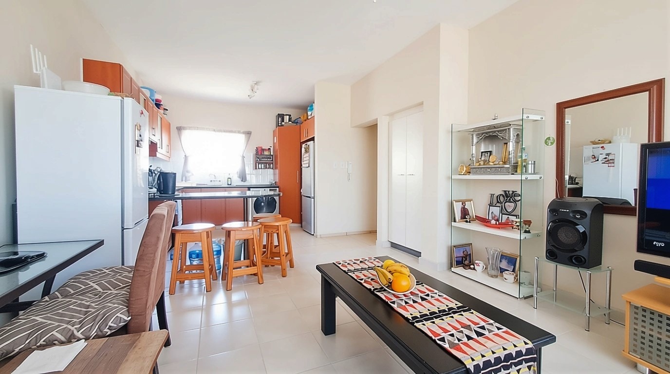 The interior features an open-plan layout, seamlessly connecting the welcoming lounge to a well-appointed kitchen, complete with a convenient pantry. Two comfortable bedrooms provide ample accommodation, complemented by a single modern bathroom, ensuring a practical and functional living environment.