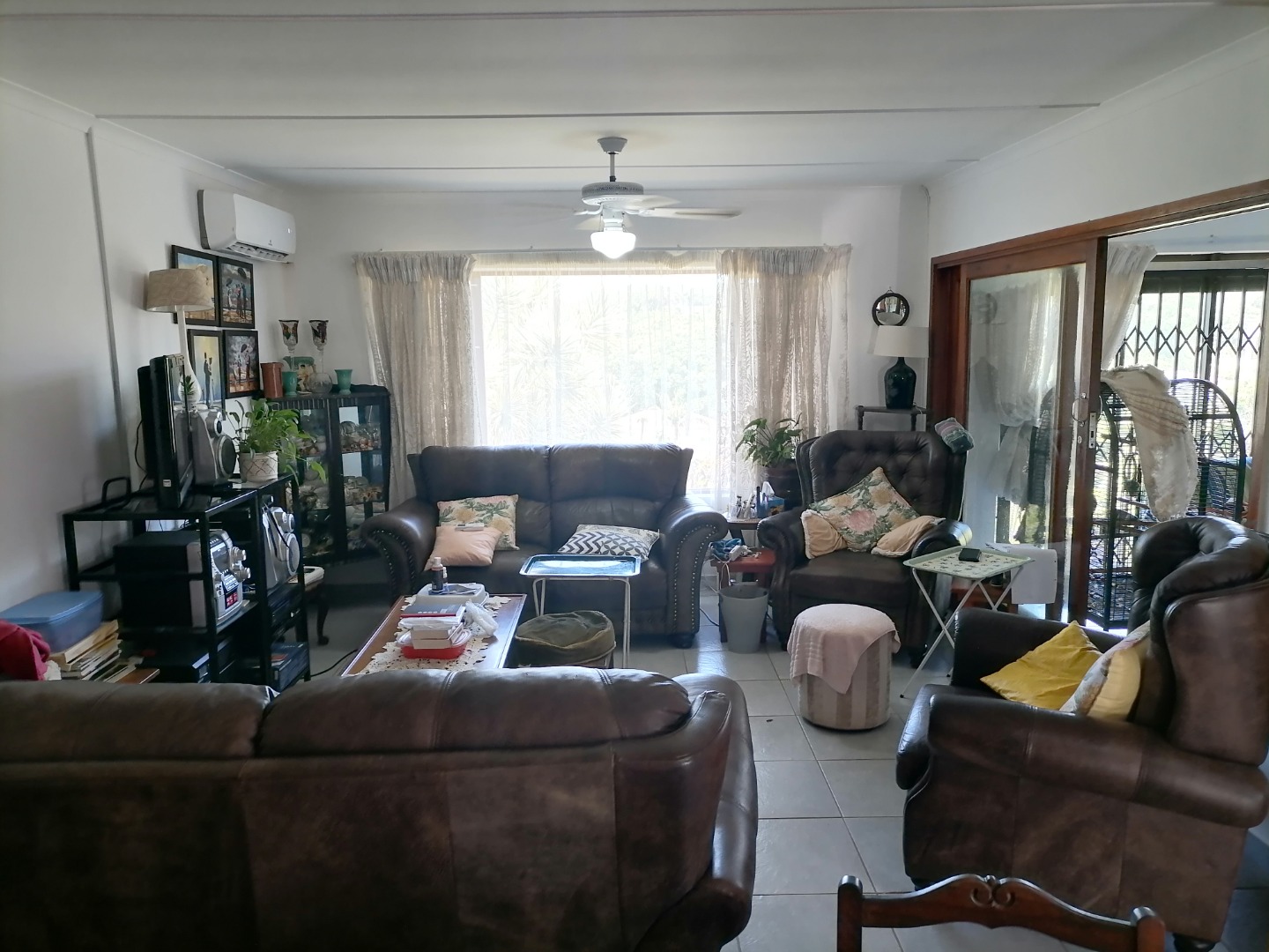 Step inside to discover a comfortable 145 sqm home featuring three well-proportioned bedrooms and two bathrooms, including one ensuite for added privacy. The interior comprises a dedicated lounge, a dining room, and a functional kitchen, providing ample space for daily living. Large windows and glass doors invite abundant natural light, creating a bright and inviting atmosphere throughout the main living areas. Air conditioning units are present, ensuring comfort during warmer months.