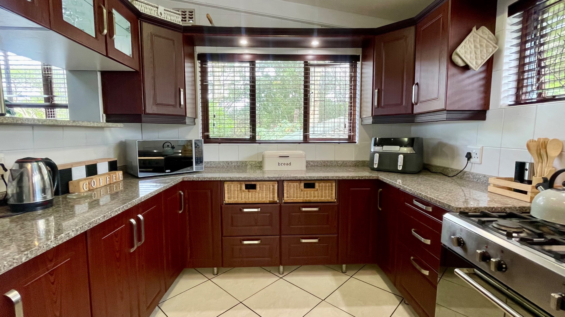 The interior boasts spacious, open-plan living and dining areas, characterized by high vaulted ceilings with exposed beams and abundant natural light streaming through large windows and glass doors. Tiled flooring extends throughout, ensuring durability and easy maintenance. The functional kitchen features modern cabinetry, granite countertops and a gas stove. A dedicated laundry area and additional storage further enhance the home's practicality.