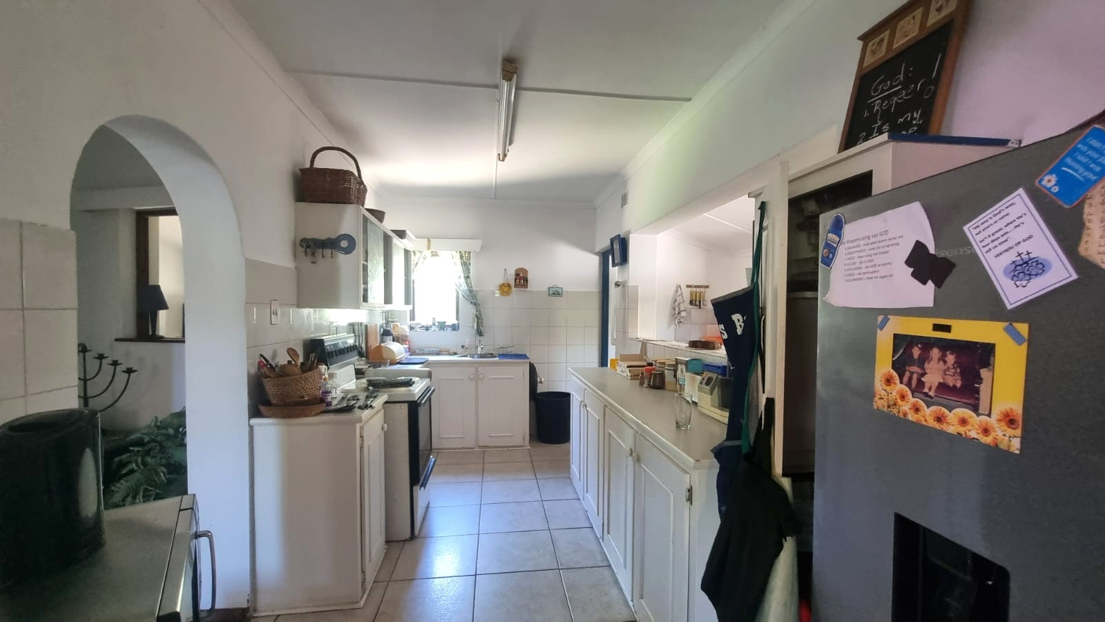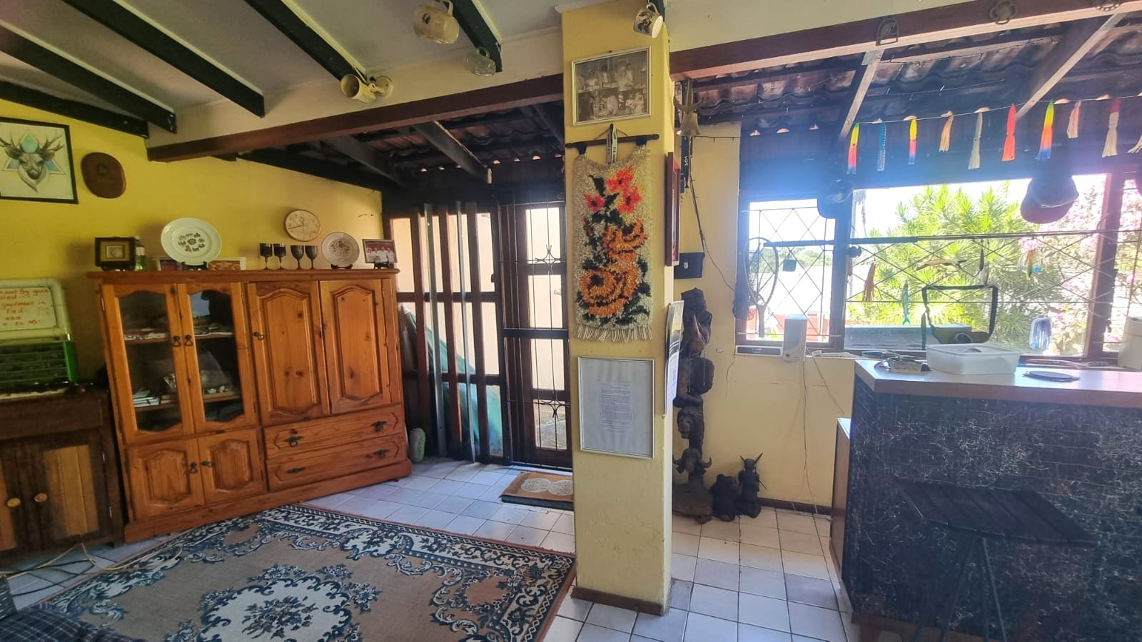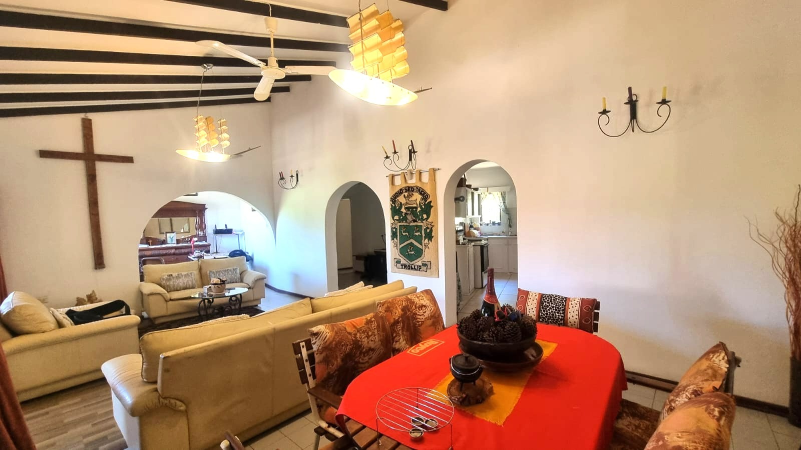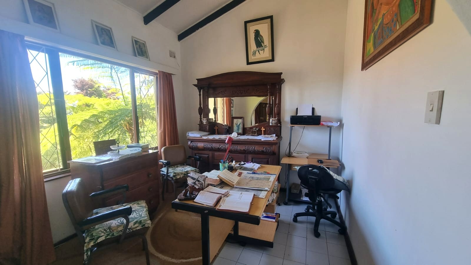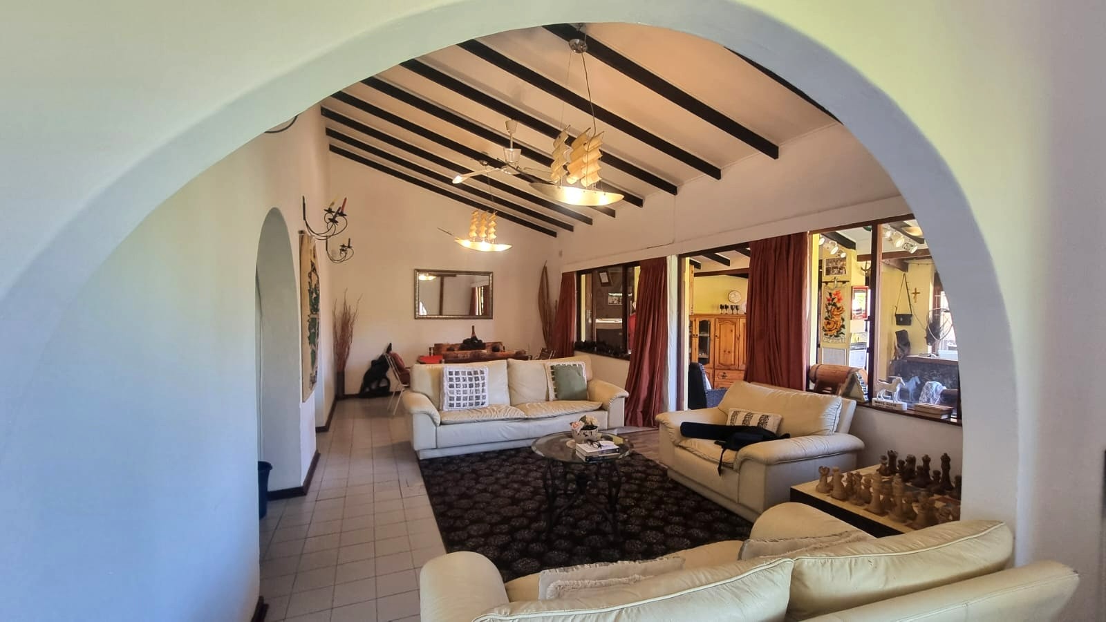 Step inside to find a spacious, open-plan living and dining area, characterized by distinctive exposed dark wooden ceiling beams and elegant arched doorways that create architectural interest and seamless flow. A dedicated study, brightened by a large window offering green outdoor views and featuring a vaulted ceiling, provides an ideal workspace. The functional kitchen boasts white cabinetry, tiled floors, and ample counter space complemented by a convenient scullery.