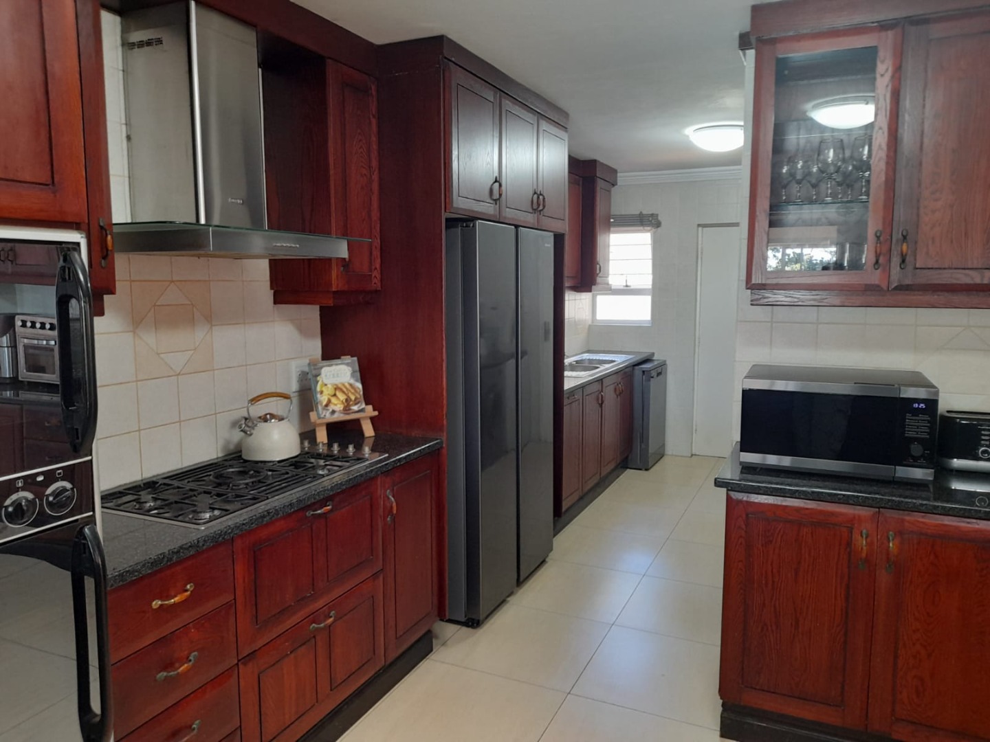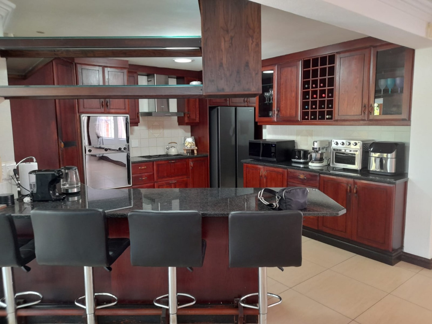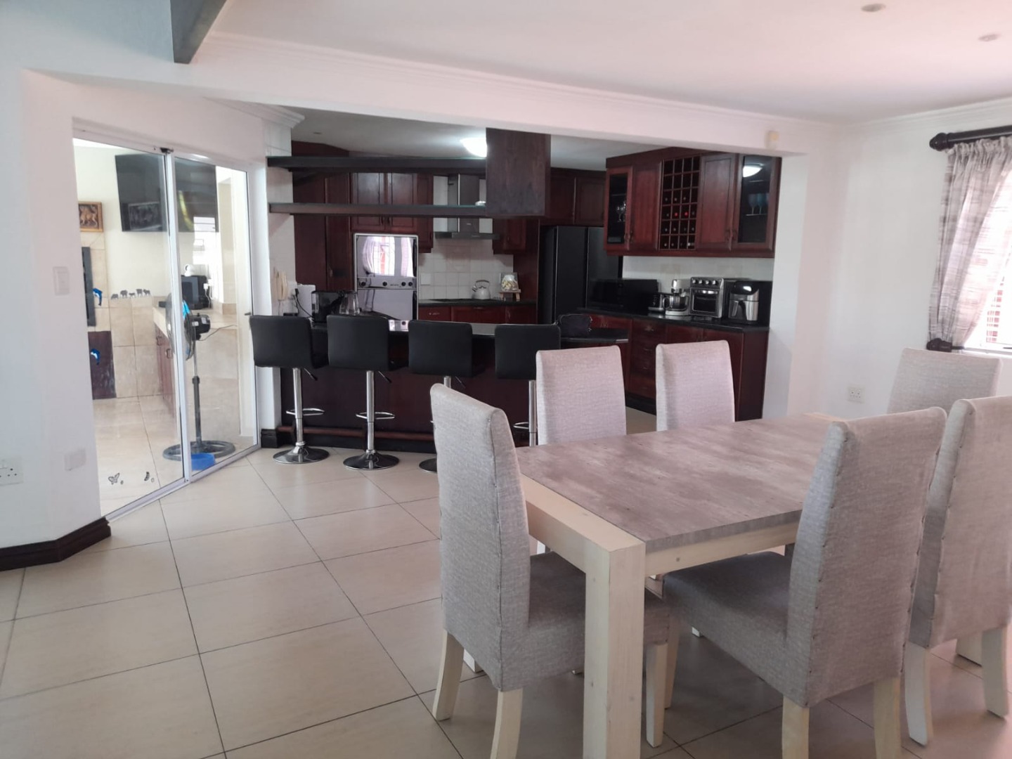 Inside, the open-plan layout seamlessly connects the living spaces. The modern kitchen is a highlight, equipped with extensive dark wood cabinetry, durable granite countertops, and a functional island with bar seating. Adjacent to the kitchen is a dedicated dining area, flowing into a comfortable lounge and a family TV room. An indoor entertainment area, complete with a built-in braai and large sliding glass doors, offers an ideal space for gatherings.