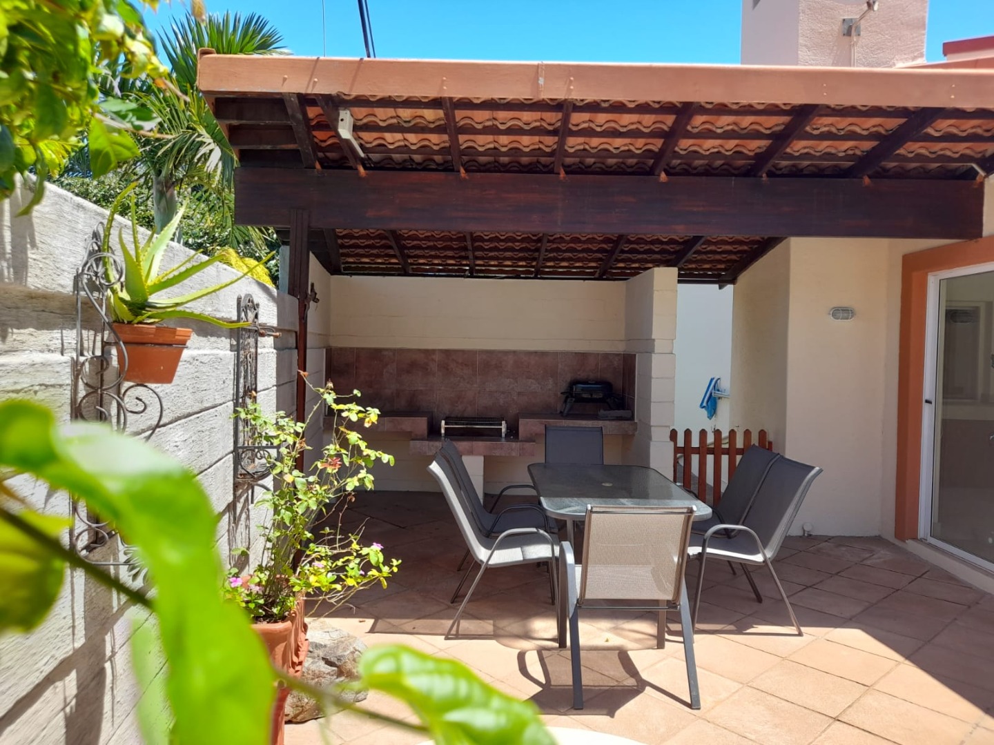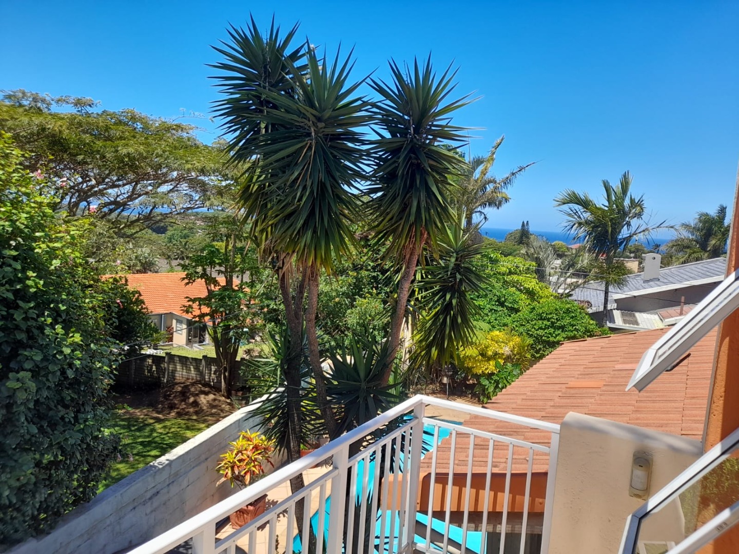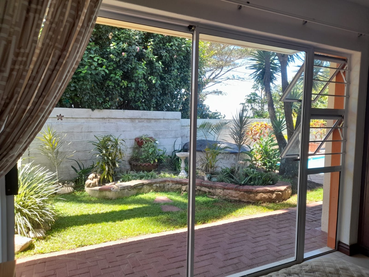 Step outside to a sparkling blue swimming pool, surrounded by tropical landscaping, perfect for relaxation and outdoor enjoyment. The property is pet-friendly and secured with a fence and access gate, forming part of a security complex, ensuring peace of mind.