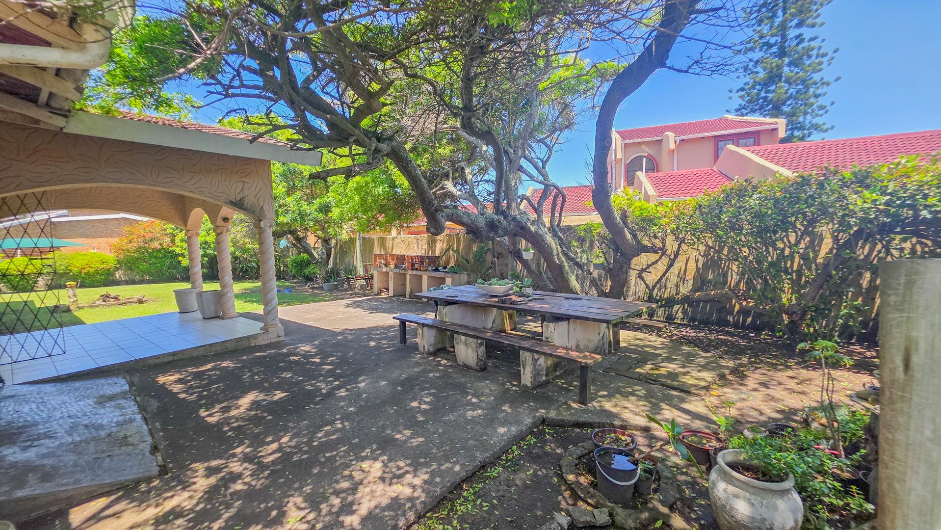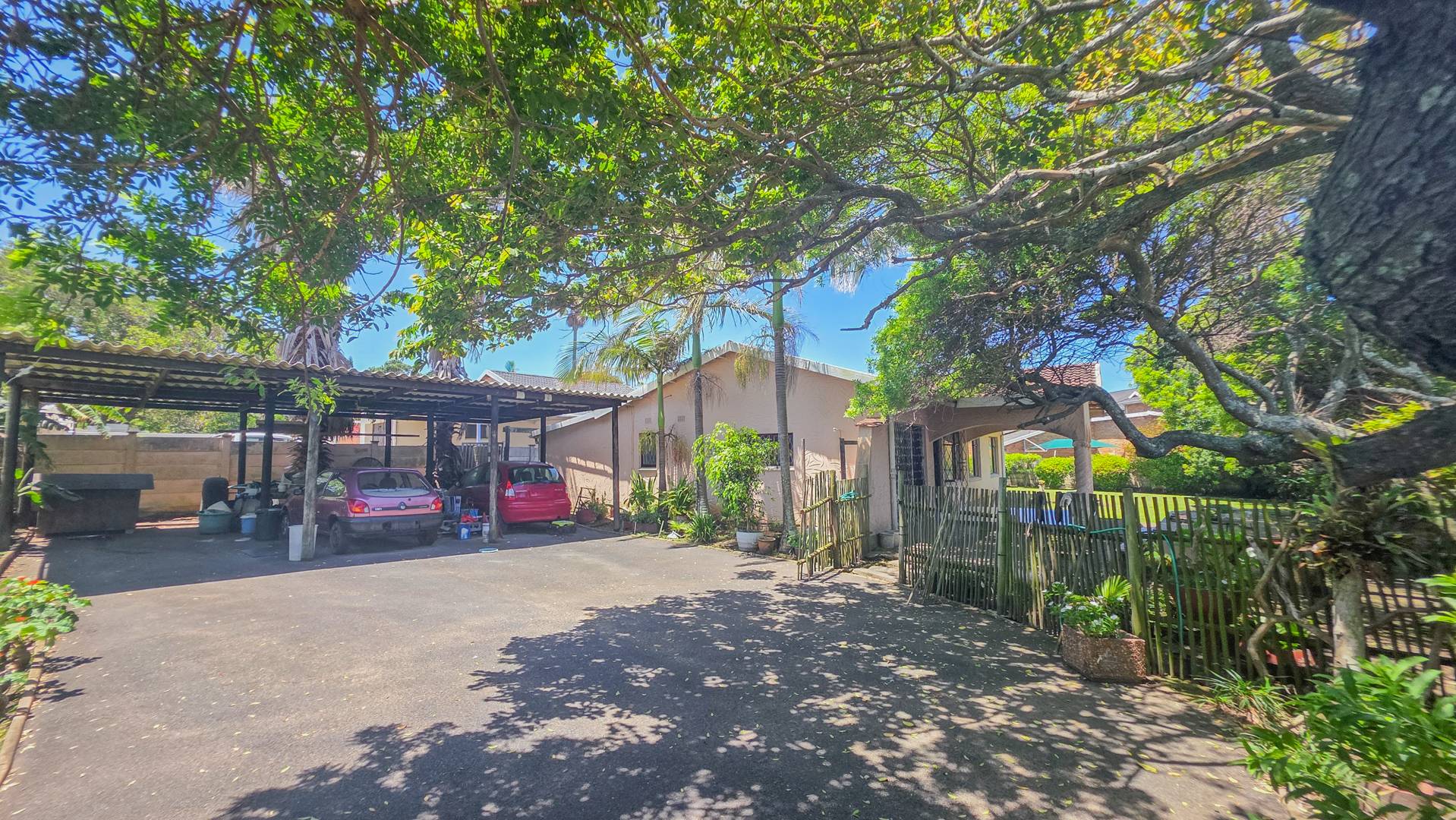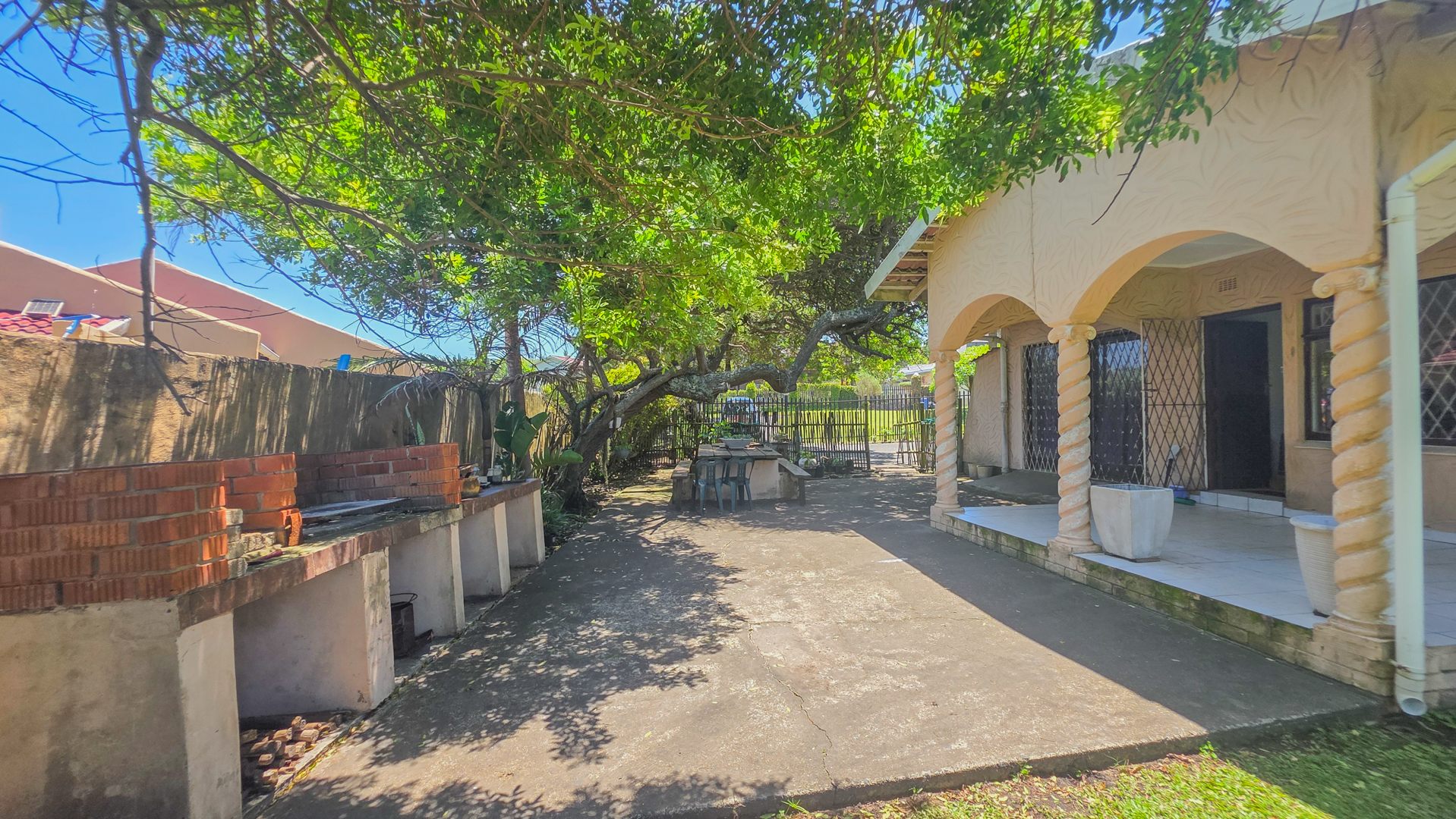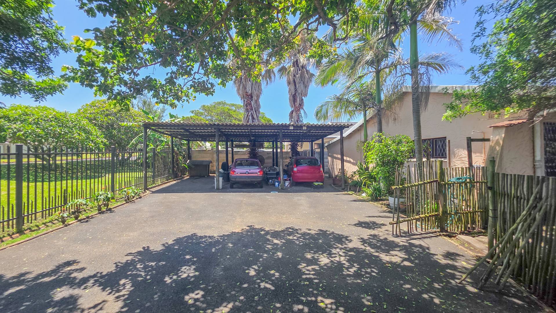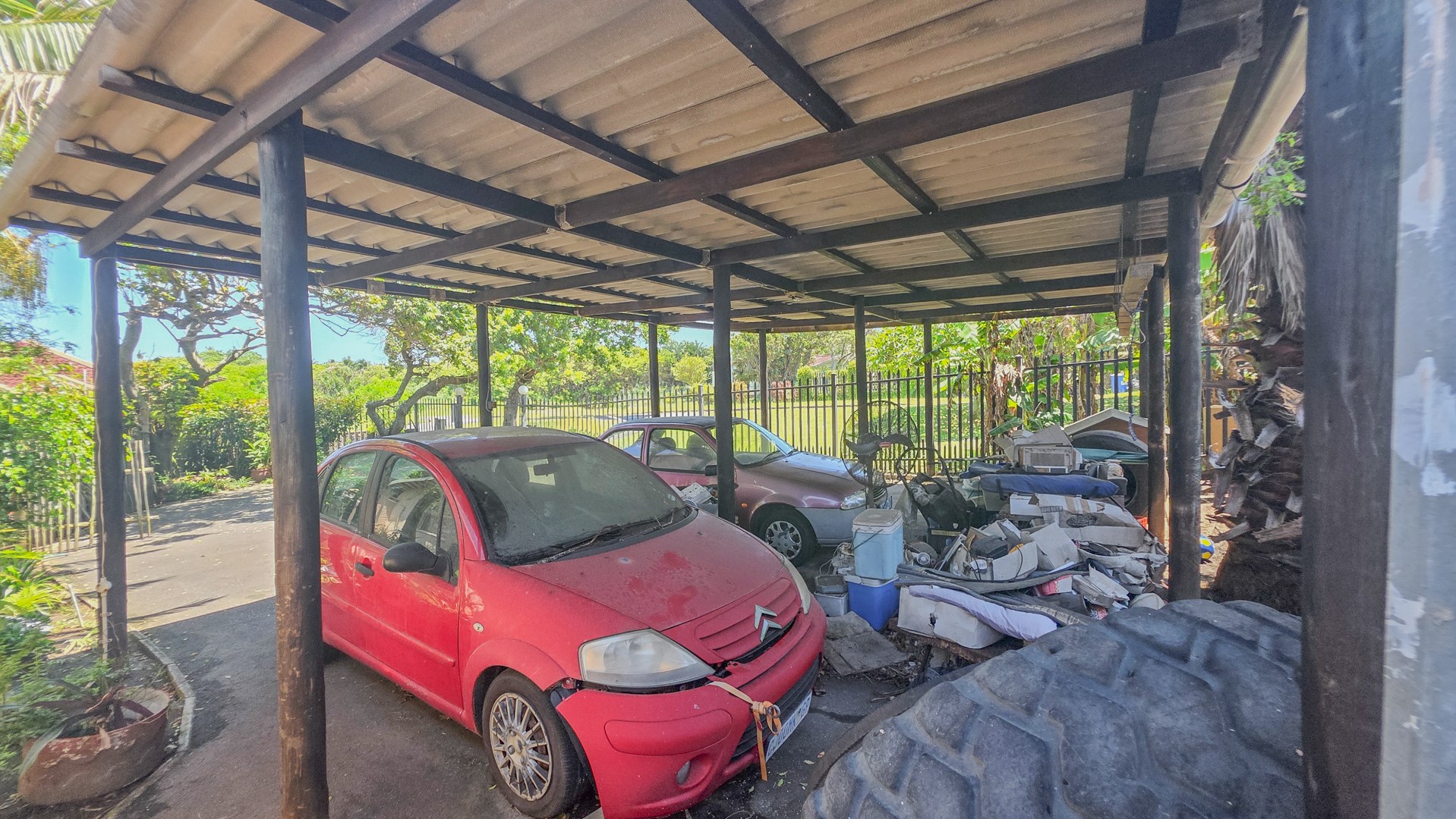 The kitchen includes a serving hatch and loose stove, flowing into a tiled lounge with a ceiling fan. The lounge opens onto a patio that sits alongside a large garden, offering ample space for outdoor living, entertaining, or simply enjoying the South Coast sunshine. Additional features include a built-in braai, laundry, and a carport with space for up to three vehicles.
