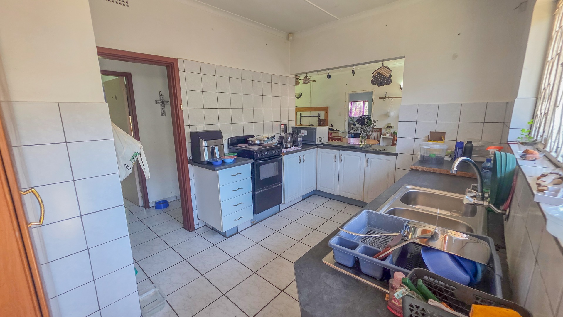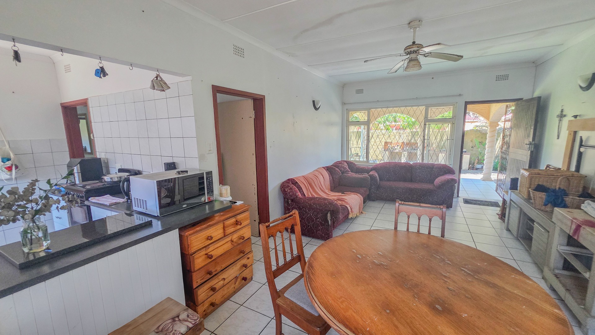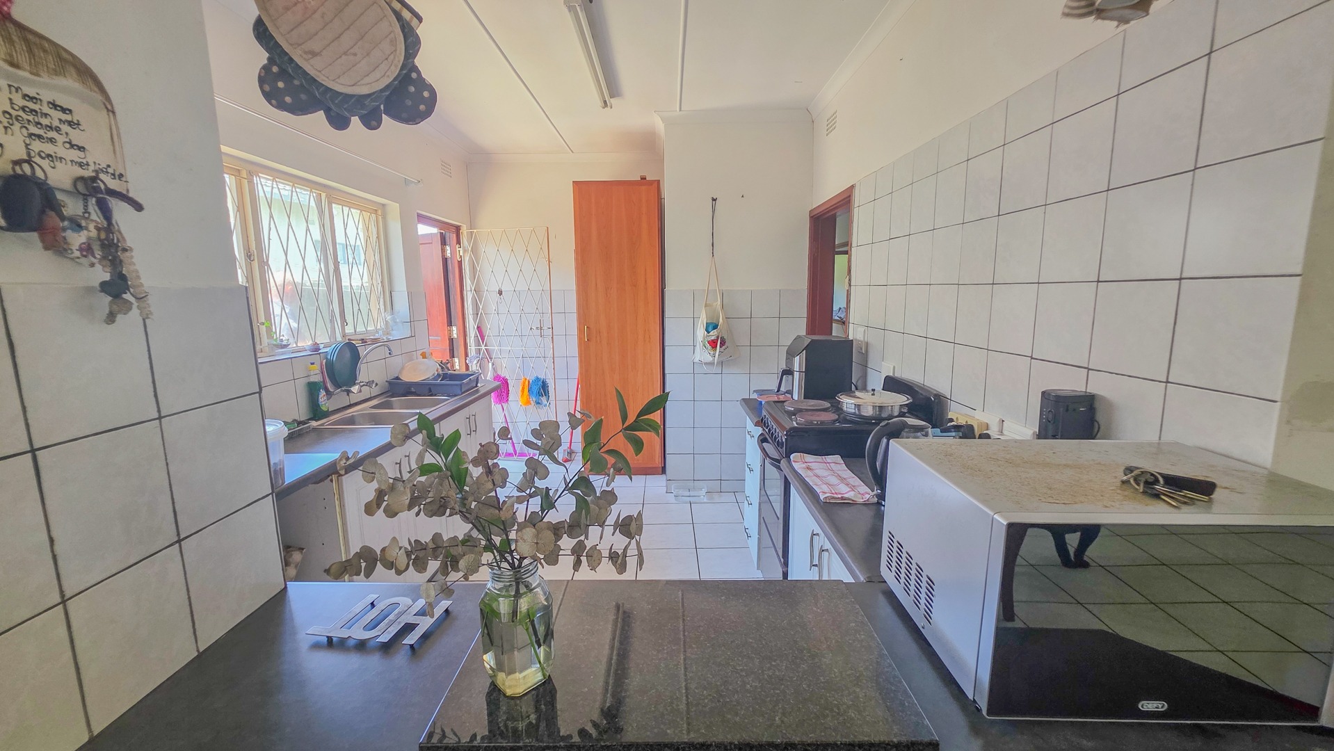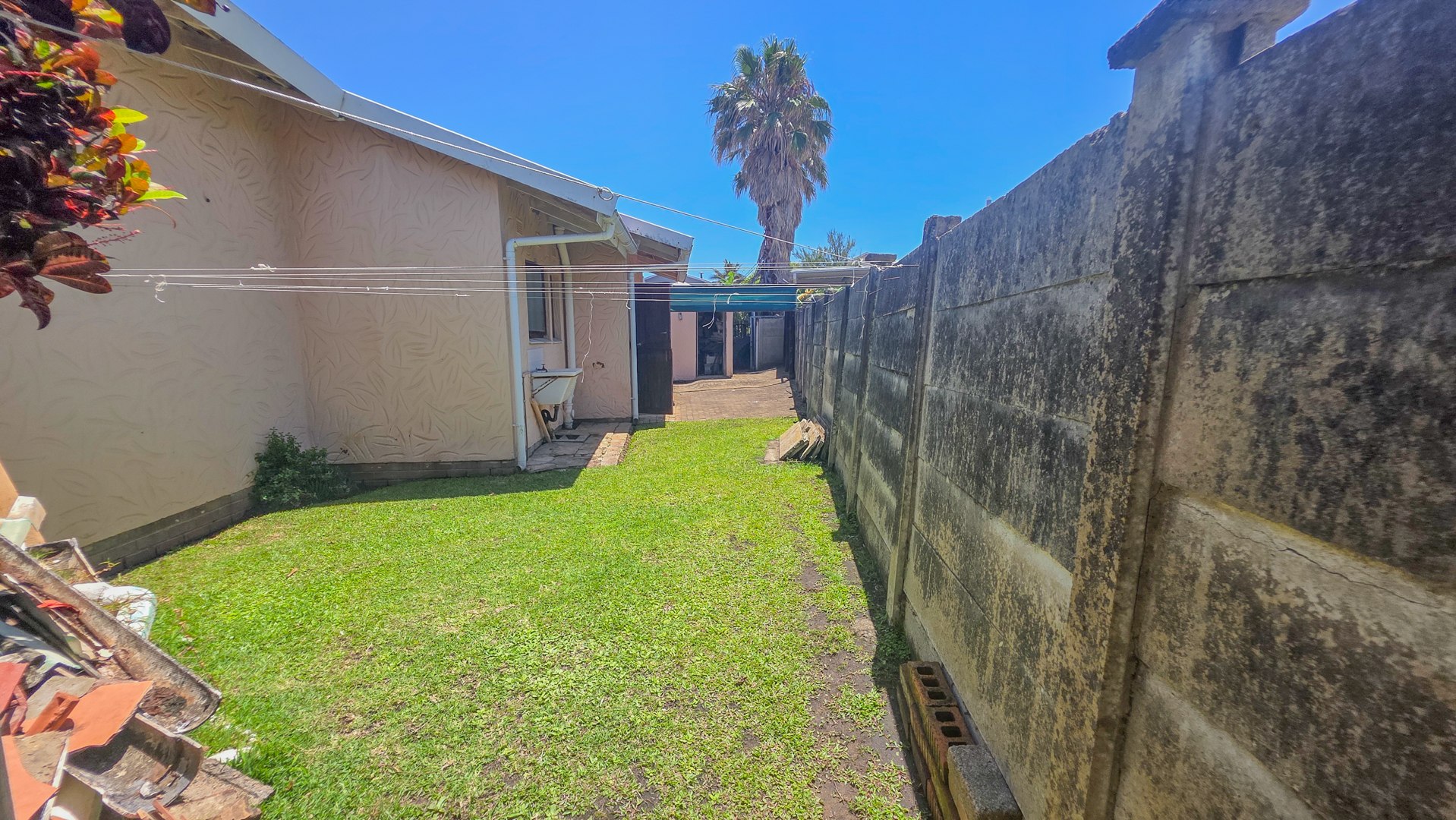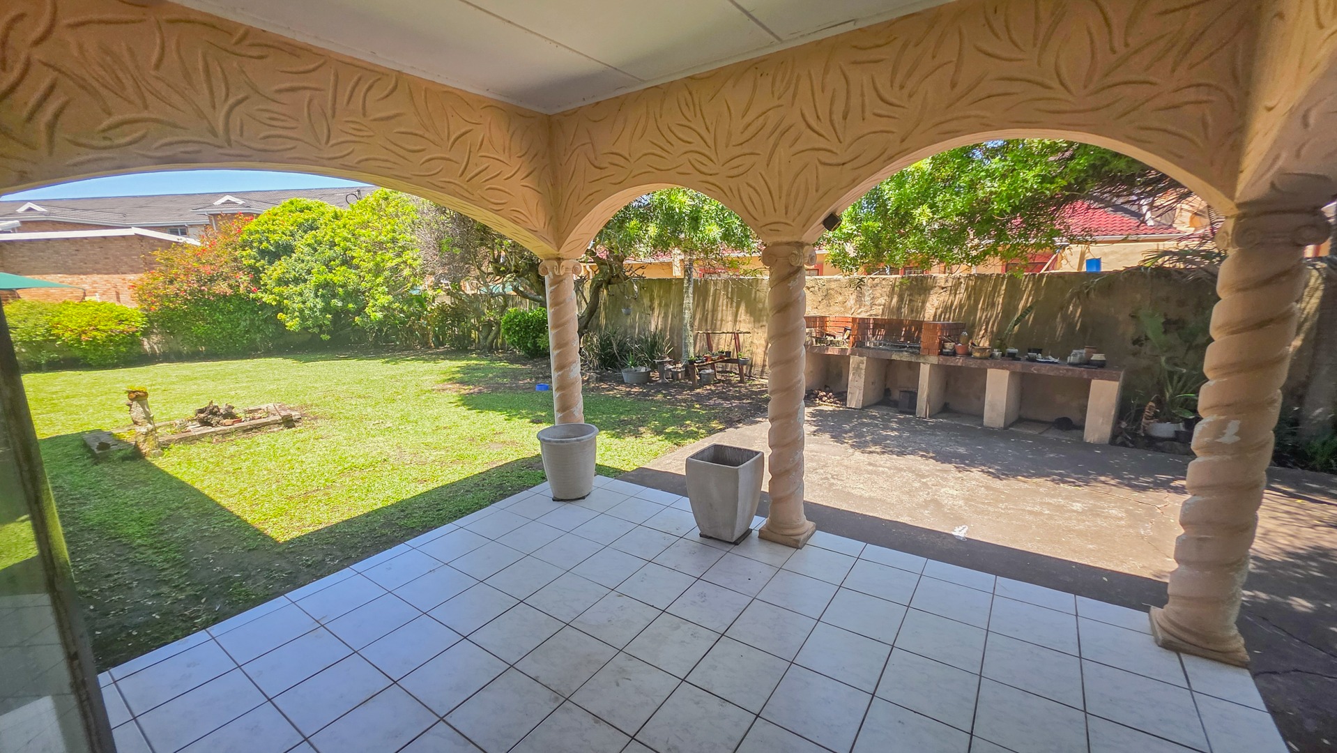 The kitchen includes a serving hatch and loose stove, flowing into a tiled lounge with a ceiling fan. The lounge opens onto a patio that sits alongside a large garden, offering ample space for outdoor living, entertaining, or simply enjoying the South Coast sunshine. Additional features include a built-in braai, laundry, and a carport with space for up to three vehicles.