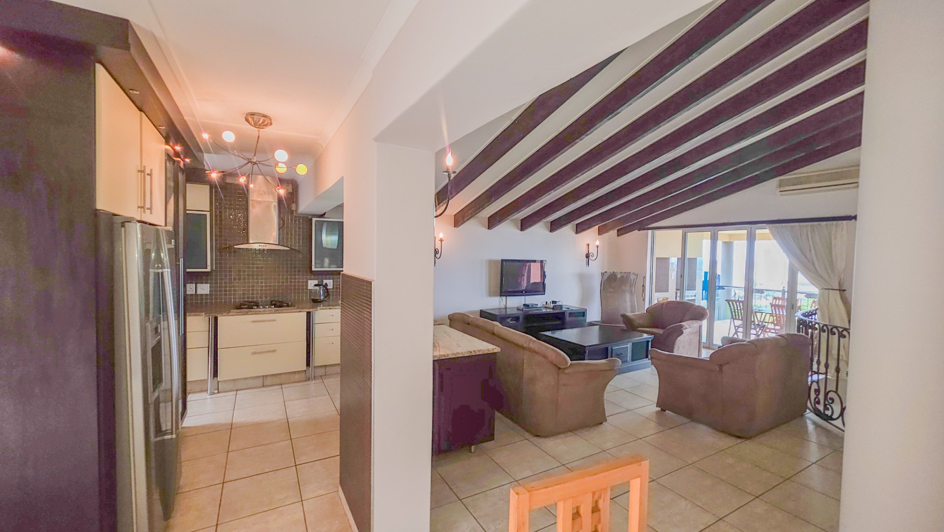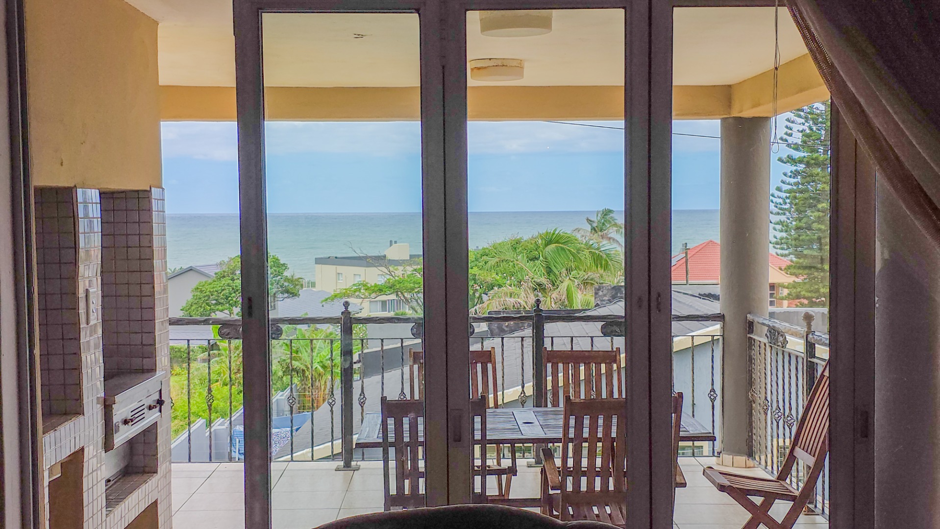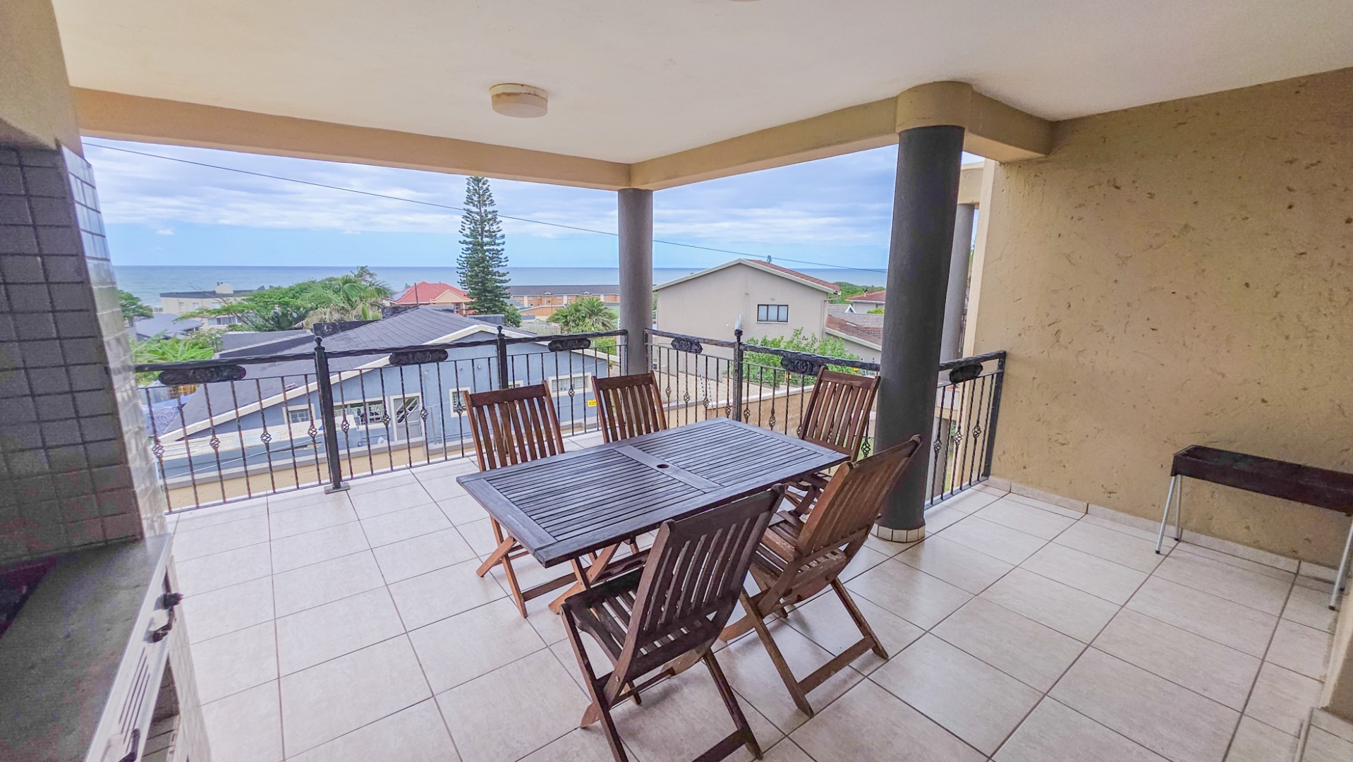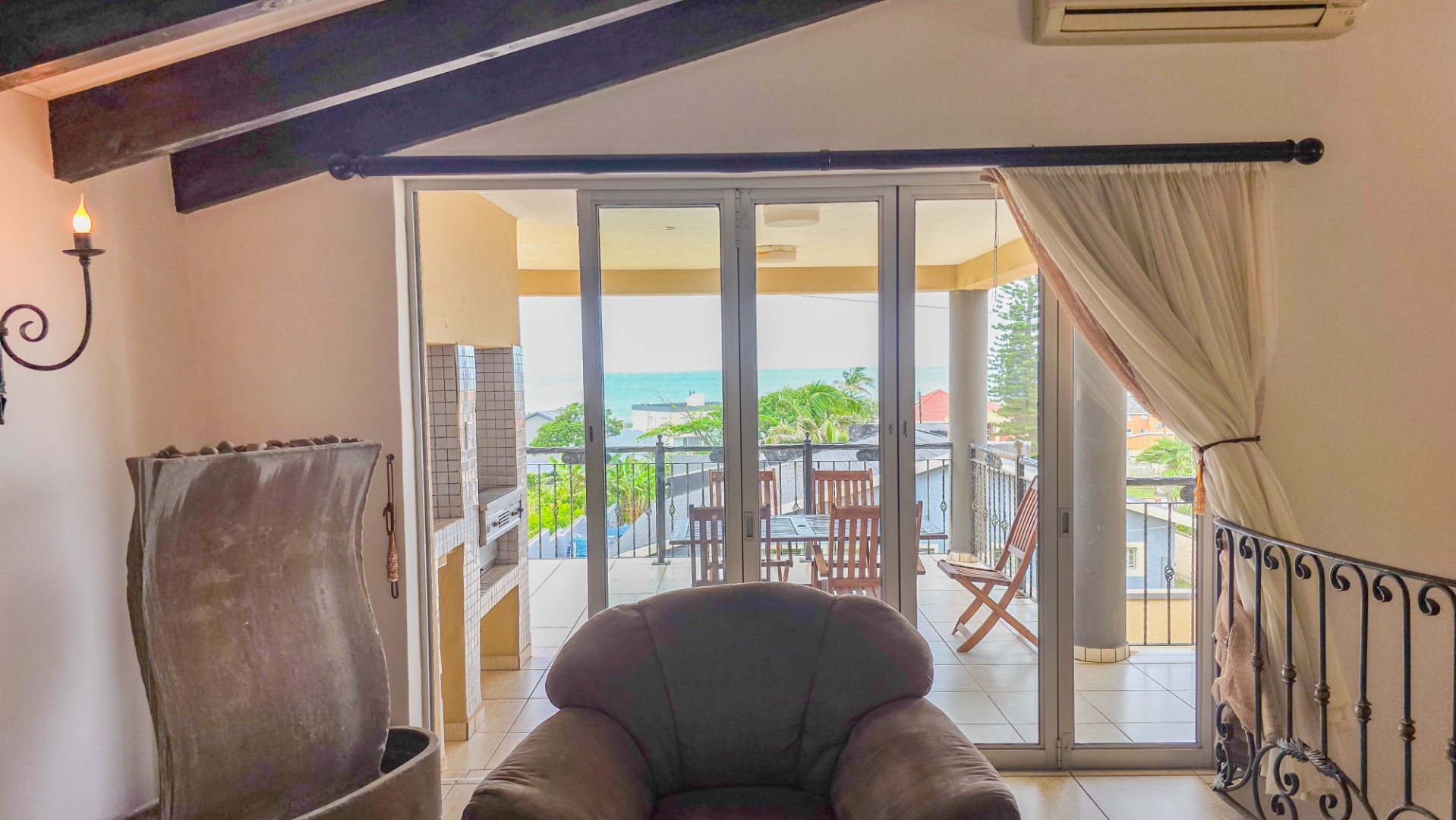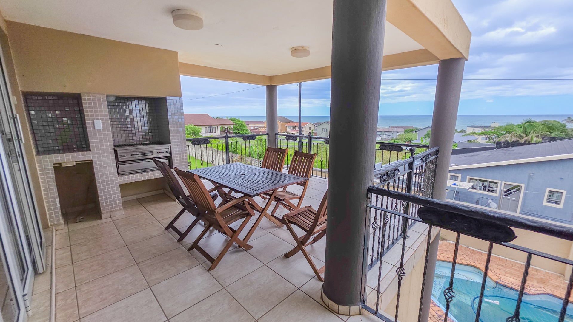 Upstairs, vaulted ceilings with exposed beams create volume and light throughout the open plan lounge and dining area. Large openings lead onto a sea facing balcony with a built in gas braai, overlooking the sparkling pool and garden below. The granite kitchen anchors the space with integrated appliances, a central island, ample cabinetry, and a separate scullery that keeps everything streamlined and functional.