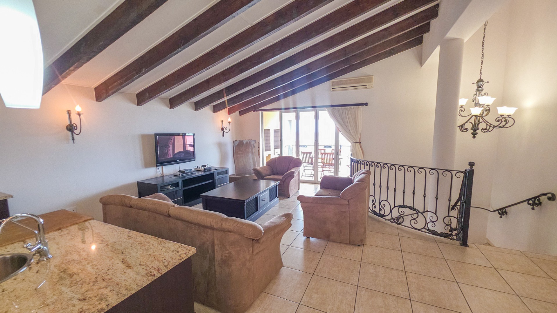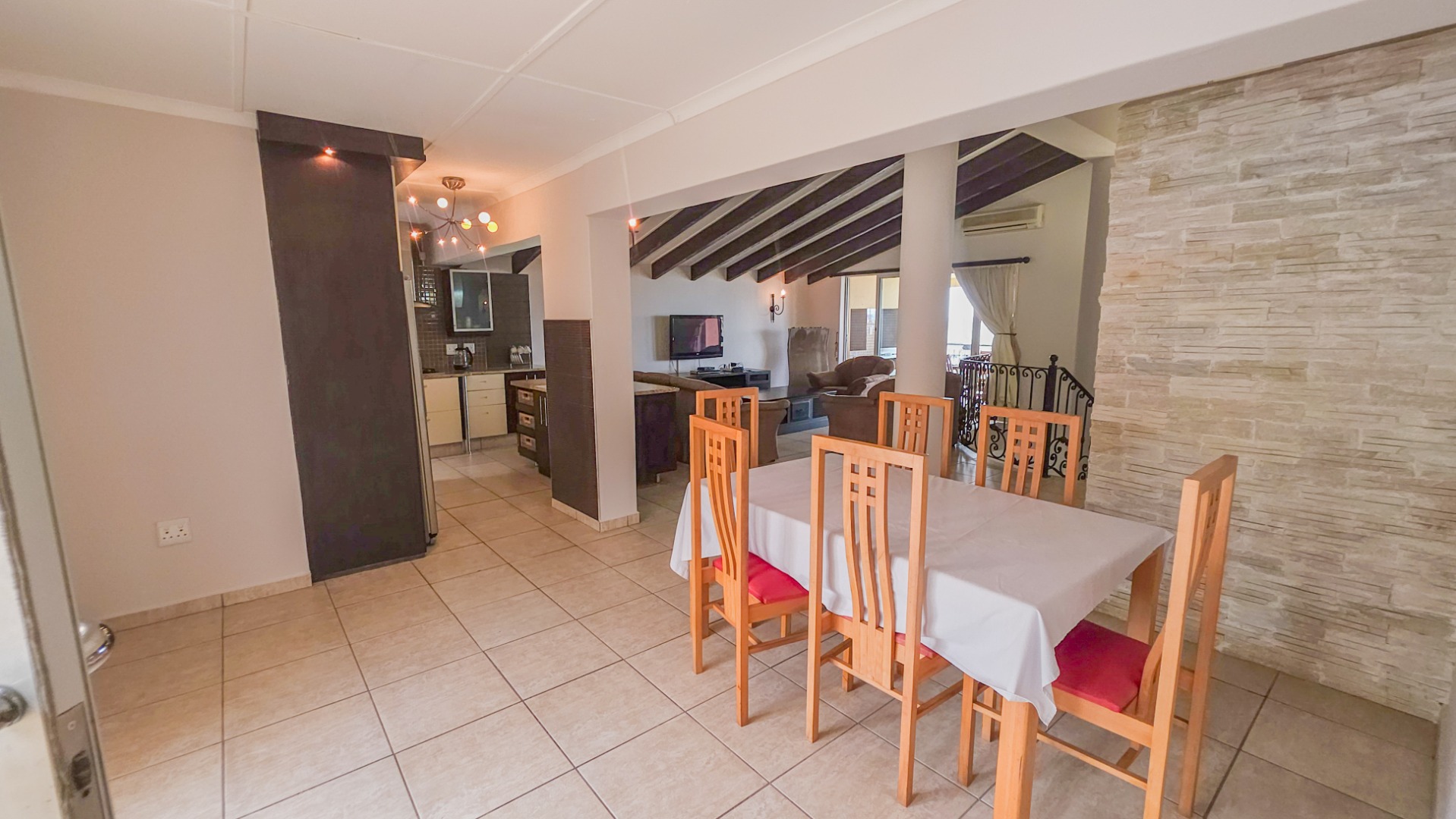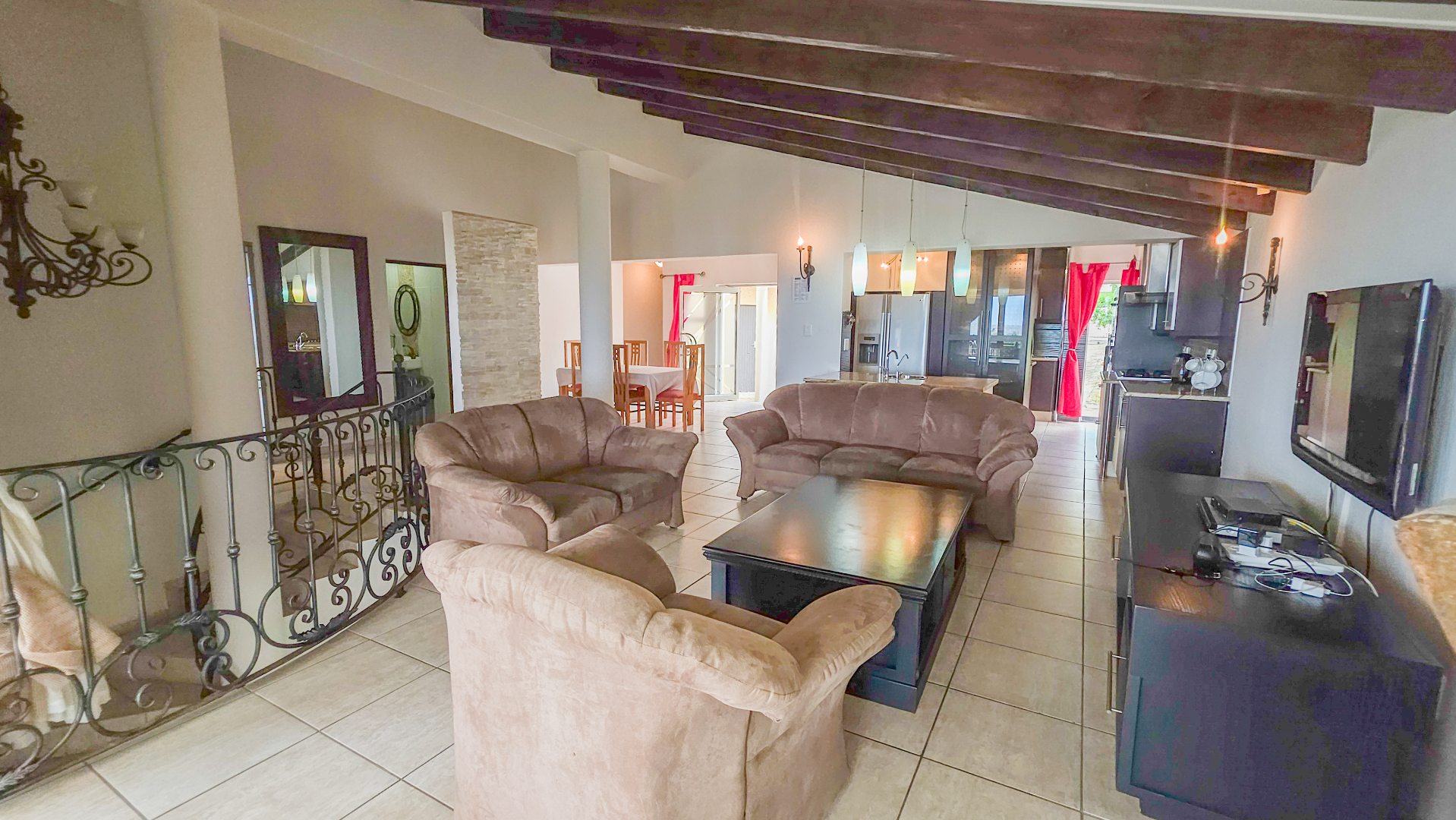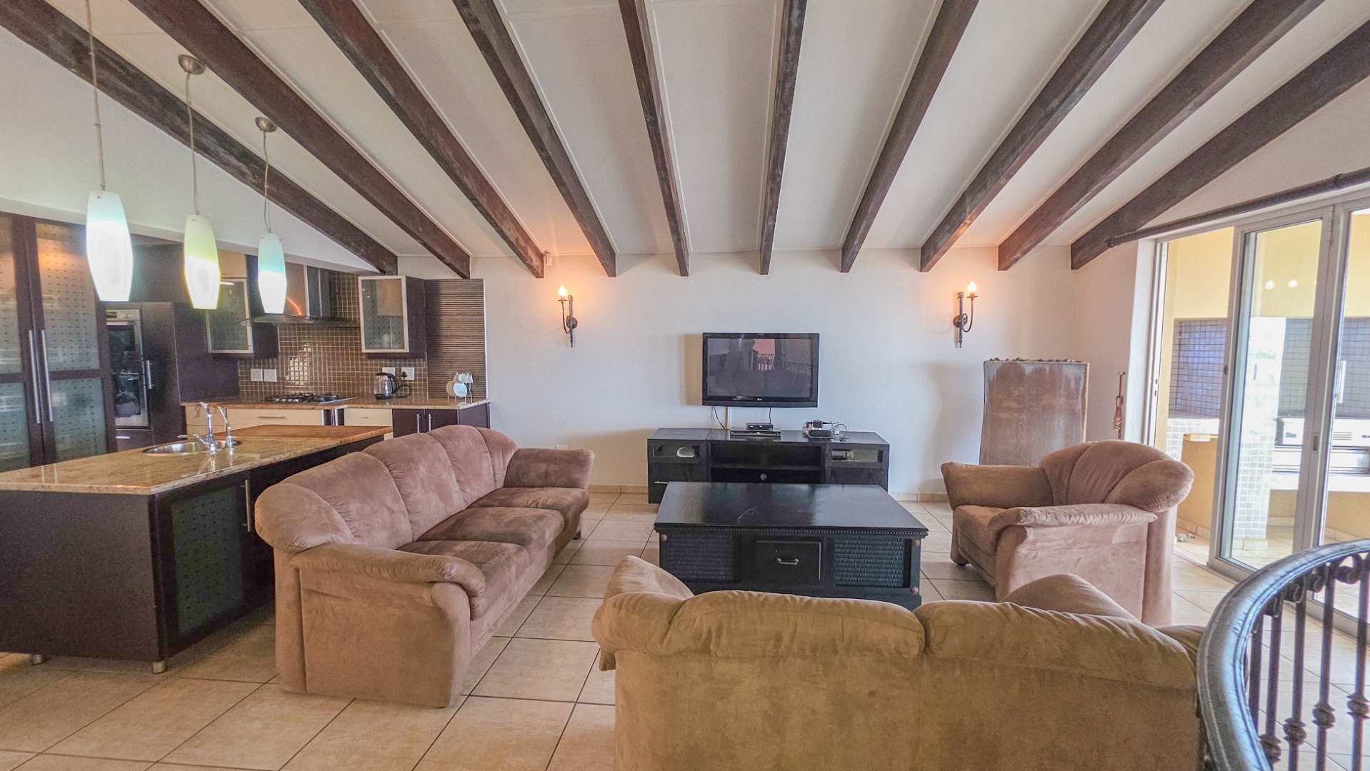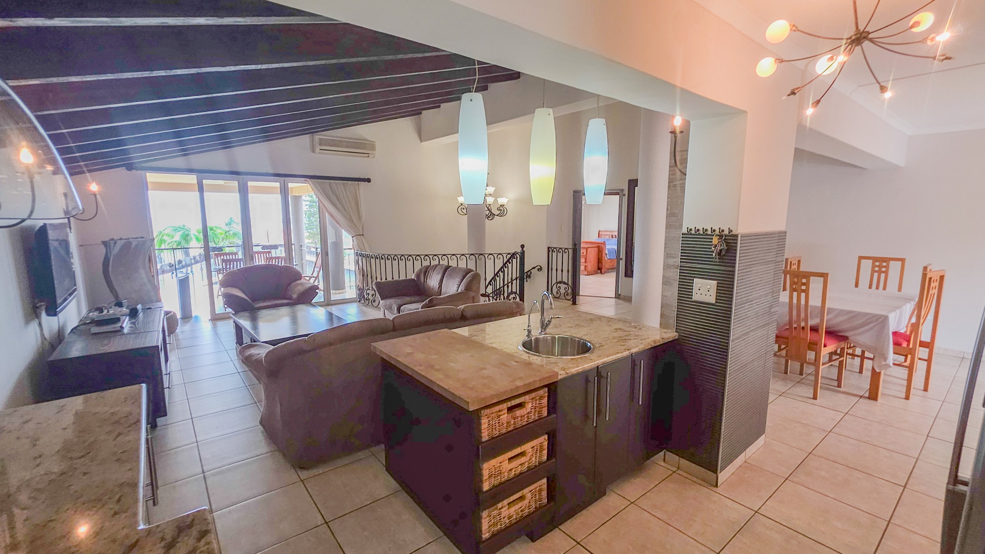 Upstairs, vaulted ceilings with exposed beams create volume and light throughout the open plan lounge and dining area. Large openings lead onto a sea facing balcony with a built in gas braai, overlooking the sparkling pool and garden below. The granite kitchen anchors the space with integrated appliances, a central island, ample cabinetry, and a separate scullery that keeps everything streamlined and functional.