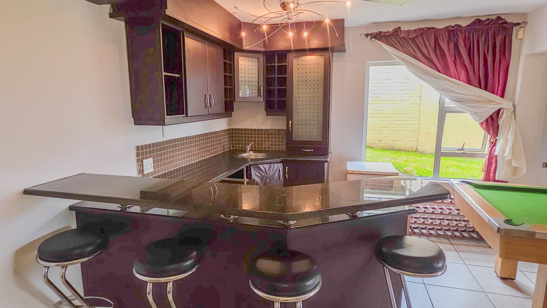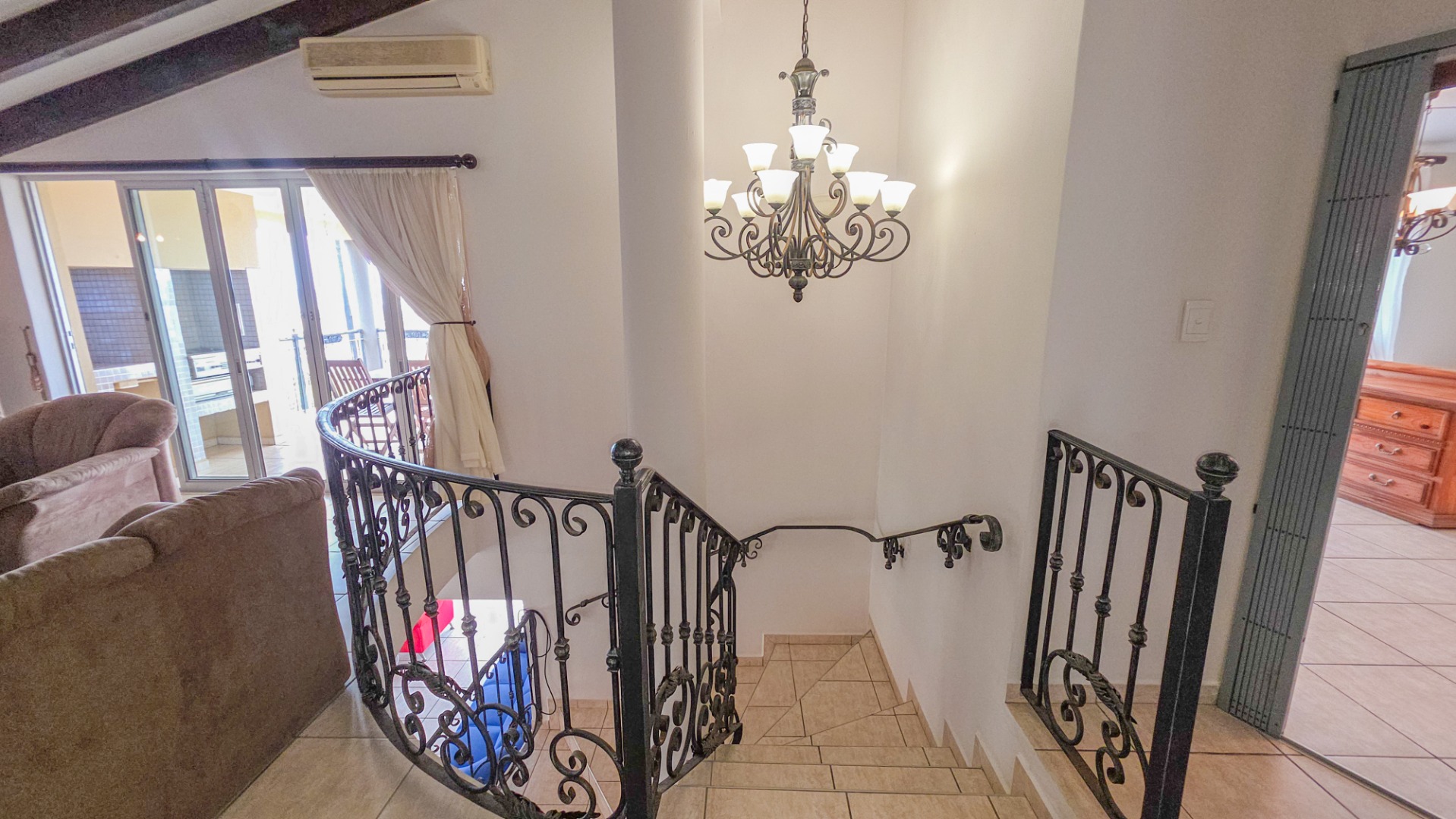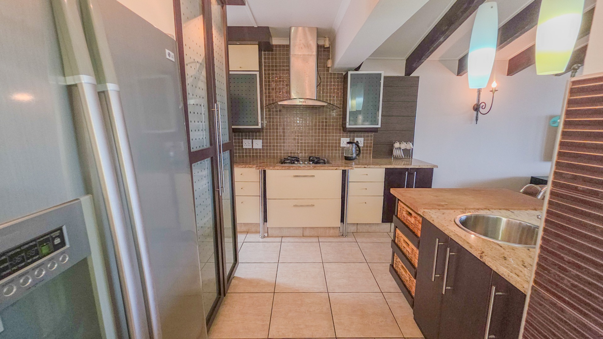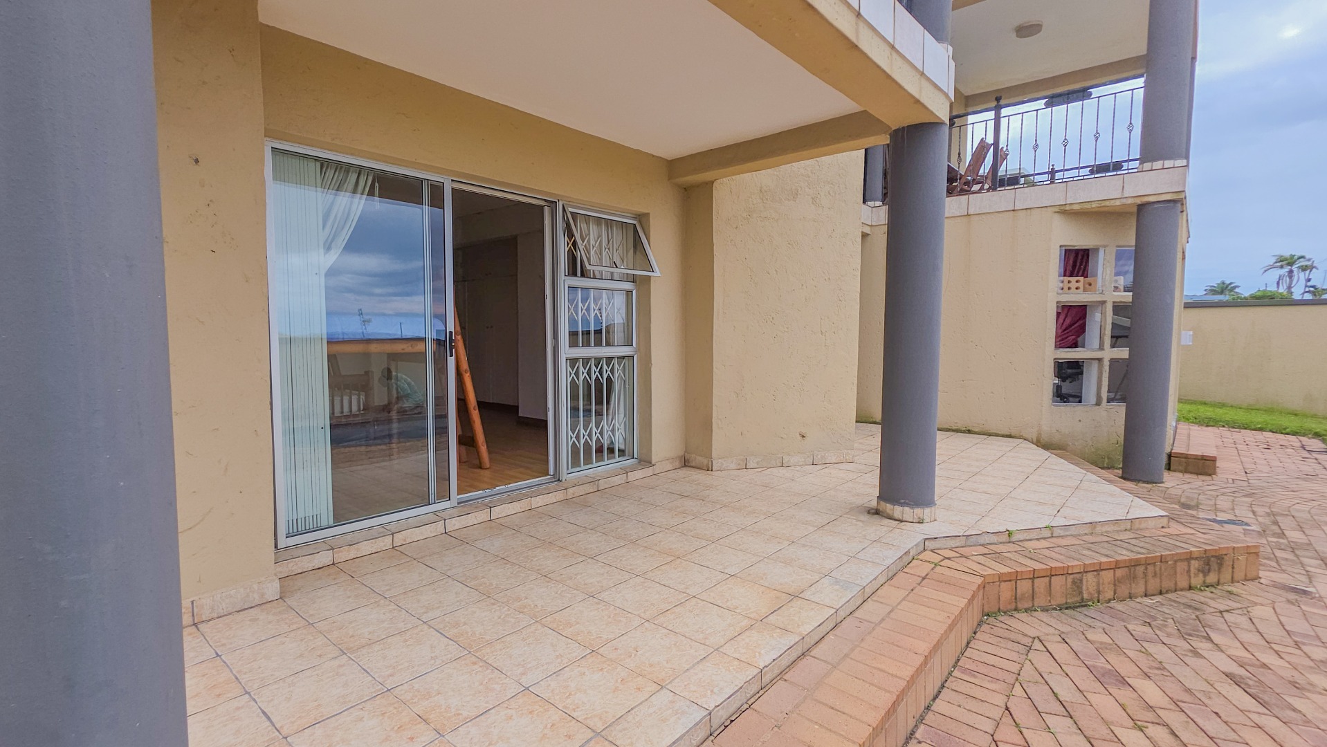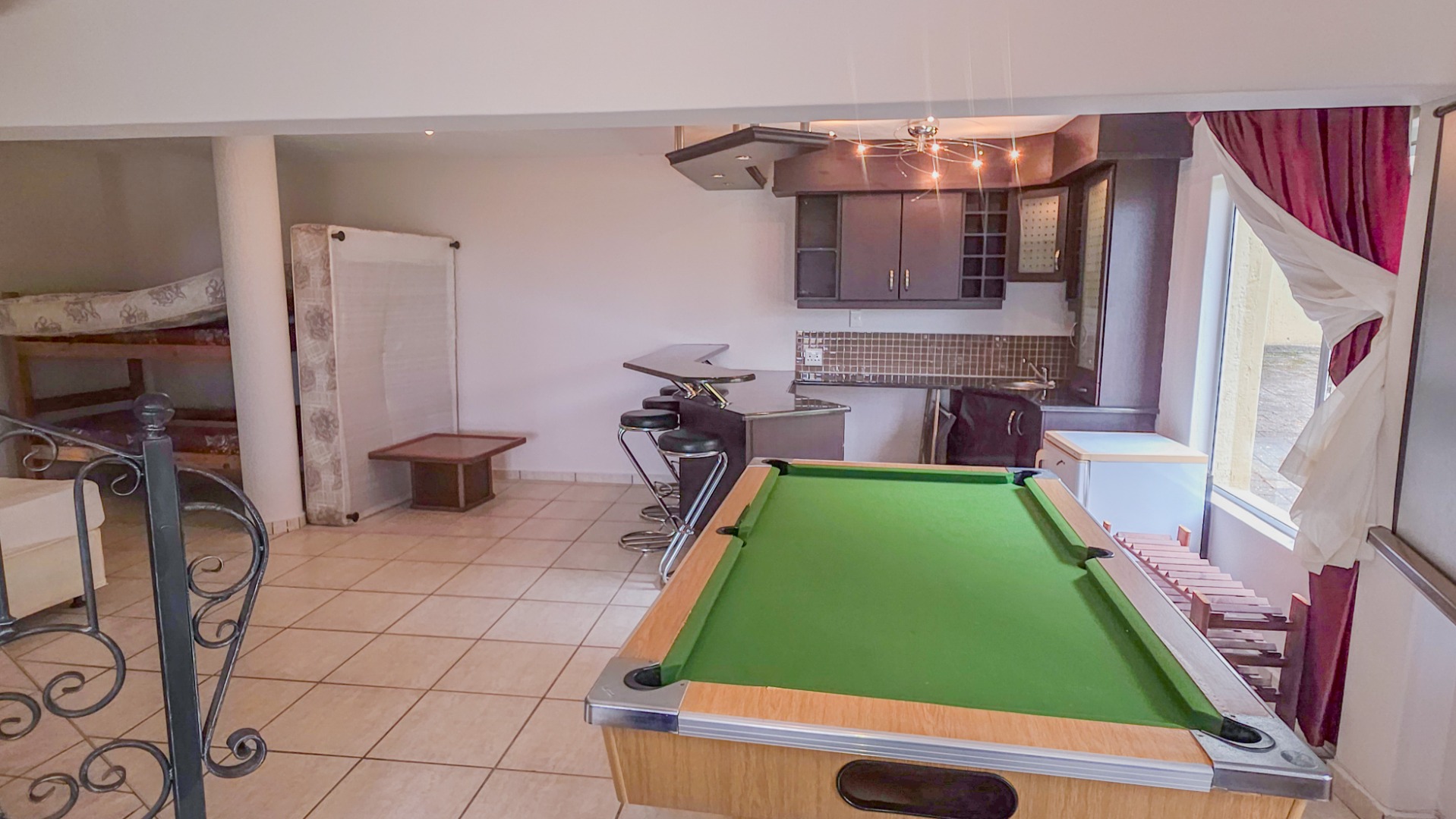 Upstairs, vaulted ceilings with exposed beams create volume and light throughout the open plan lounge and dining area. Large openings lead onto a sea facing balcony with a built in gas braai, overlooking the sparkling pool and garden below. The granite kitchen anchors the space with integrated appliances, a central island, ample cabinetry, and a separate scullery that keeps everything streamlined and functional.