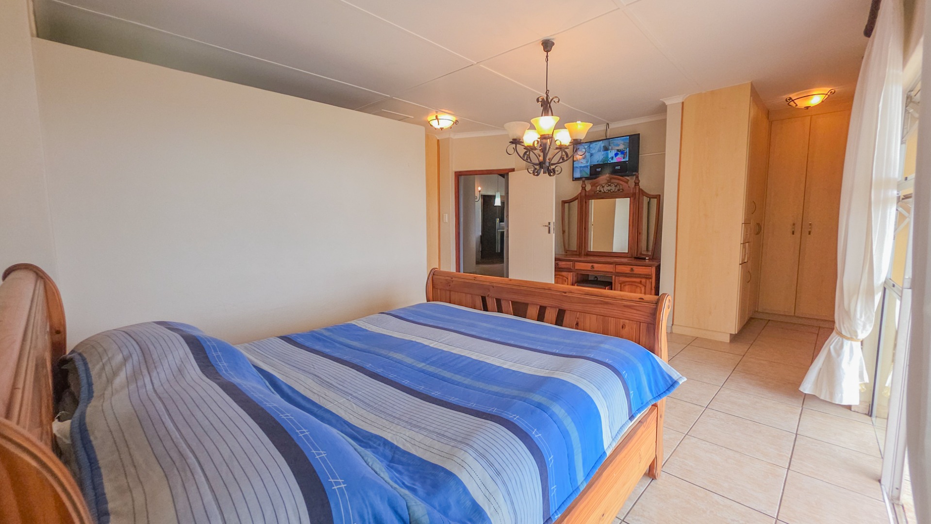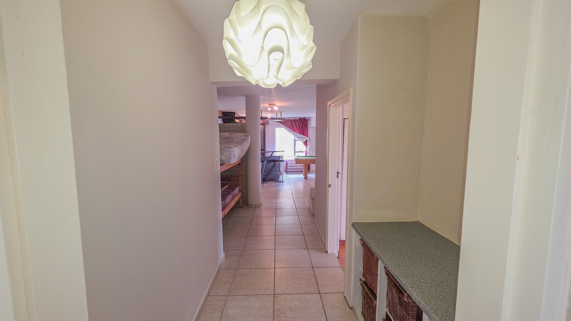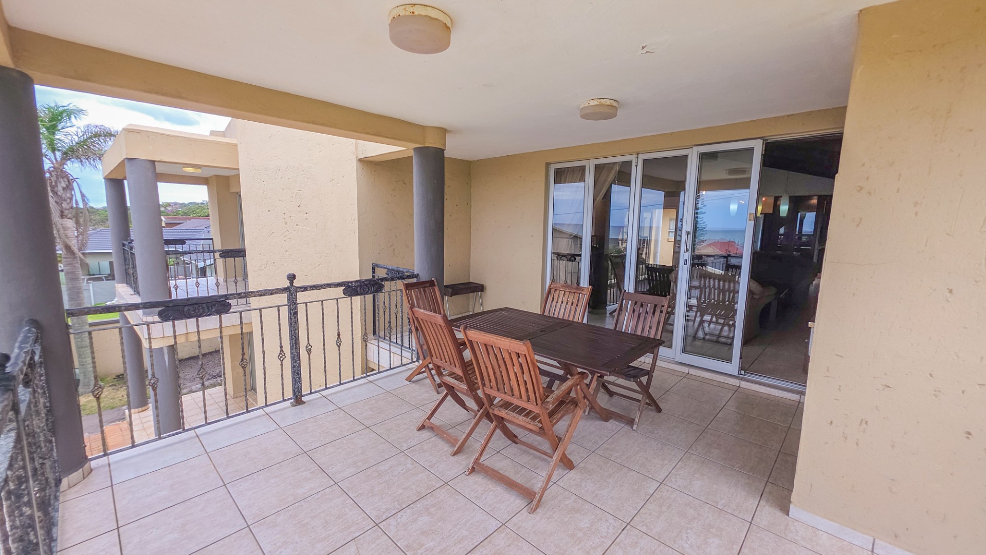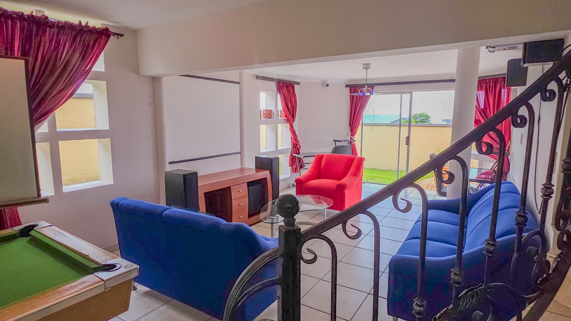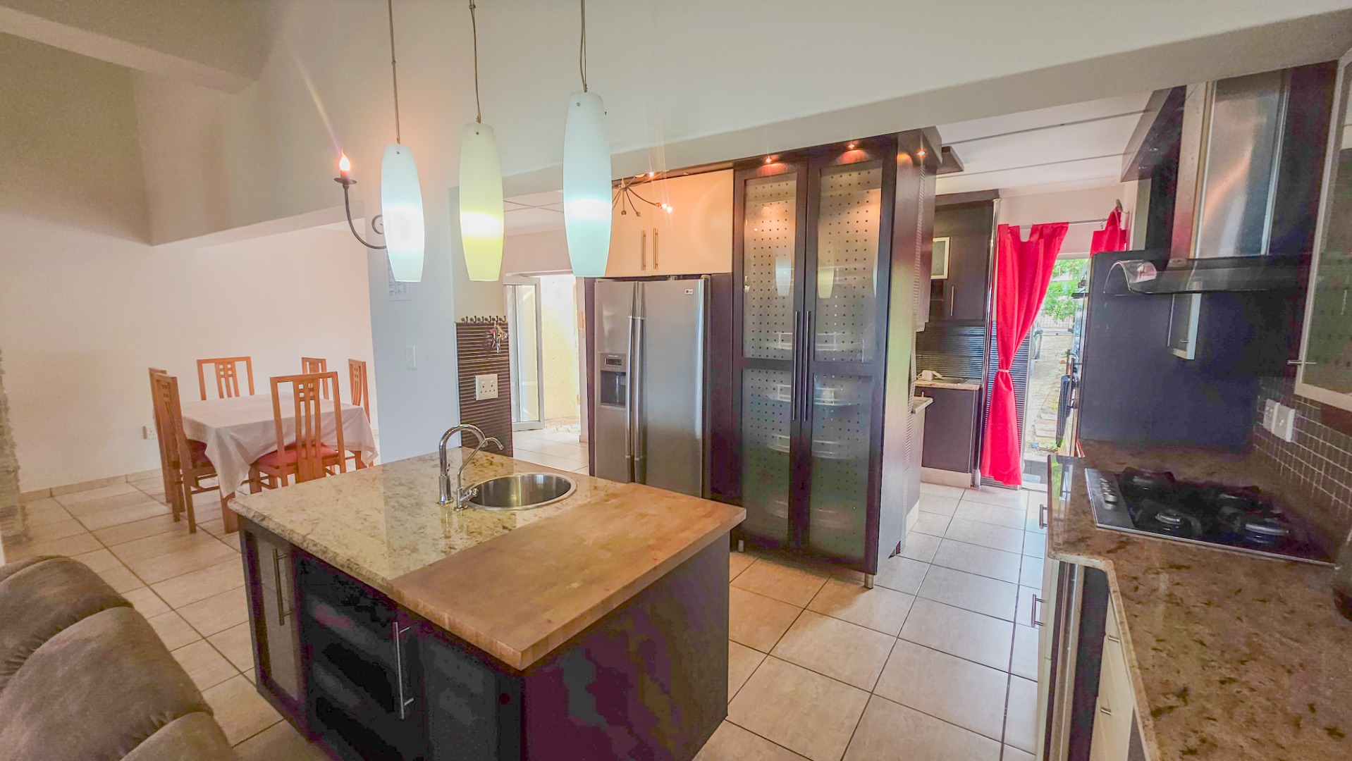 Upstairs, vaulted ceilings with exposed beams create volume and light throughout the open plan lounge and dining area. Large openings lead onto a sea facing balcony with a built in gas braai, overlooking the sparkling pool and garden below. The granite kitchen anchors the space with integrated appliances, a central island, ample cabinetry, and a separate scullery that keeps everything streamlined and functional.